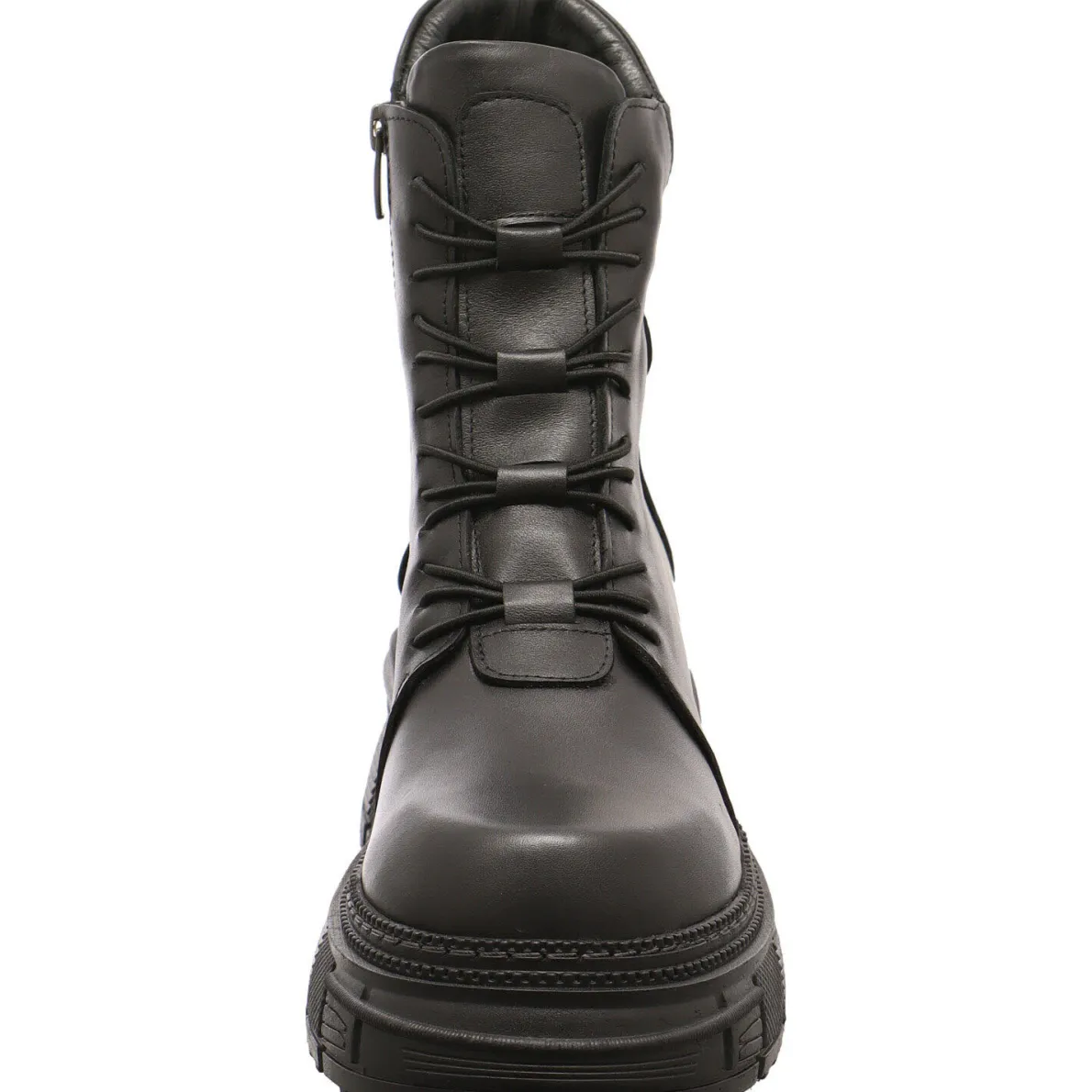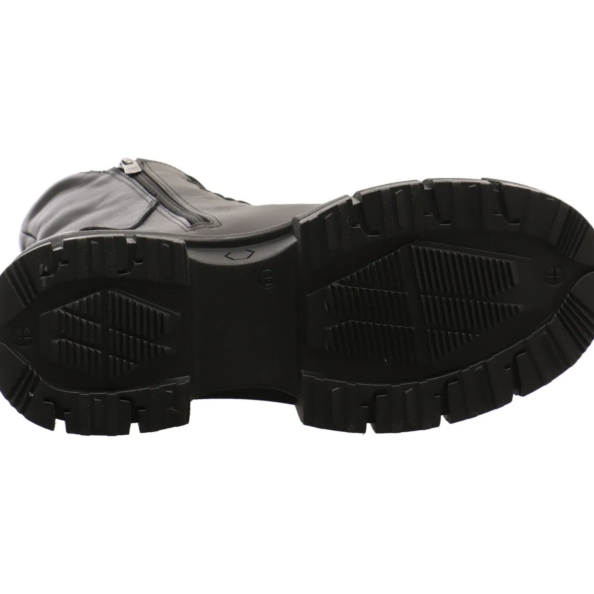 Hier wurde hochwertiges Echtleder in Schwarz verarbeitet. Besonders ins Auge fällte dabei die besondere Schnittführung vom Schaft und die angedeutete, elastische Schnürung. Schleife binden enfällt hier, jedoch ist der Einstieg besonders leicht, durch den seitlichen Reißverschluss.