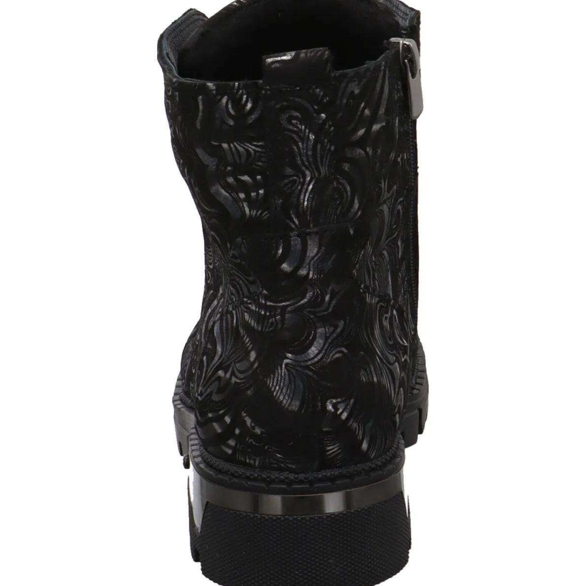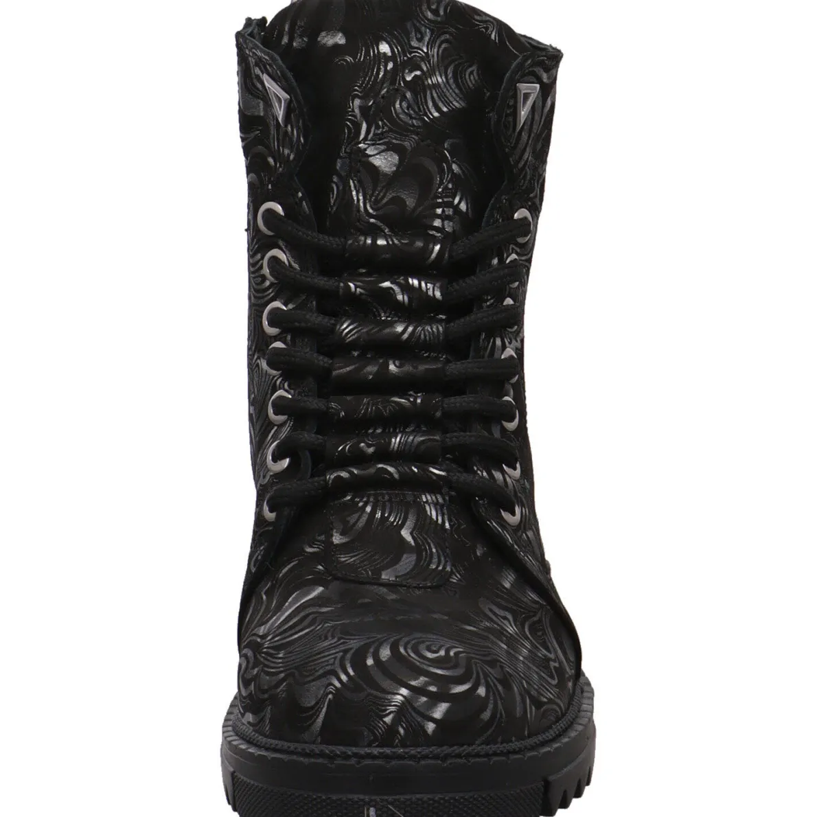 Das hochwertige Echtleder in Schwarz ist hier mit einem individuellen Muster in Silber verziert. Die markante Schnürung und der Metalleinsatz am Blockabsatz sind weitere Hingucker.