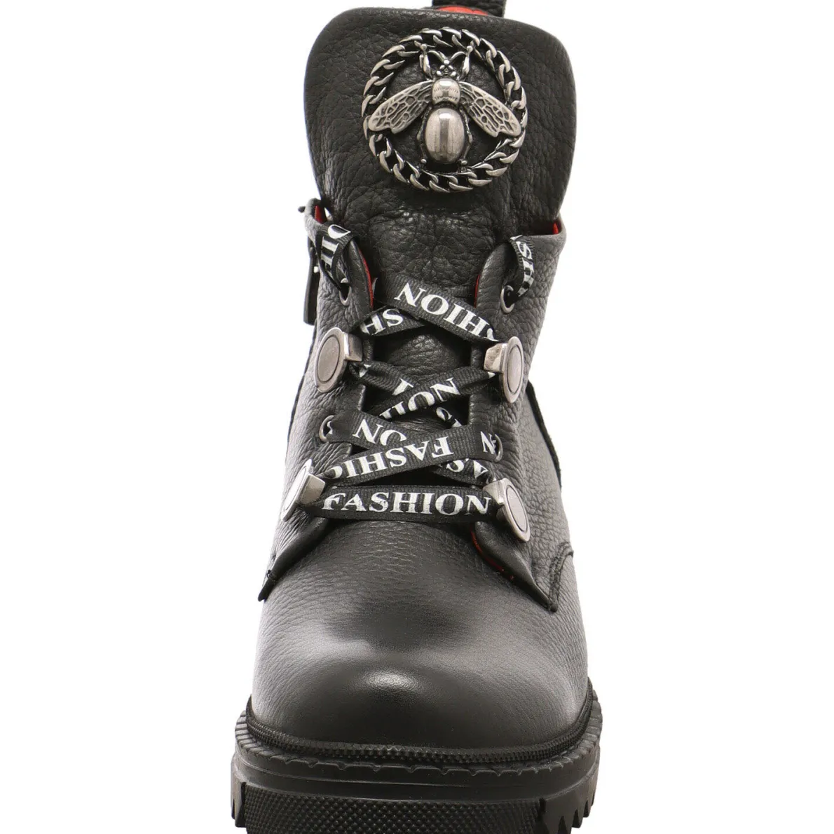 Eyecatcher sind dabei die Zierschnürung mit dem breiten Stoffband mit Schriftzug und die Metallapplikation einer Biene auf der Zunge. Der Schaft und die Zunge haben eine ganz besondere Linienführung und passen super zum Look. An der Ferse ist ebenfalls ein Reißverschluss angedeutet und das innenfutter ist Rot, beides sind zusätzliche Hingucker.