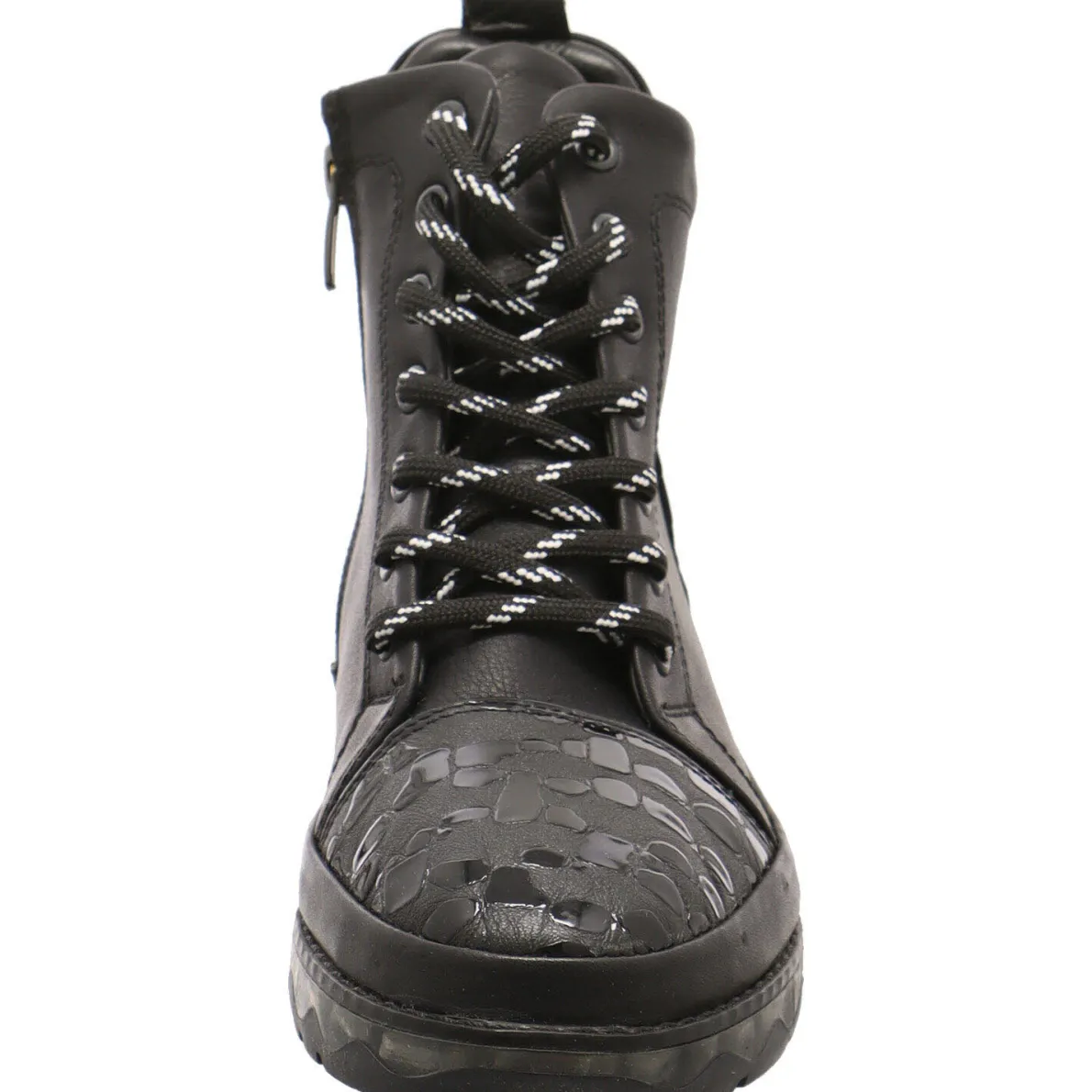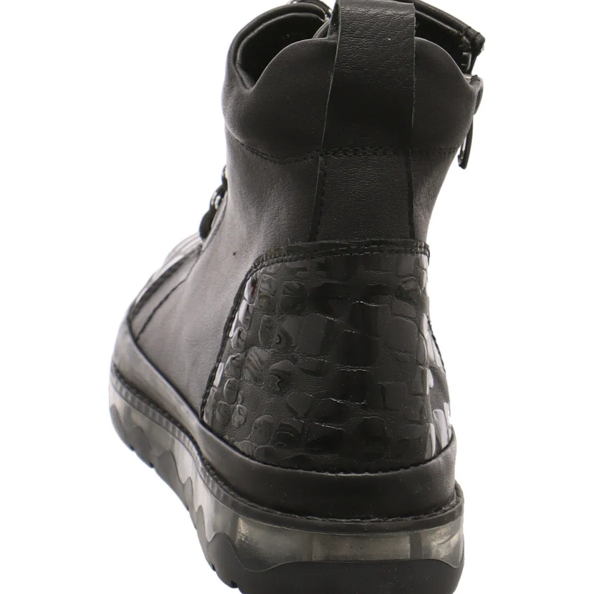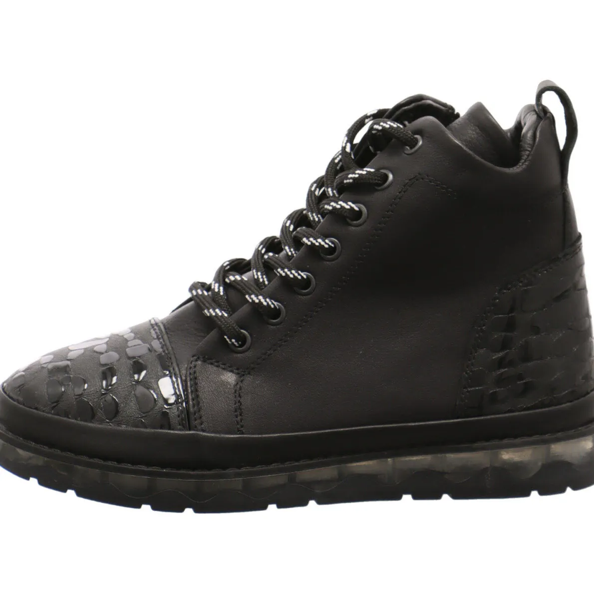 Das Obermaterial aus Glattleder in Schwarz wird durch die Einsätze mit Animalprint in Lackoptik auf dem Blatt und an der Ferse gekonnt in Szene gesetzt. Durch den seitlichen Reißverschluss ist ein leichter Einstieg möglich und durch die Schnürung in Schwarz/Weiß lässt sich der Schuh optimal an den Fuß anpassen.