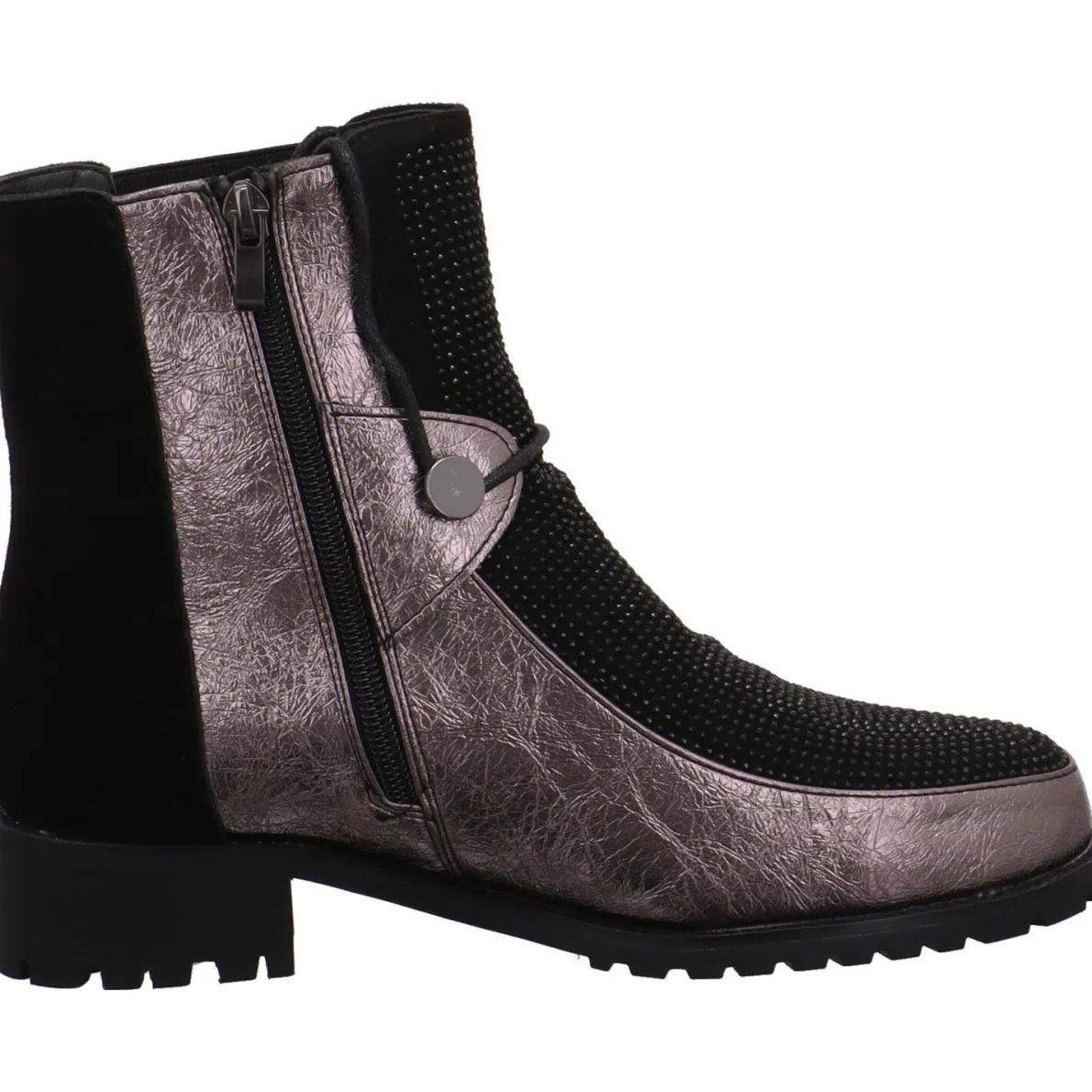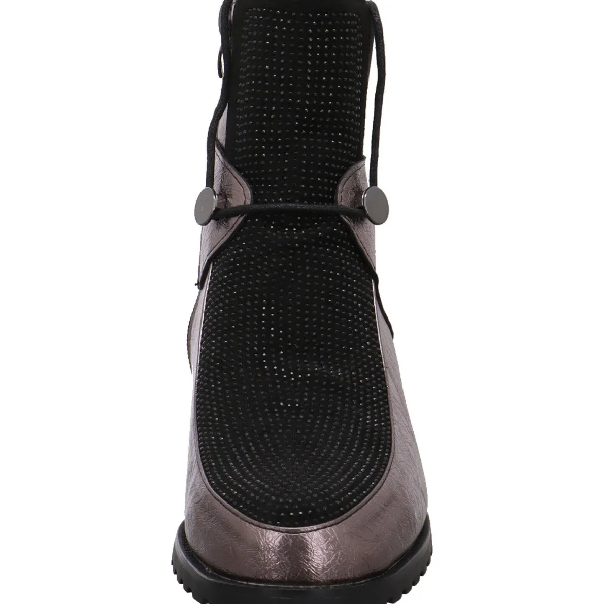 Sie wurde aus einem Mix aus Kunstleder und Textil in Schwarz gearbeitet. Auf dem Blatt, bis hoch zum Schaft sind viele kleine Strasssteine angebracht. Ein Einsatz an der Seite und entlang der Schuhspitze in Metallic Silber ist ein weiterer Eyecatcher.