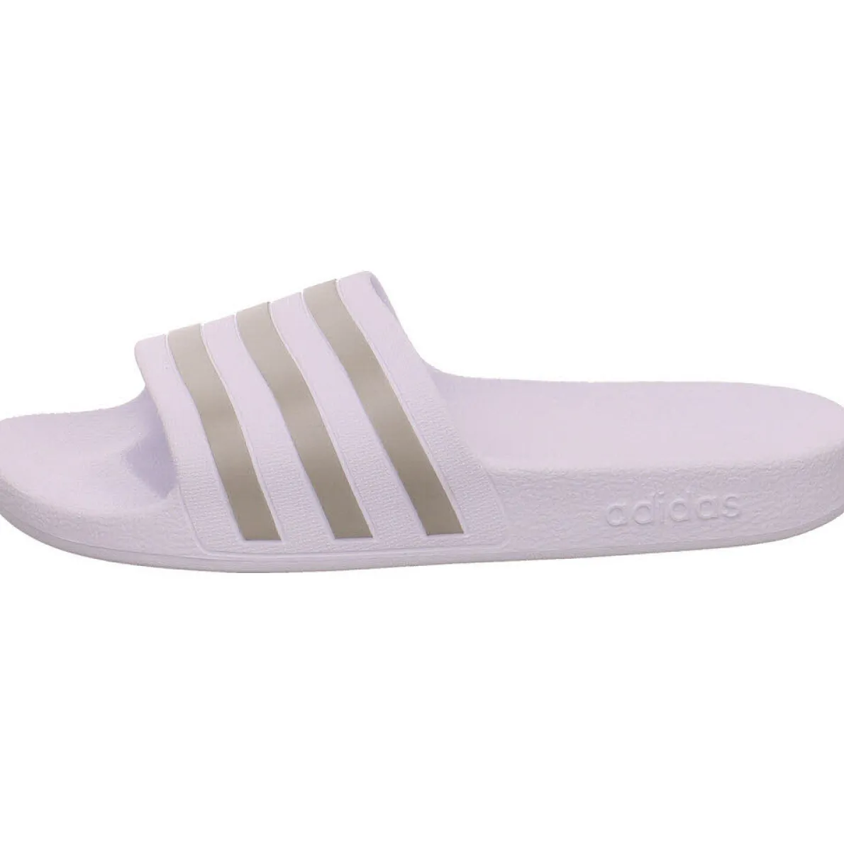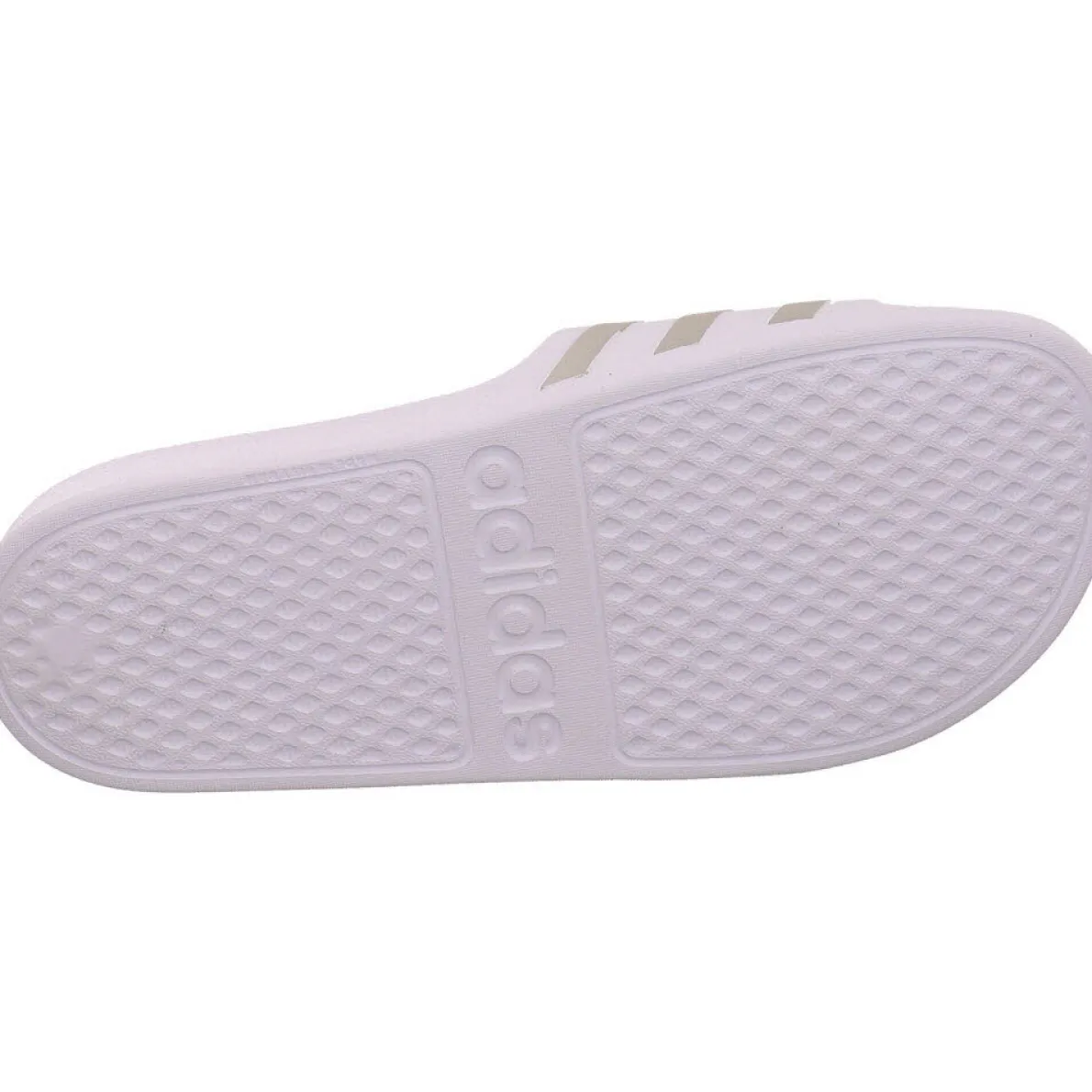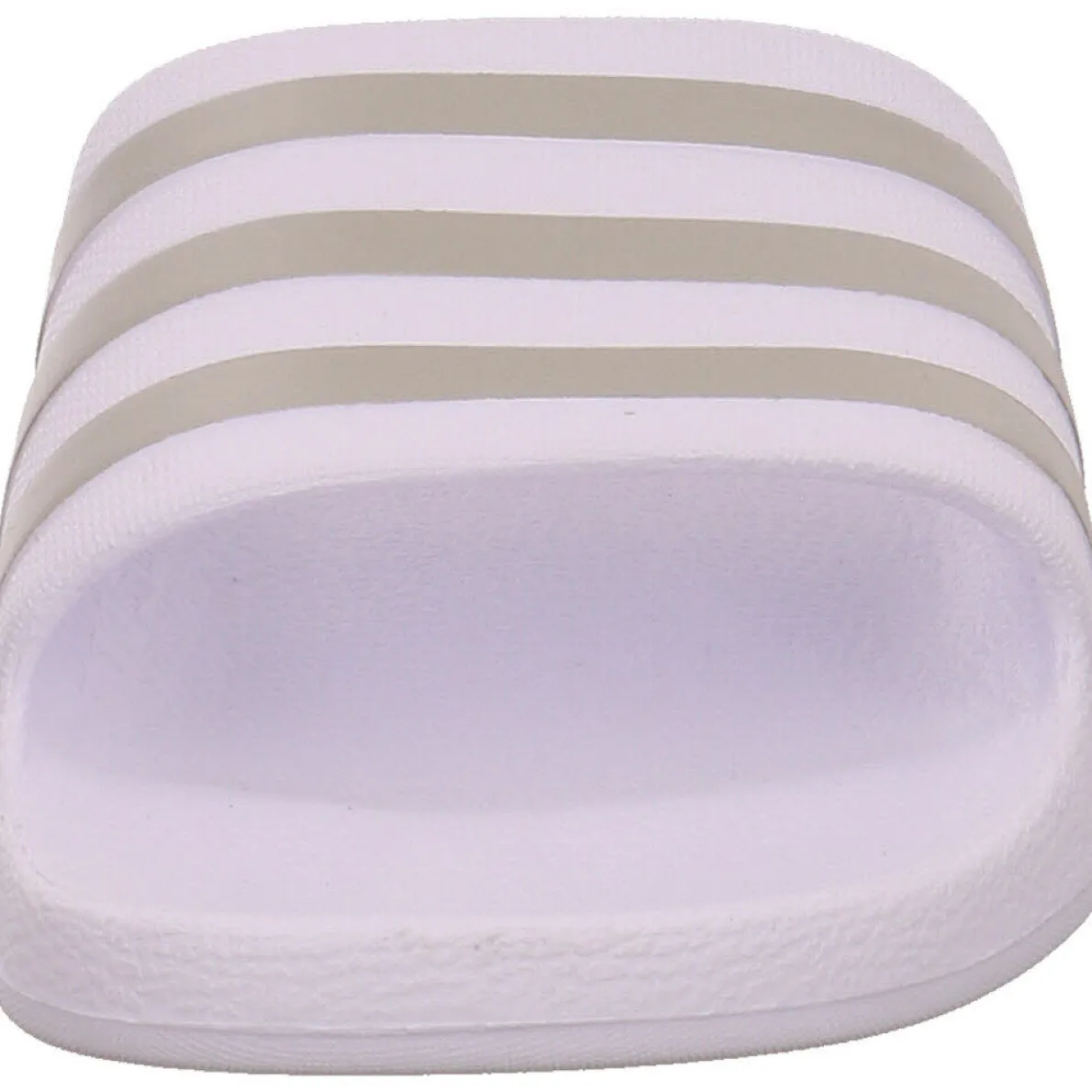 Die Adilette Aqua ist ein Badeschuh für Damen und Herren von Adidas in Weiß und Silber und ein absoluter Klassiker. Er ist bestens geeignet für das volle Programm vor und nach dem Training.