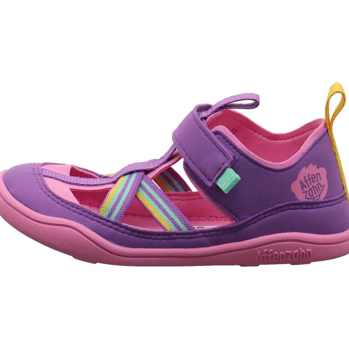 Das Obermaterial in Lila wurde aus Textil gefertigt. Durch die zwei Laschen am Schaft und die überkreuzten Gummibänder ist der Einstieg ganz einfach. Mit dem Klettverschluss kannst du den Schuh optimal auf die Bedürfnisse deines Mädchen anpassen. Eine Rechts-, Linksunterscheidung findest du an der Ferse. Der Schuh ist super leicht und absolut flexibel und vermittelt mit seiner dünnen Laufsohle das typische Barfußgefühl.