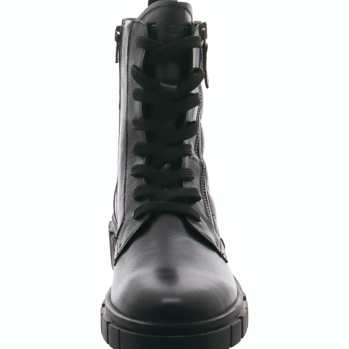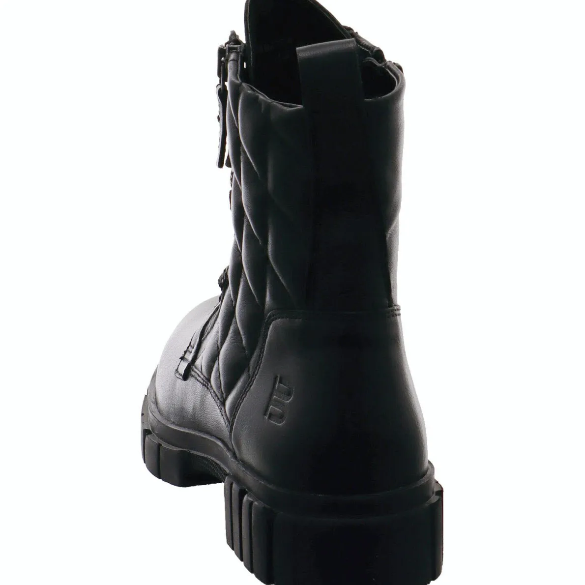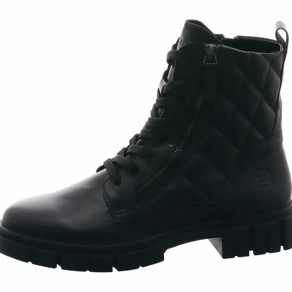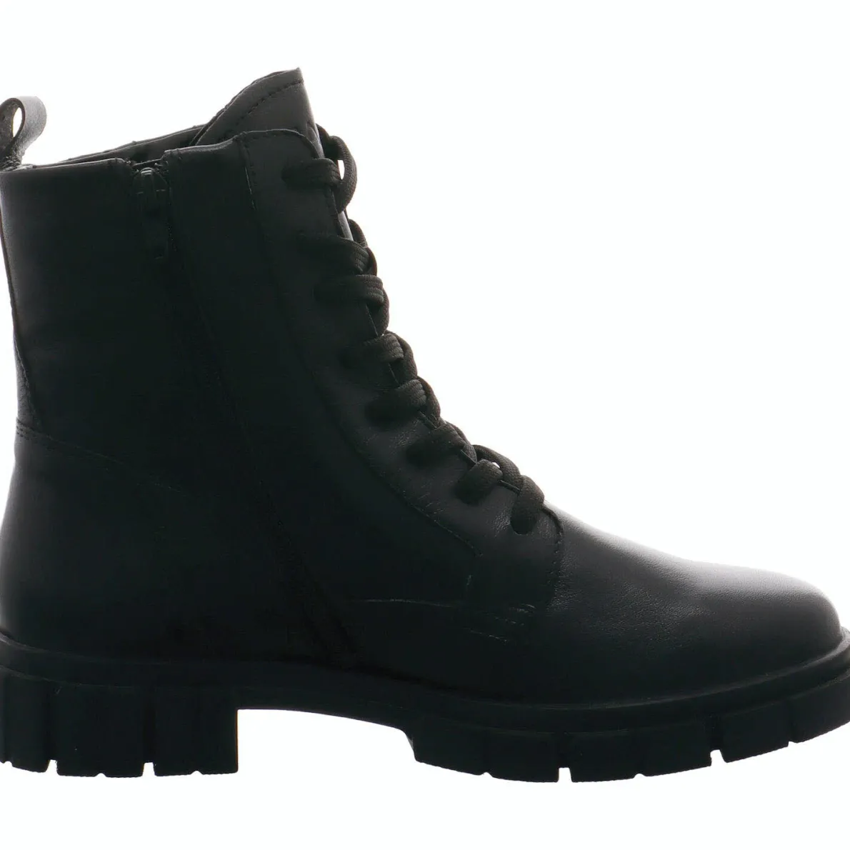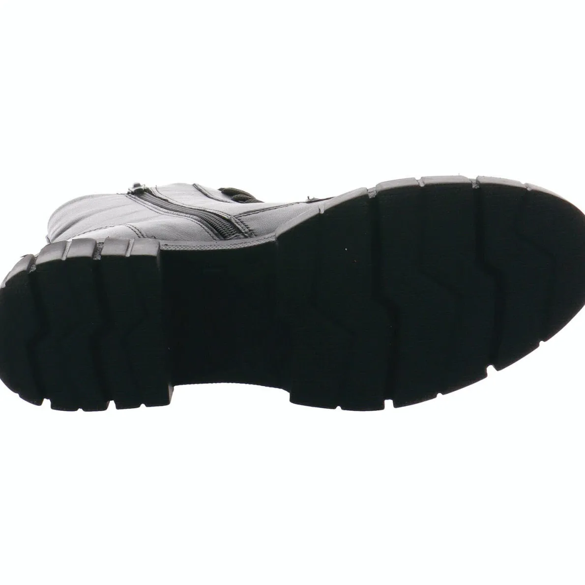 Das Obermaterial aus weichem Echtleder in Schwarz ist an der Seite vom Schaft mit einer besonderen Prägung versehen. Ein Zierzipper rundet das Design perfekt ab.