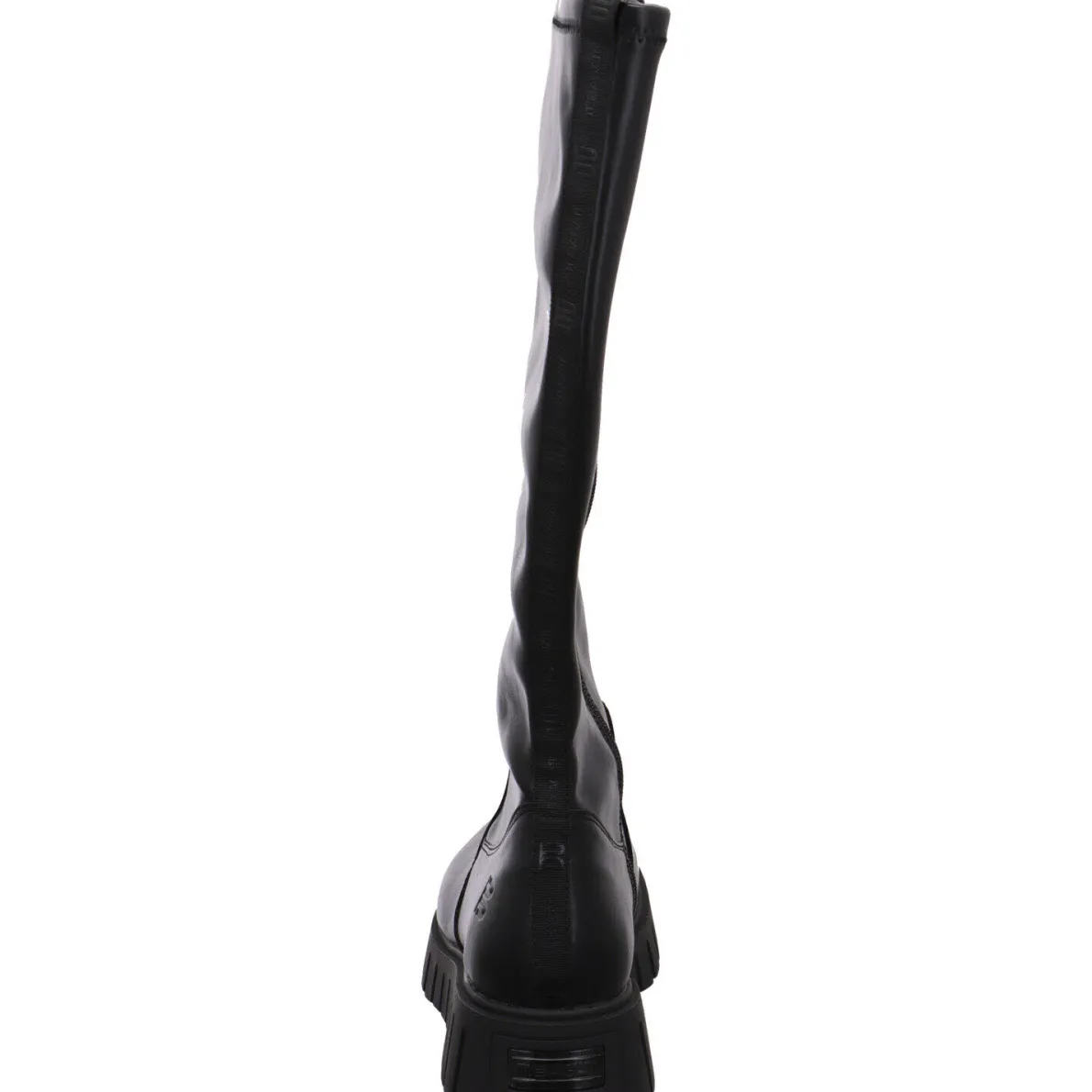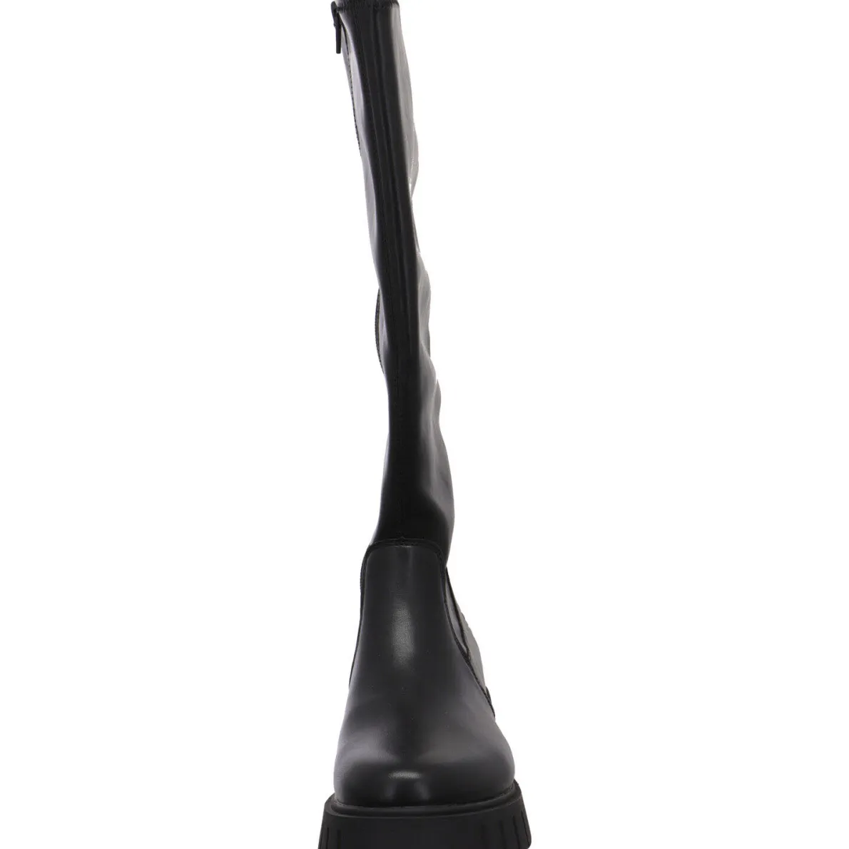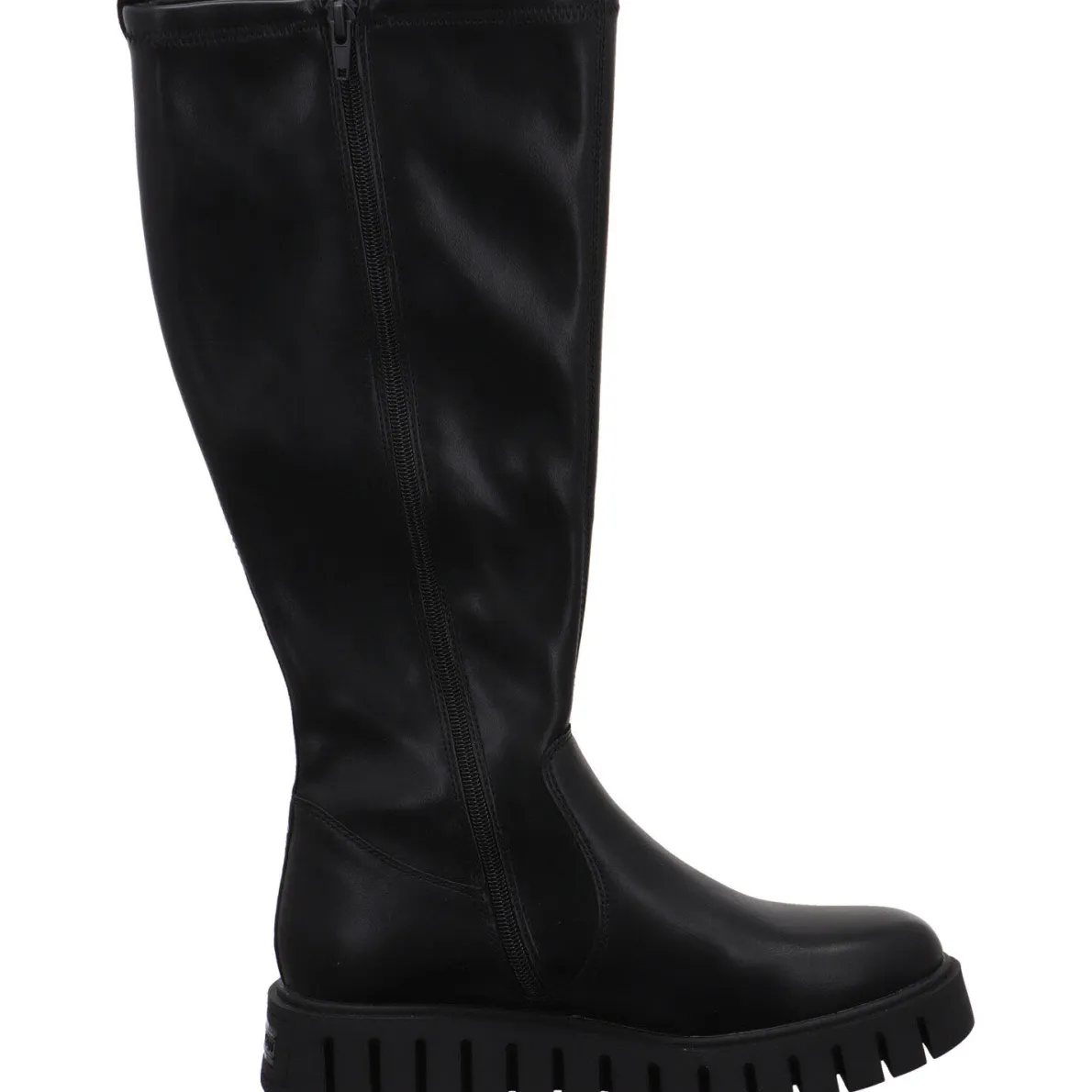 Er wurde aus Kunstleder in Schwarz gearbeitet und fällt durch seinen langen Schaft bis zum Knie sofort auf. Dieser ist elastisch gearbeitet und mit einem Reißverschluss versehen. Er passt sich so perfekt dem Bein an und das An- und Ausziehen ist ganz einfach. An der Rückseite ist ein Textilband mit dem Marken Logo angebracht. Die Soft Insole Innensohle ist angenehm weich und komfortabel. Die markante, grobe Laufsohle rundet den modischen Look perfekt ab. Trotz seiner Aufmachung ist er ein absolutes Leichtgewicht und angenehm zu tragen, ob zu einem kurzen Rock oder einer engen Hose.