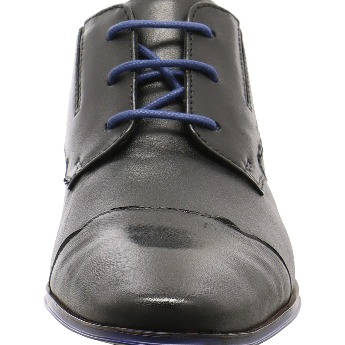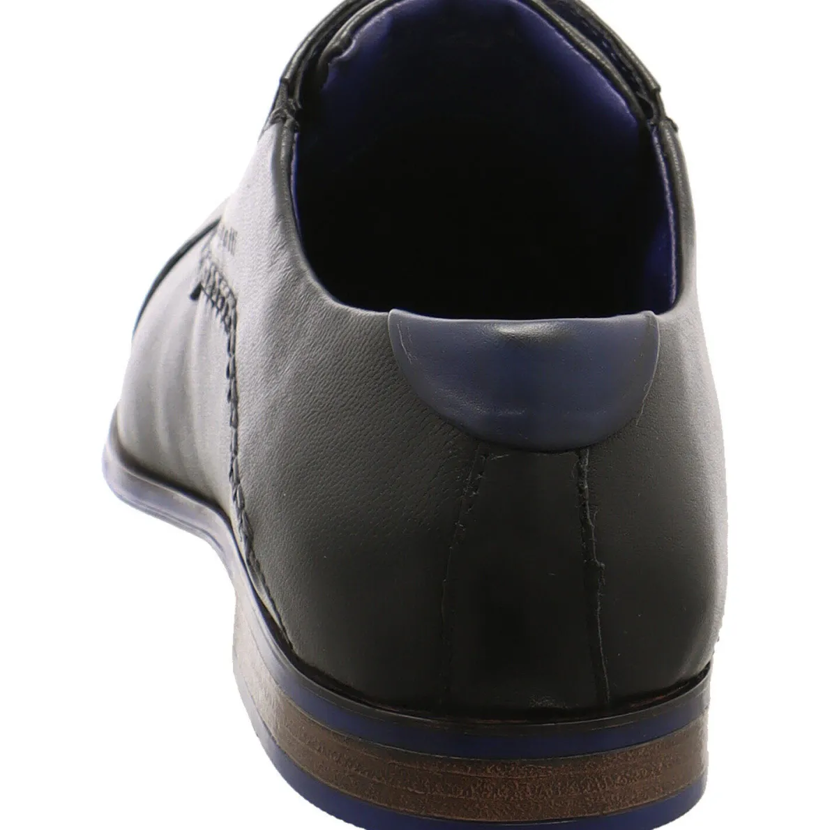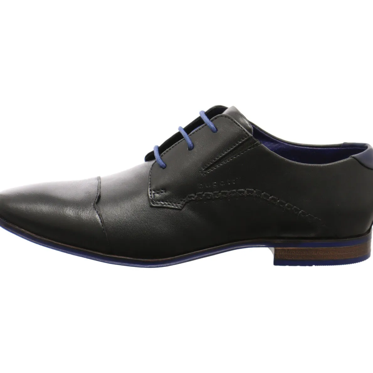 Weitere Hingucker dieses Schuhs sind die seitliche Bugatti Prägung und die groben Nähte. Das Innenfutter in leuchtendem, dunklem Blau passt zu der Sohlenumrandung, welche das Design des Schuhs gekonnt abrundet.