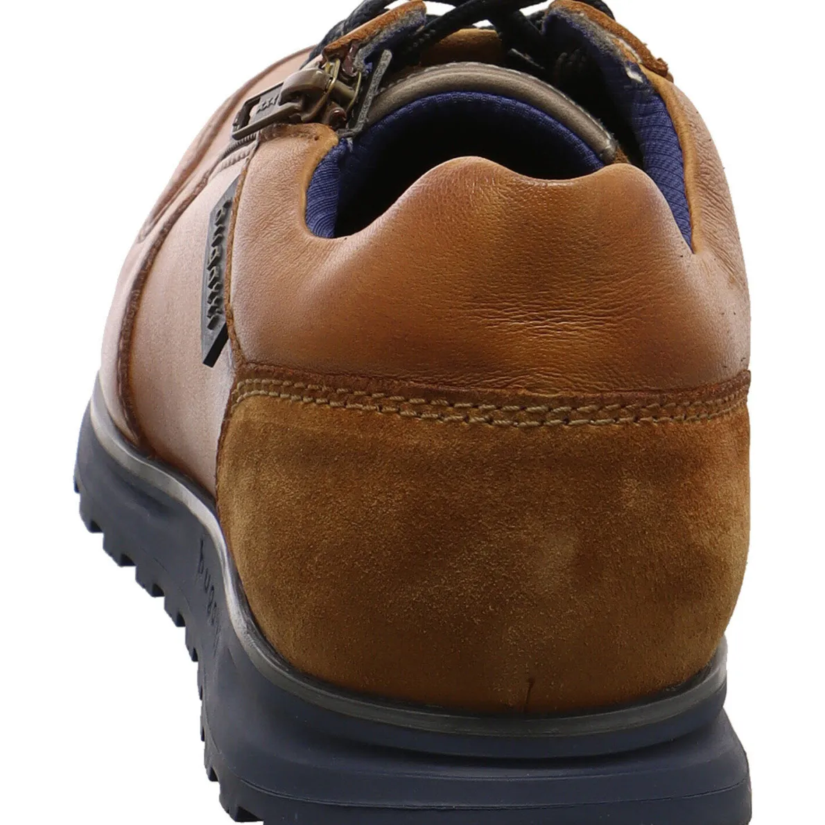 Gefertigt aus hochwertigem Echtleder in Cognac Braun , passt er perfekt zu jedem Outfit. Der Einsatz an der Ferse aus Veloursleder und die Akzente in Blau sind dabei tolle Hingucker. Durch den seitlichen Reißverschluss kommst du ganz leicht in den Schuh und mit der Schnürung kannst du die Passform optimieren. Der Schaft ist angenehm weich gepolstert und die Innensohle als Wechselfußbett gearbeitet. So können auch eigene Einlagen verwendet werden. Die Laufsohle hat einen guten Grip und passt durch ihre Linienführung super zum Look.