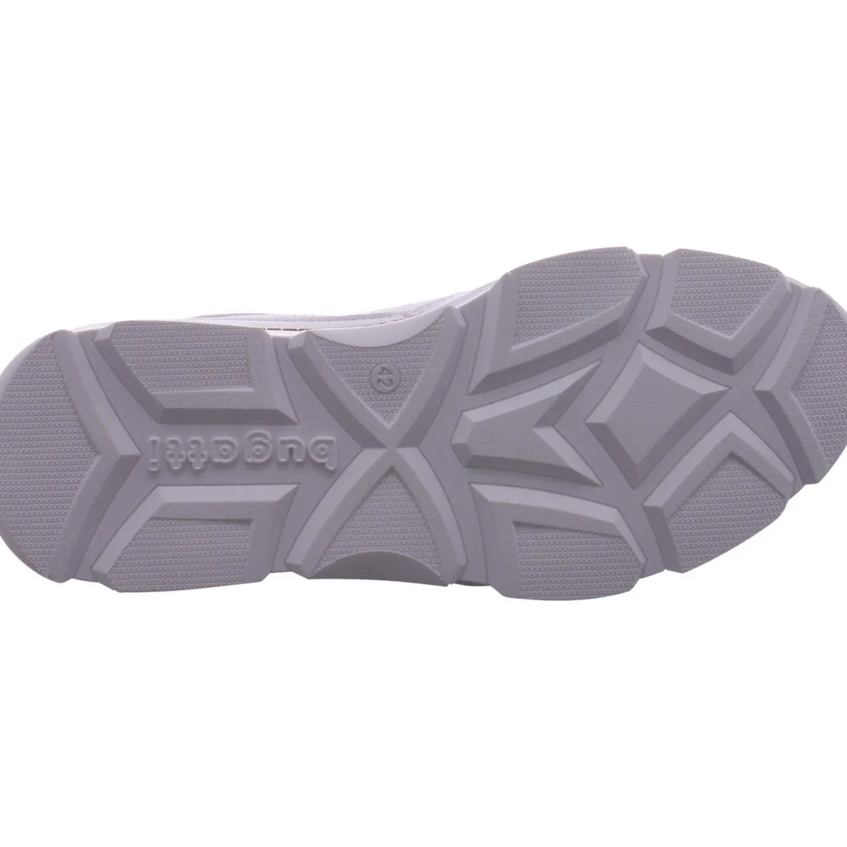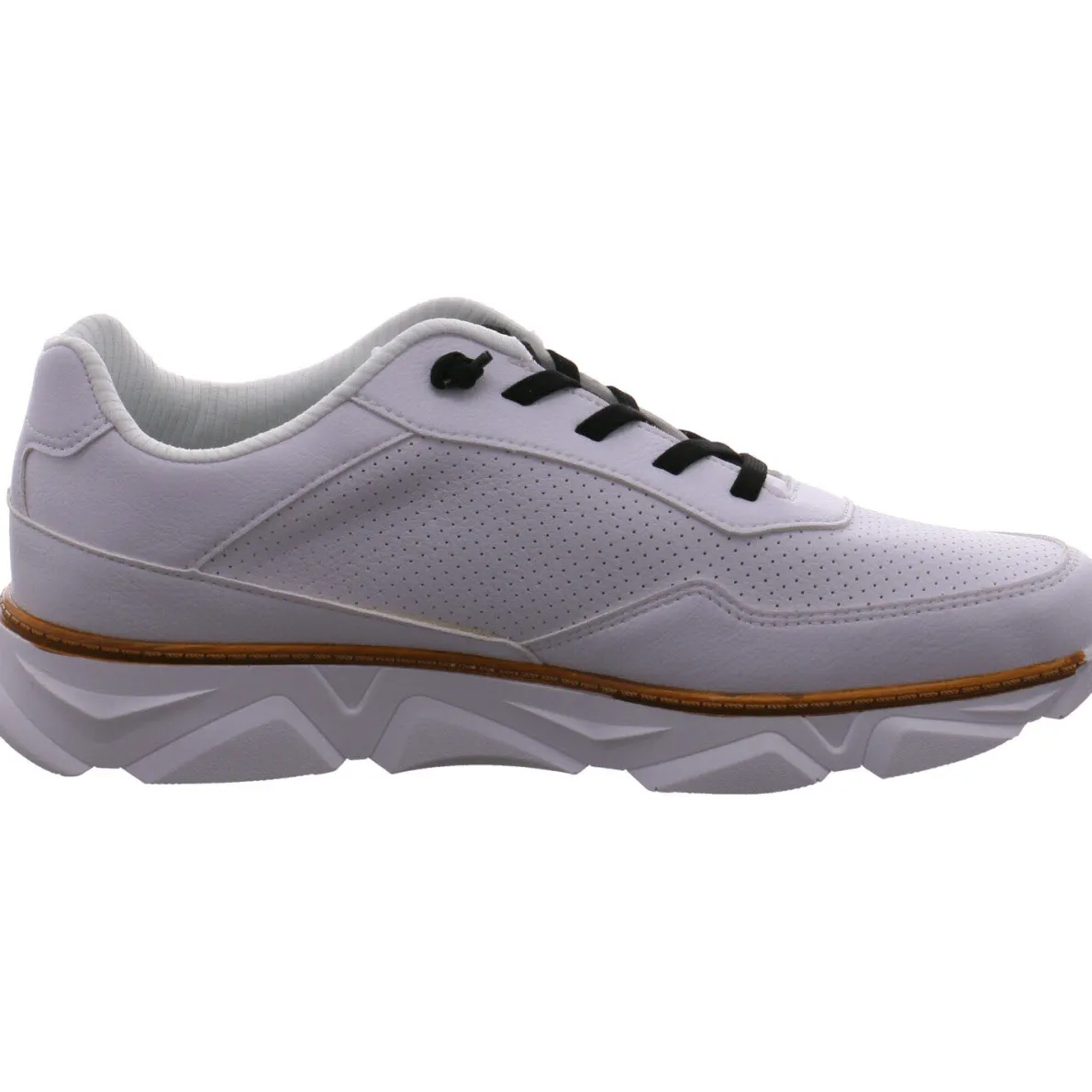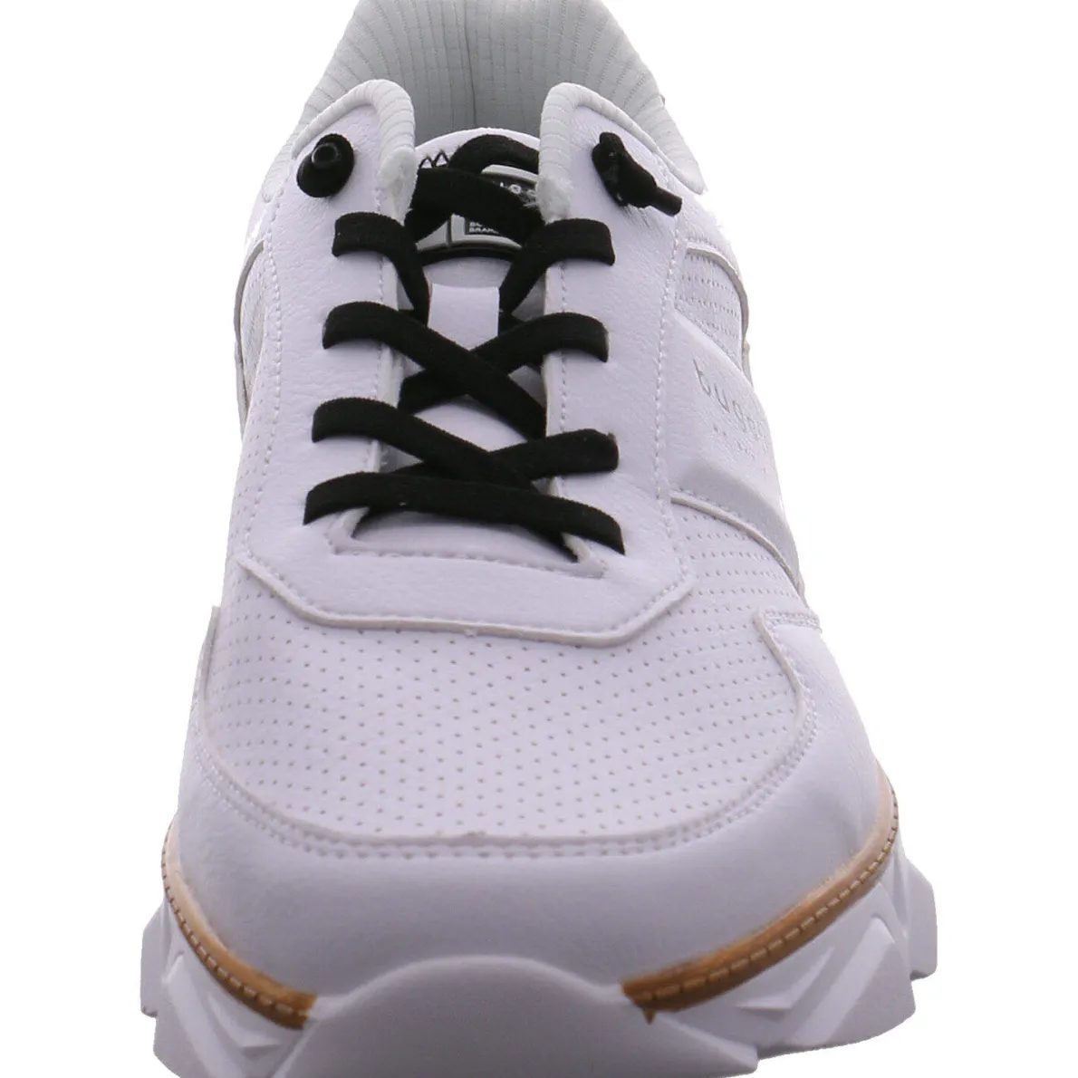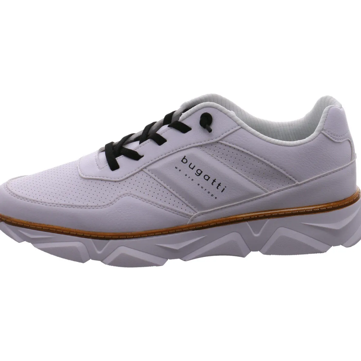 Sportlich und modern präsentiert sich dieser Herren Sneaker aus dem Hause Bugatti. Der sportive Schnürer wurde aus Kunstleder in Weiß gefertigt und mit dezenten Details, wie dem aufgedruckten Marken Logo versehen. Kleine Lasercuts und eine Umrandung in Braun um die Laufsohle sind weitere Hingucker.