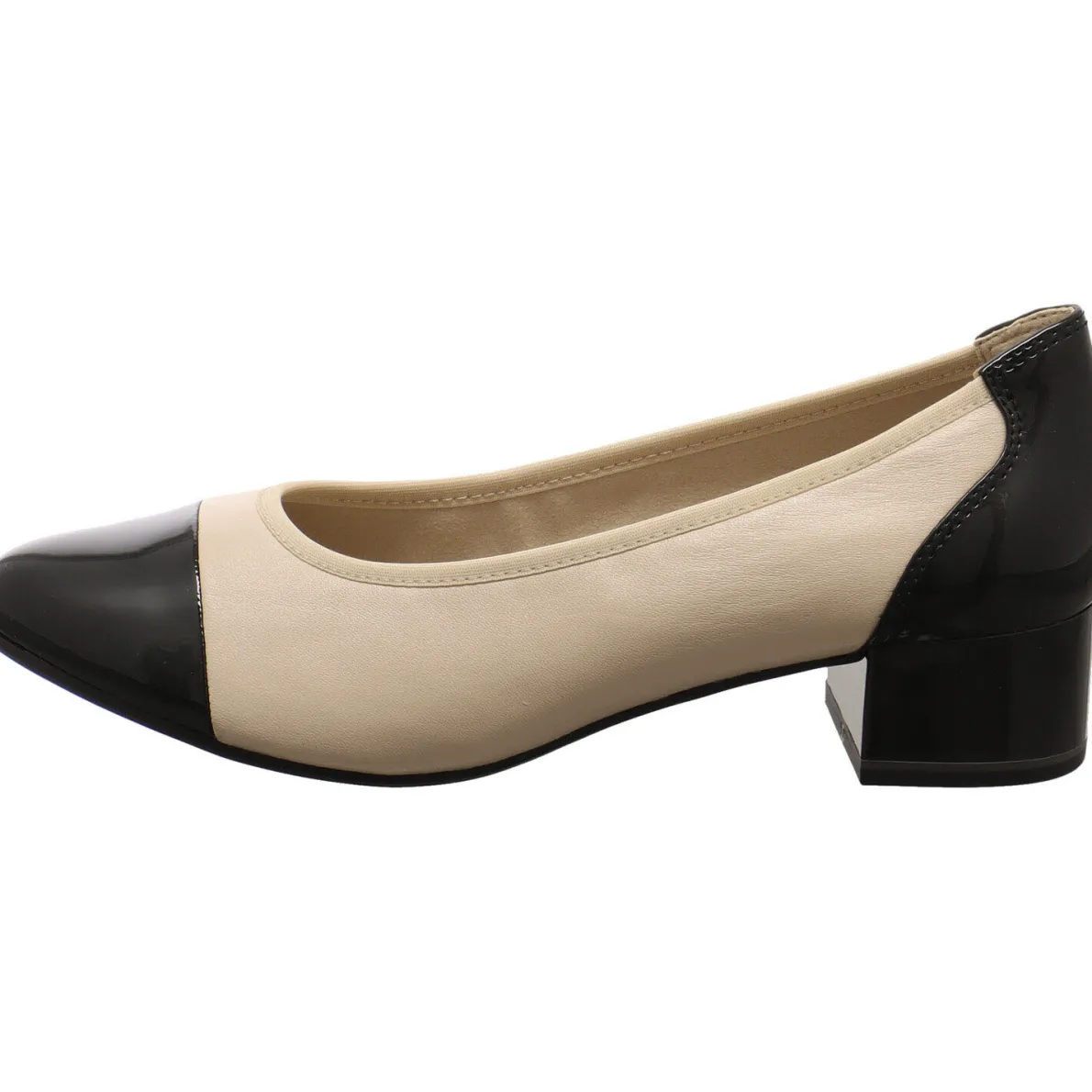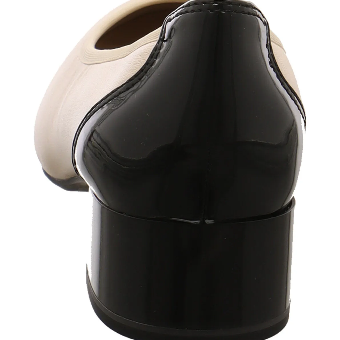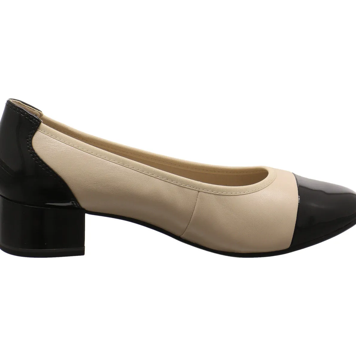 Gefertigt aus aus Echtleder in Beige fällt er besonders durch seine Lack Einsätze in Schwarz an Schuhspitze und Ferse, sowie am Absatz ins Auge. Die Antishock Absatzdämpfung vom Blockabsatz bietet dabei ein Höchstmaß an Komfort. Zudem ist er in Weite H gearbeitet und bietet so den Füßen deutlich mehr Platz und Komfort. Für guten Grip sorgt die feine Rillenstruktur der Laufsohle.