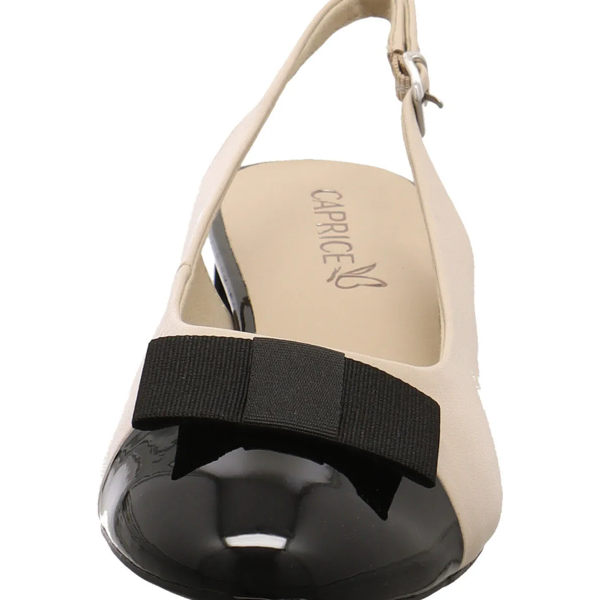 Gefertigt aus einem Mix aus Echtleder und Textil in Beige fällt er besonders durch seine Lack Einsätze an der Schuhspitze in Schwarz ins Auge. Die offene Ferse ist ein tolles Detail, was den Schuh besonders macht. Durch den verstellbaren Riemen, lässt sich der Schuh optimal an den Fuß anpassen. Die breite Schleife aus Textil auf dem Blatt passt perferkt zum Gesamtbild des Schuhs. Stretch Einsätze und die Antishock Absatzdämpfung vom Blockabsatz bieten dabei ein Höchstmaß an Komfort.