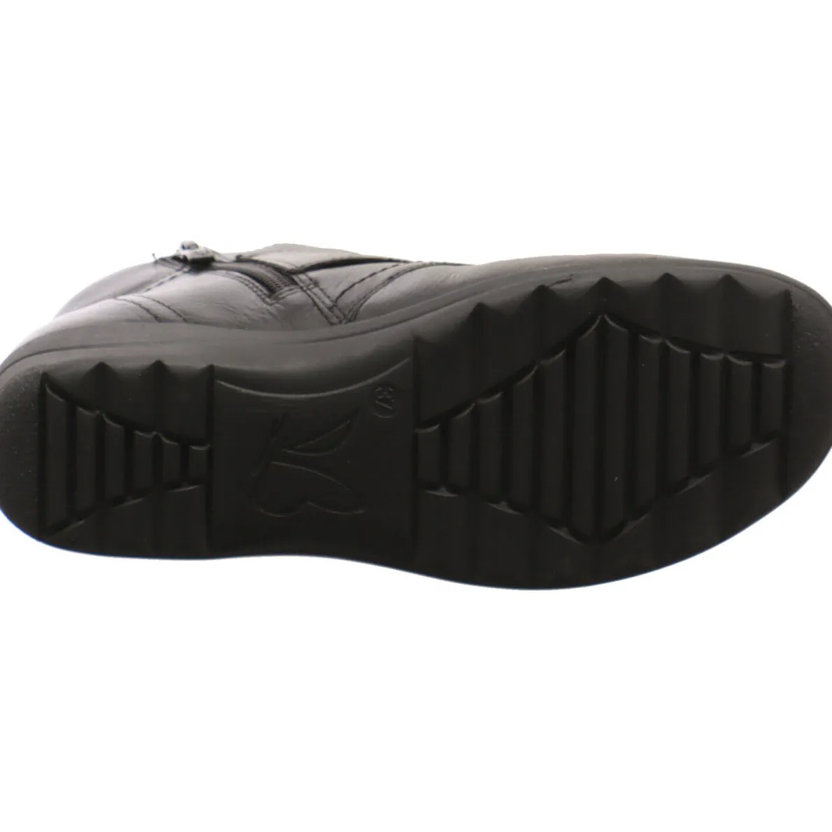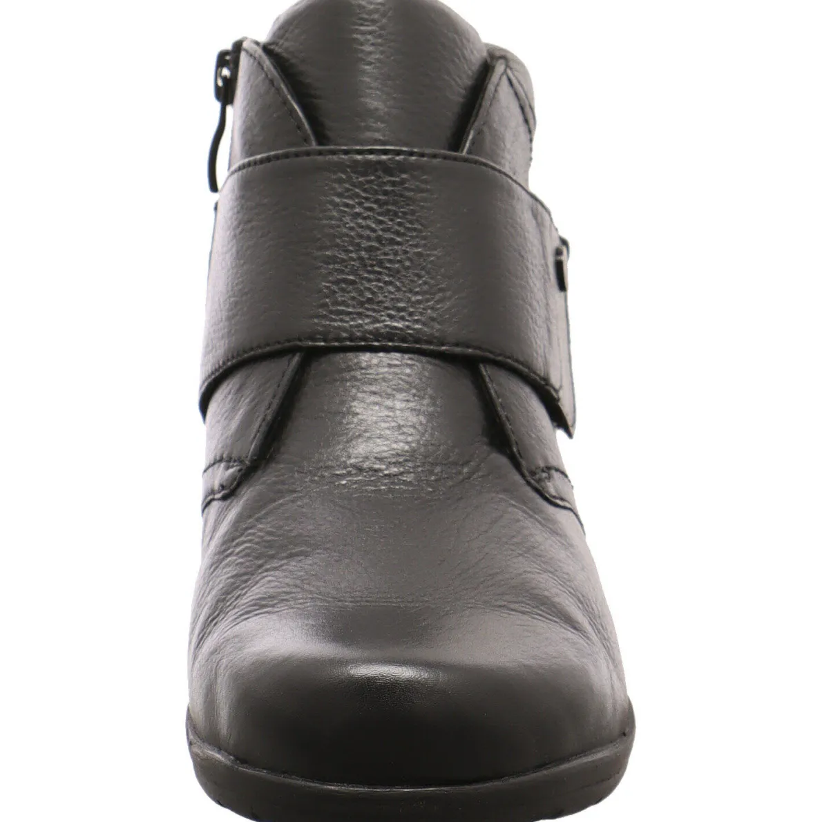 Durch den einfachen Klettverschluss auf dem Spann in Kombination mit dem seitlichen Reißverschluss ist ein leichter Ein- und Ausstieg gewährleistet. Die Stiefelette ist mit der Weite H ausgestattet, was für etwas mehr Platz sorgt und durch das Wechselfußbett lassen sich problemlos eigene Einlagen verwenden. Die kleine Applikation auf dem Klettverschluss mit dem Caprie Logo rundet das schlichte Design gekonnt ab.