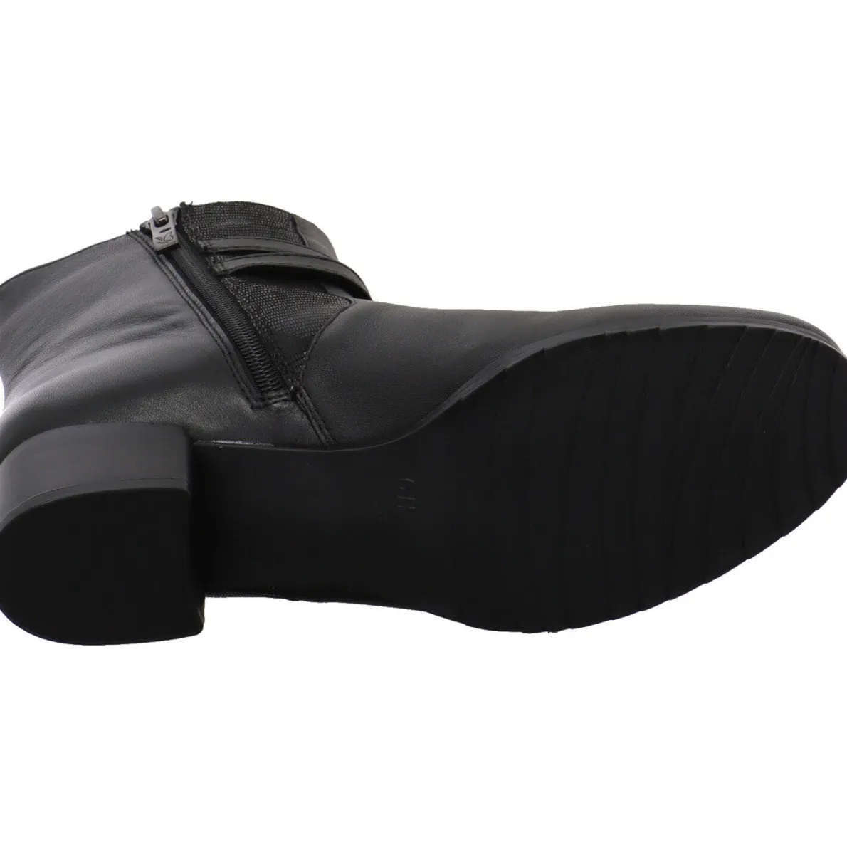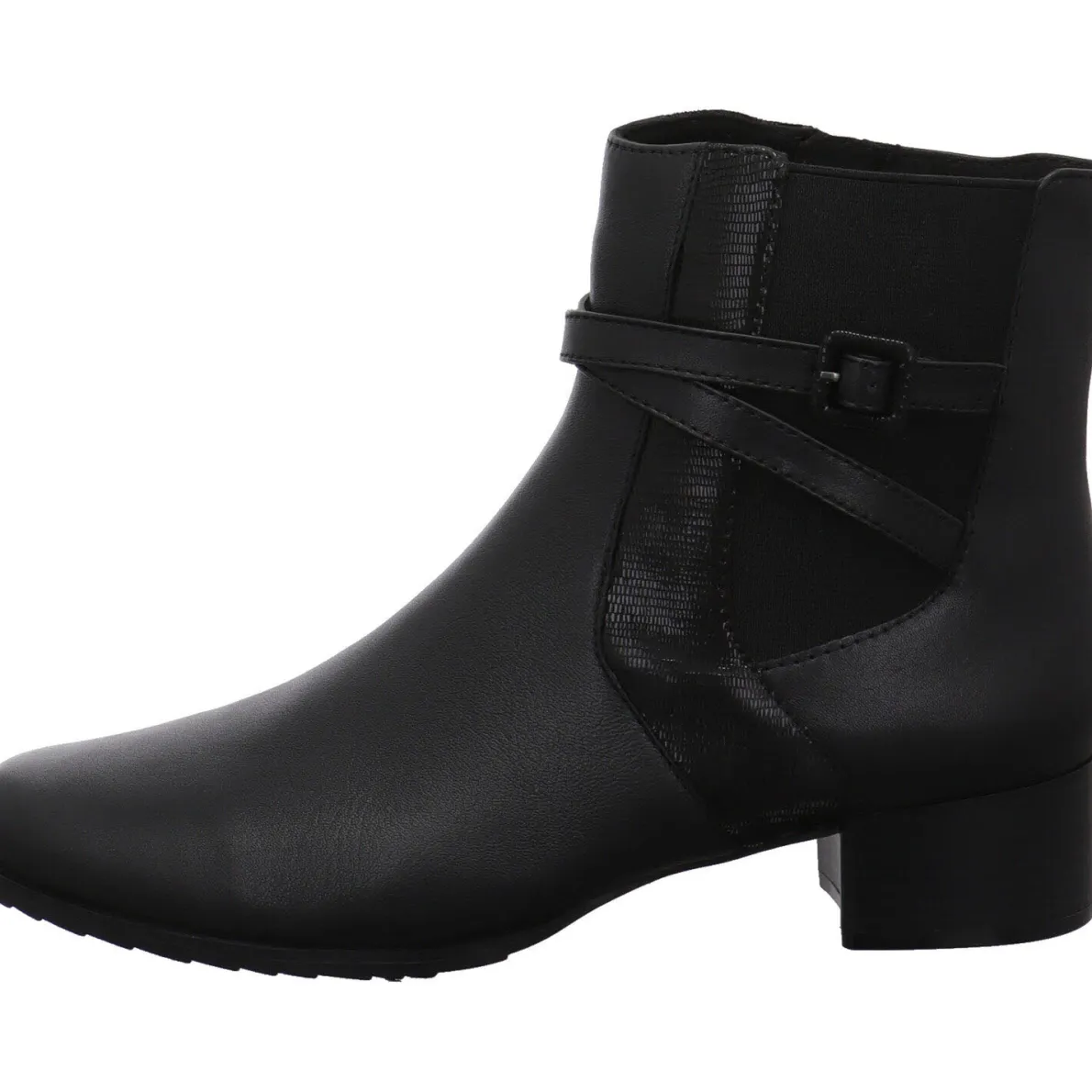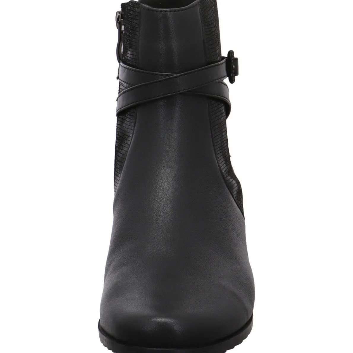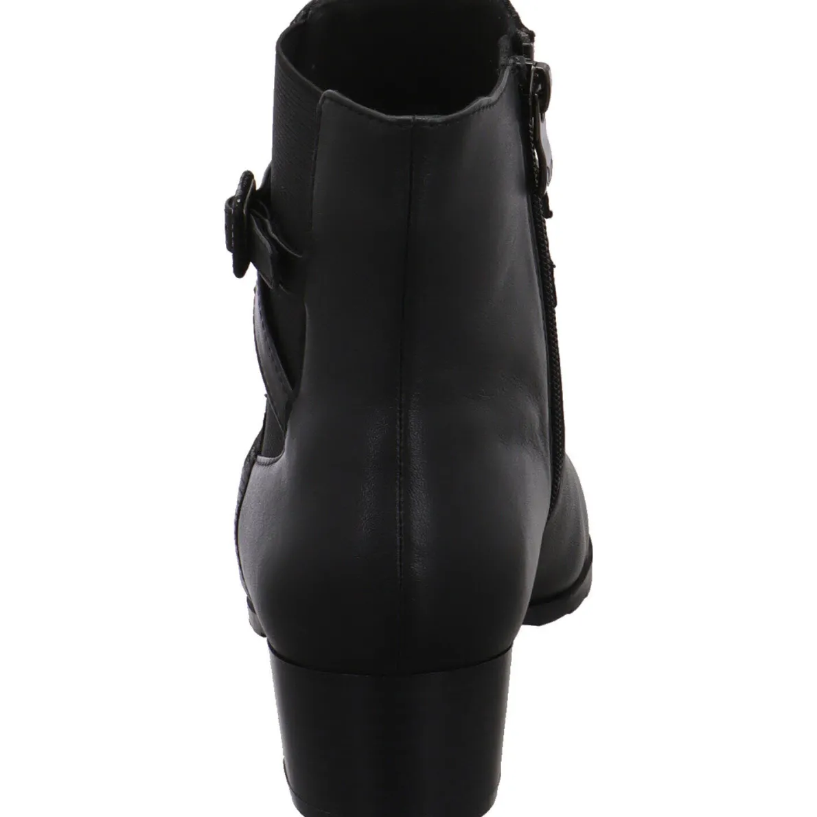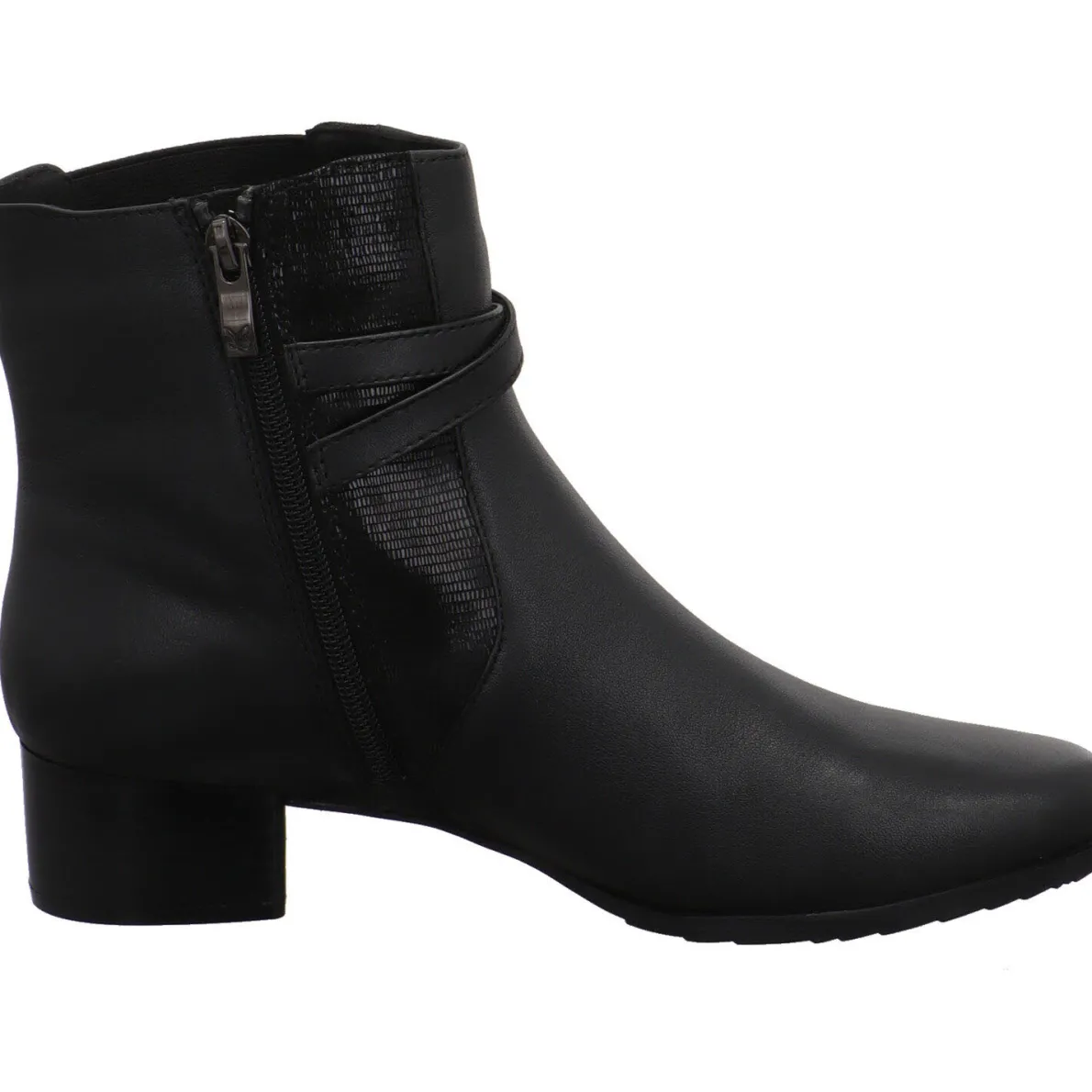 Schlichte Eleganz, zeichnet diese schöne Damen Stiefelette von Caprice aus. Sie wurde aus hochwertigem Echtleder in Schwarz gefertigt. Der Schaft ist an der Außenseite mit einem Dehngummi und einem schimmernden Einsatz aus Textil versehen. Ein Riemen ist dabei um den Knöchel trapiert und bringt das Ganze besonders zur Geltung. Mit dem Reißverschluss auf der Innenseite ist der Einstieg ganz leicht. Die Weite H bietet dem Fuß deutlich mehr Platz und Komfort. Die Innensohle ist besonders weich und als Wechselfußbett gearbeitet. So können auch eigene Einlagen verwendet werden. Der Blockabsatz und die Laufsohle sind profiliert und geben Halt.