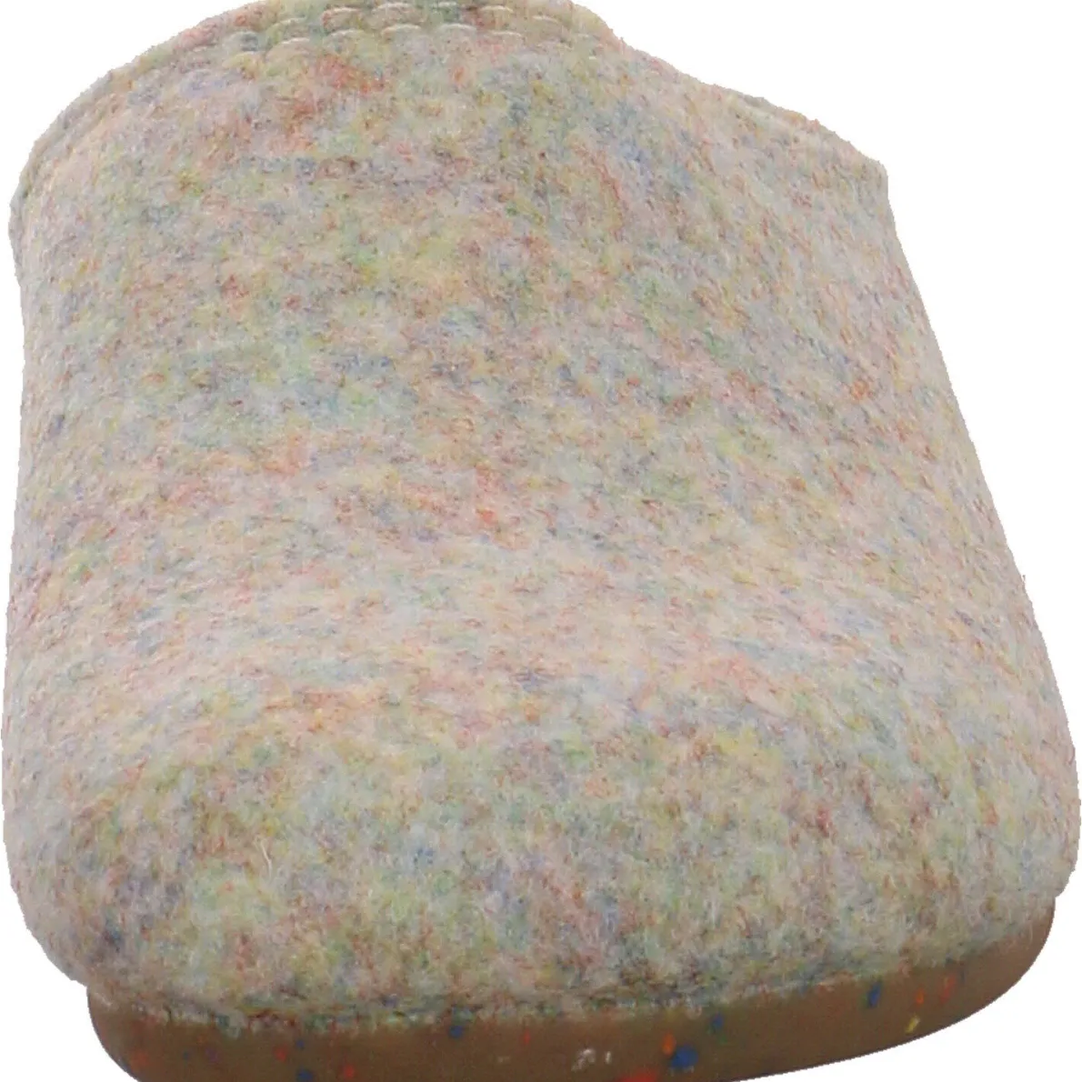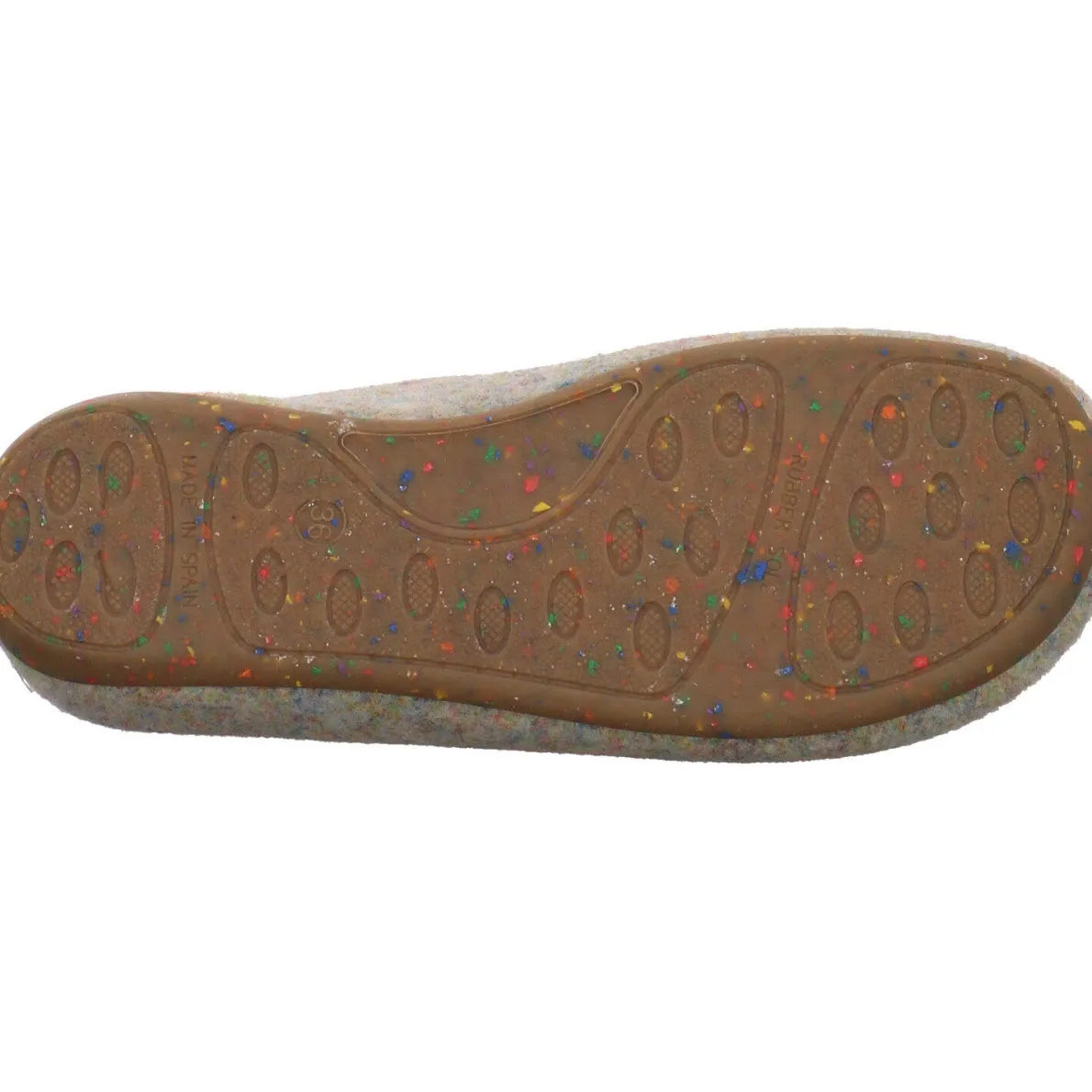 Der Schuh in Bunt wurde aus Recyceltem Polyester aus PET Flaschen gefertigt und das Obermaterial hat die Haptik von Filz. Durch das Wechselfußbett eignet er sich auch wunderbar für lose Einlagen. Die Gummisohle begeistert durch Ihre Bunten Einschlüsse und gibt perfekten Halt, so kommen Sie auch auf glatten Böden nicht ins Rutschen.