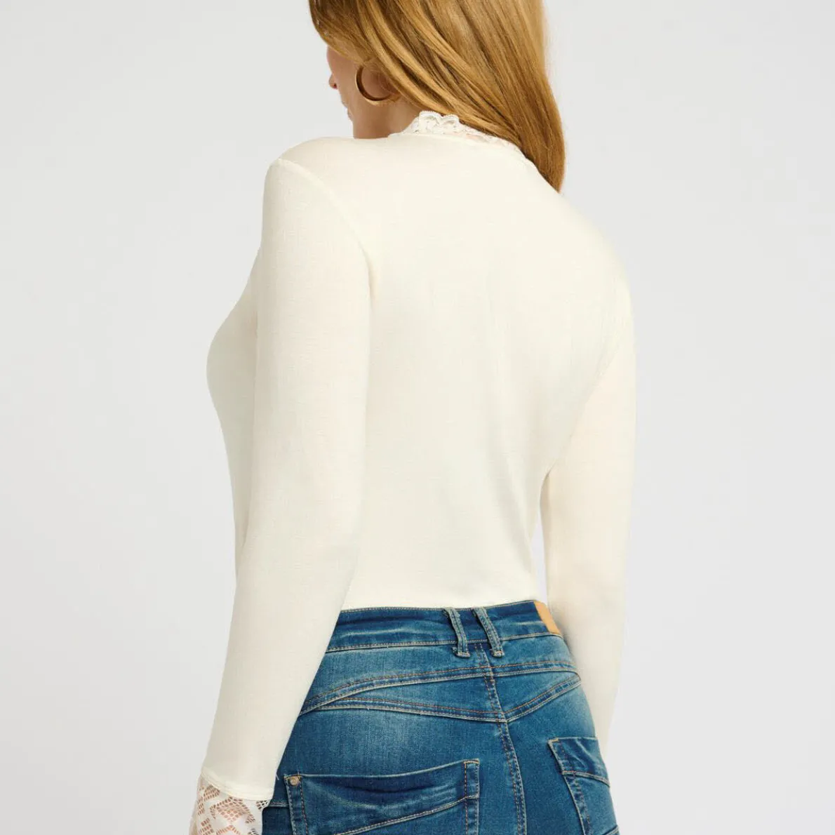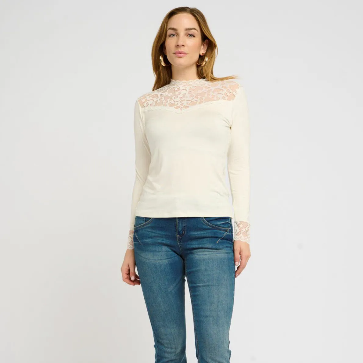 Das Langarmshirt in Beige, Creme begeistert durch seine Einsätze in Spitze an den Ärmeln und am Ausschnitt.