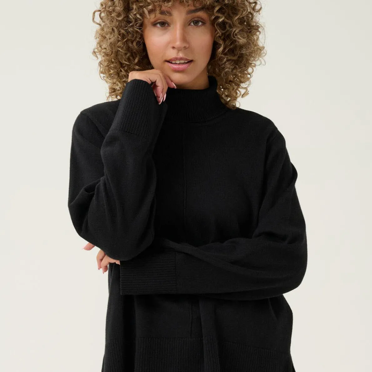 Er wurde aus einem tollen Mischgewebe in Schwarz mit einem Anteil von Kaschmir gefertigt. Dadurch ist er besonders weich und angenehm zu tragen. Er ist mit einem Rollkragen und einem Feinripp Strickmuster, an den Bündchen gearbeitet.