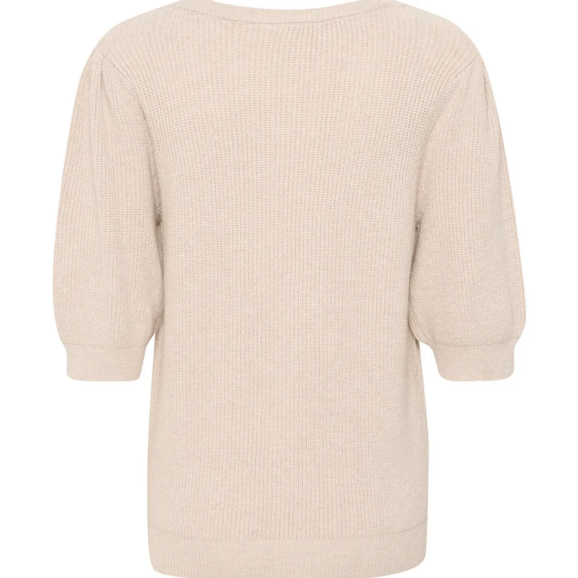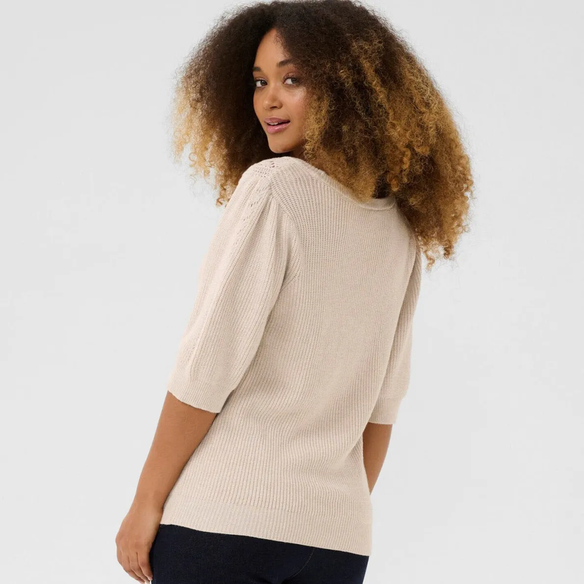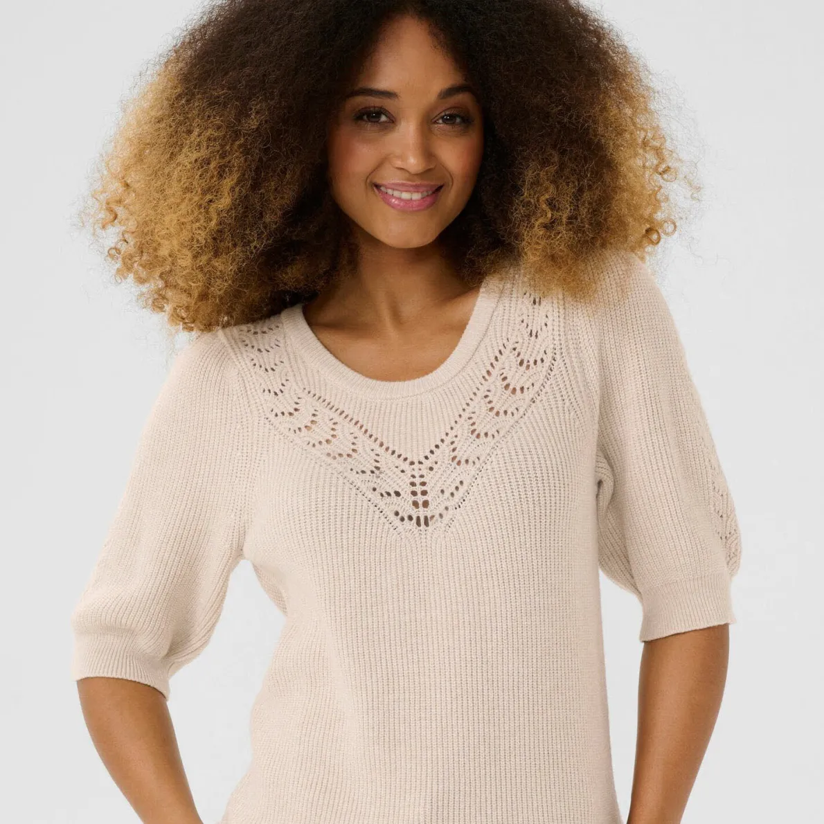 So wurde das feine Strickgewebe in Beige unterhalb vom V-Ausschnitt mit einem schönen Strick Muster verziert. Dieses findet sich auch auf dem halblangen Ärmel wieder. Der Pullover ist Regular Fit geschnitten und ein toller Begleiter für den Übergang in den Herbst.
