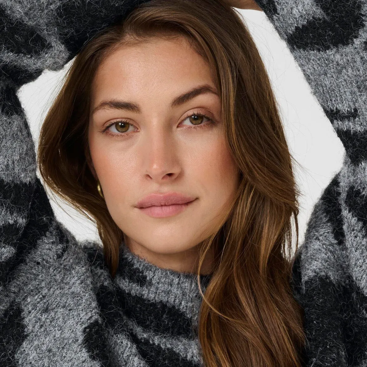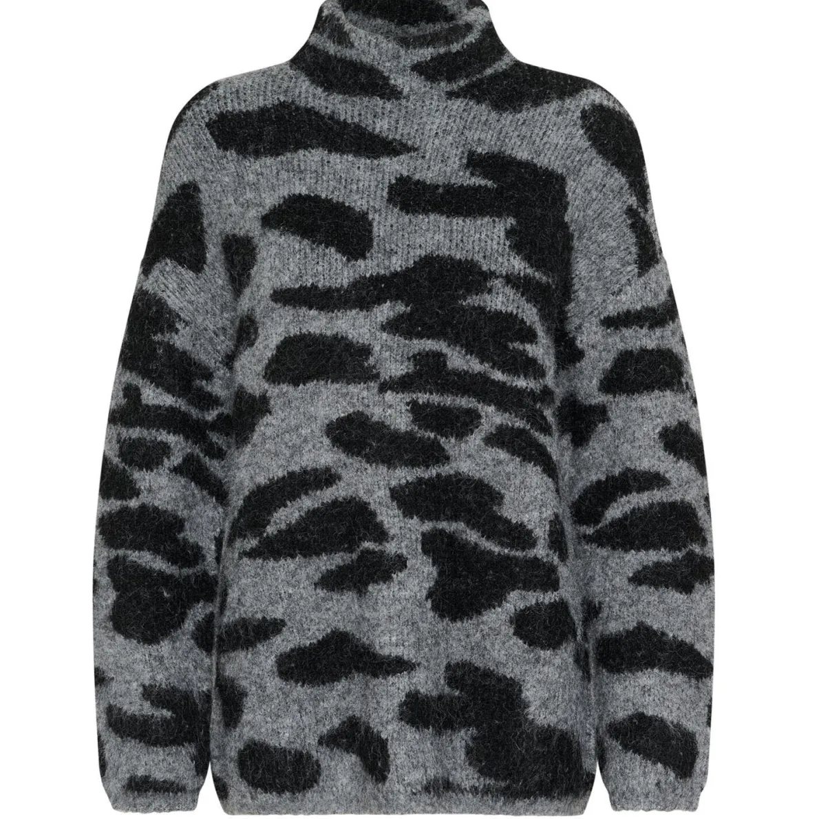 Das Strickgewebe in Grau, ist besonders flauschig gearbeitet und mit einem individuellen Print in Schwarz versehen.