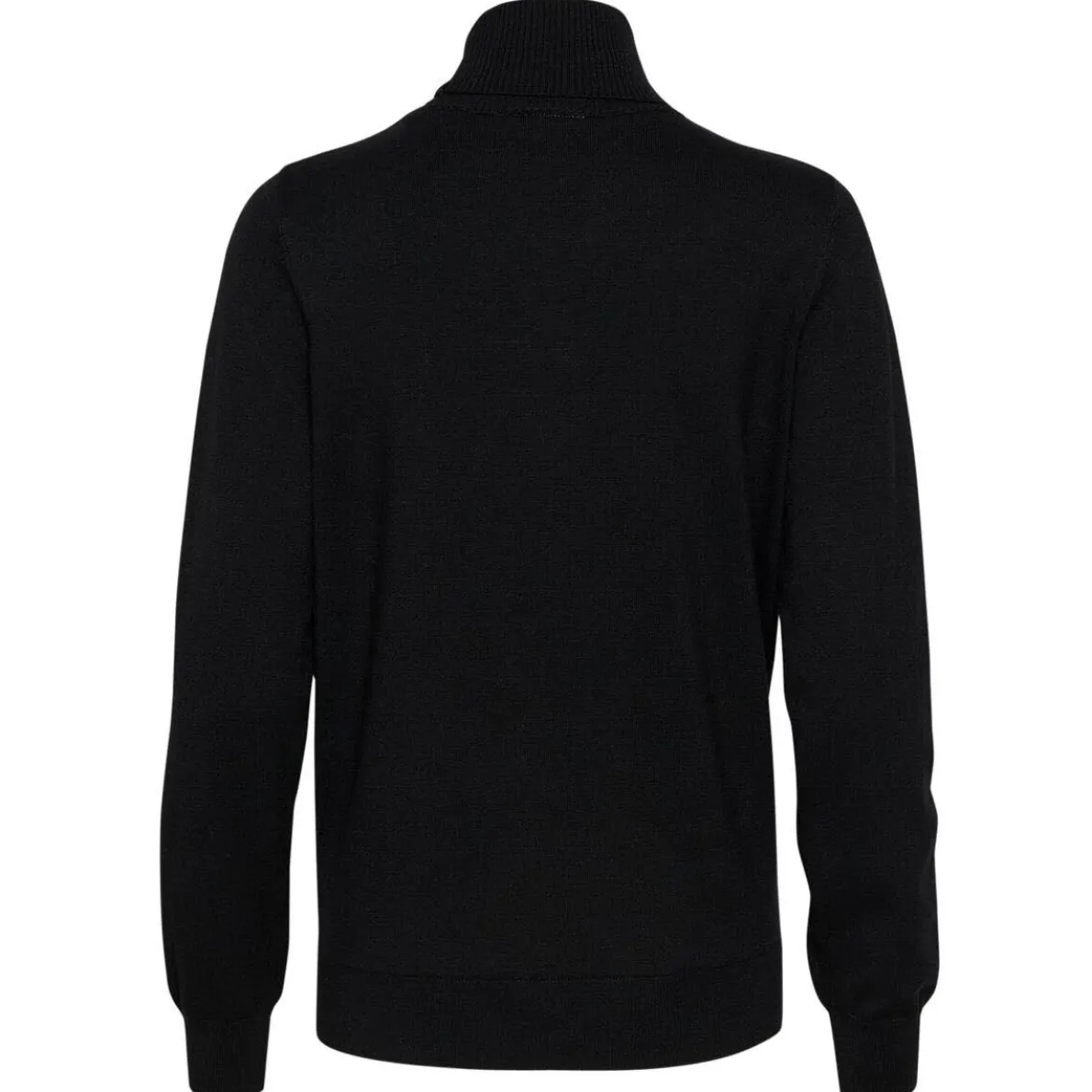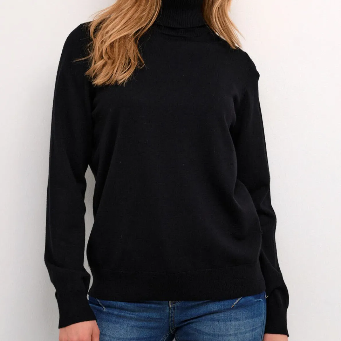Das hochwertige Strickgewebe in Schwarz ist mit einem Rollkragen gearbeitet. An dem langen Ärmel sind Rippstrickbündchen angebracht, diese sorgen für ein super angenehmes Tragen.