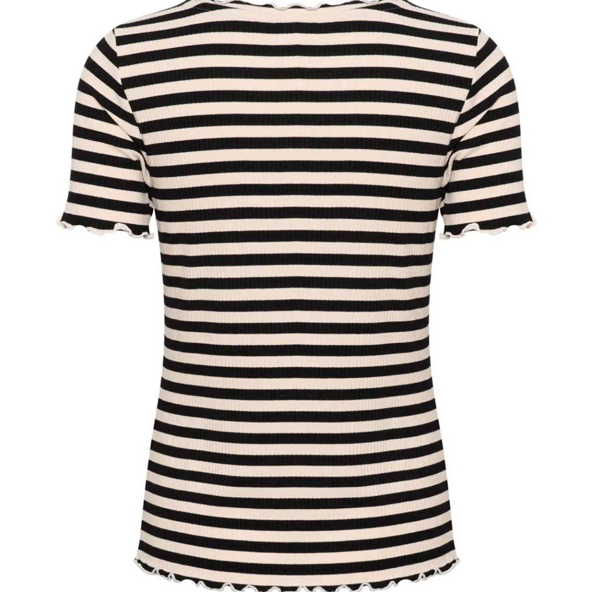 Es ist aus einem angenehmen Mischgewebe in Schwarz mit Streifenmuster gearbeitet. Das Ganze wird durch den wellenartigen Saum am Rundhalsausschnitt und dem kurzen Ärmel gekonnt in Szene gesetzt. Es hat eine normale Passform und lässt sich super kombinieren.