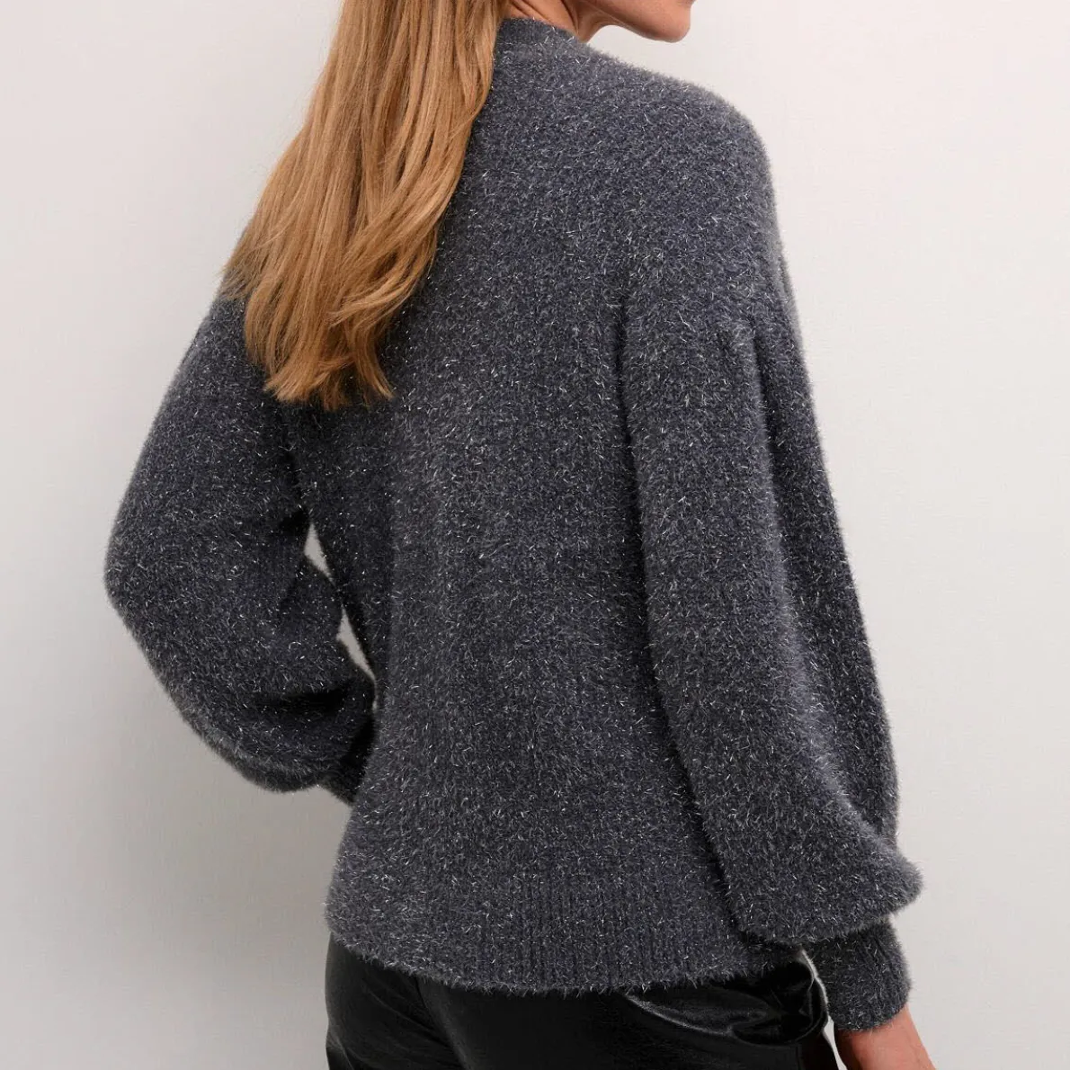 Das Material in Grau ist mit einem tollen Silberfaden gearbeitet, der den flauschigen Stoff ganz toll in Szene setzt. Dazu passen die Knöpfe in Silber Metall Optik super.