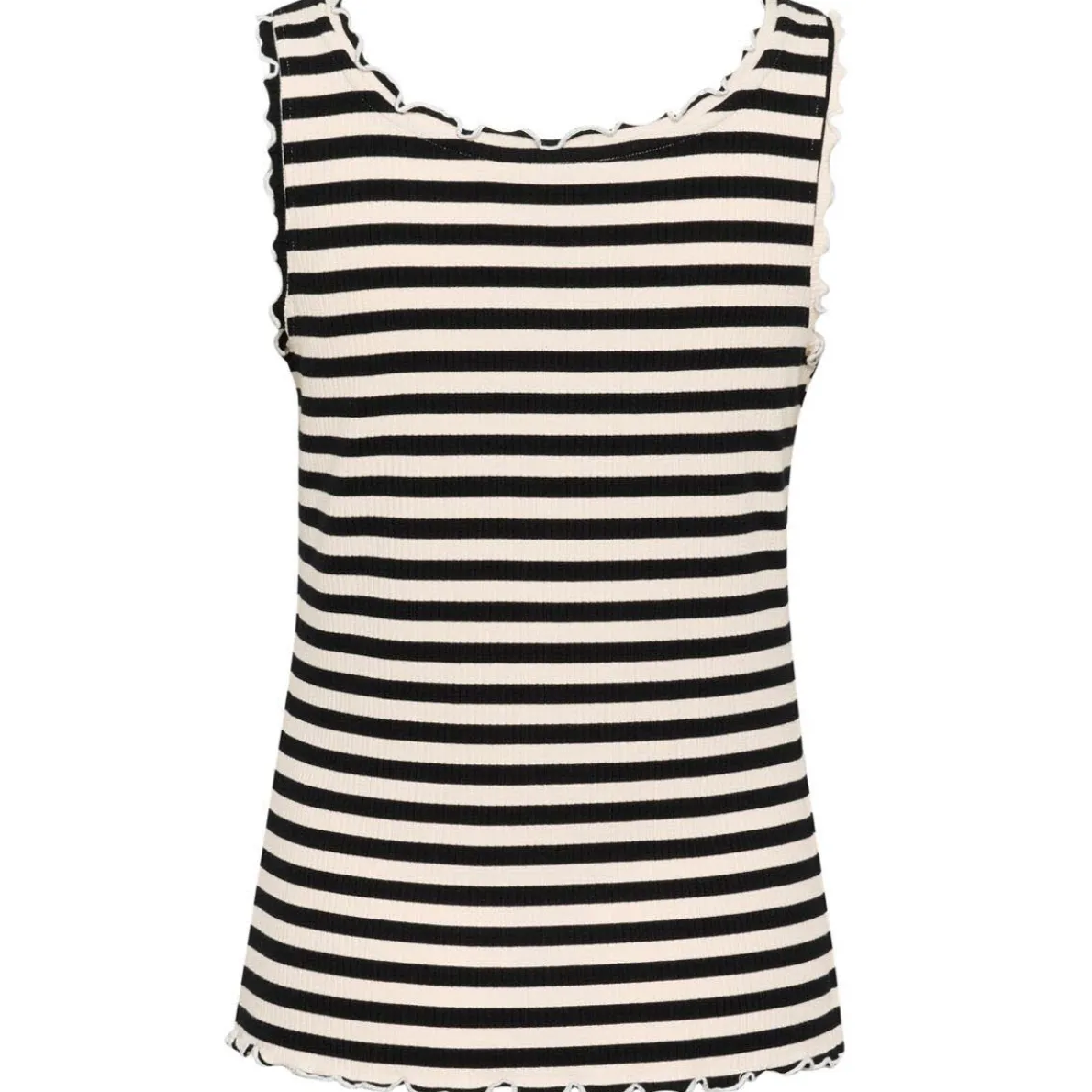 Das Mischgewebe in Schwarz ist mit einem Streifen Muster gearbeitet und trägt sich angenehm. Es hat einen normalen Schnitt, liegt dabei dennoch am Körper an. Hingucker ist dabei der Wellenartige Saum am Rundhalsausschnitt, den Trägern und am Bund. Du kannst es im Sommer toll einzeln tragen oder für den Übergang als Layering Piece zum Blazer oder deiner Strickjacke.
