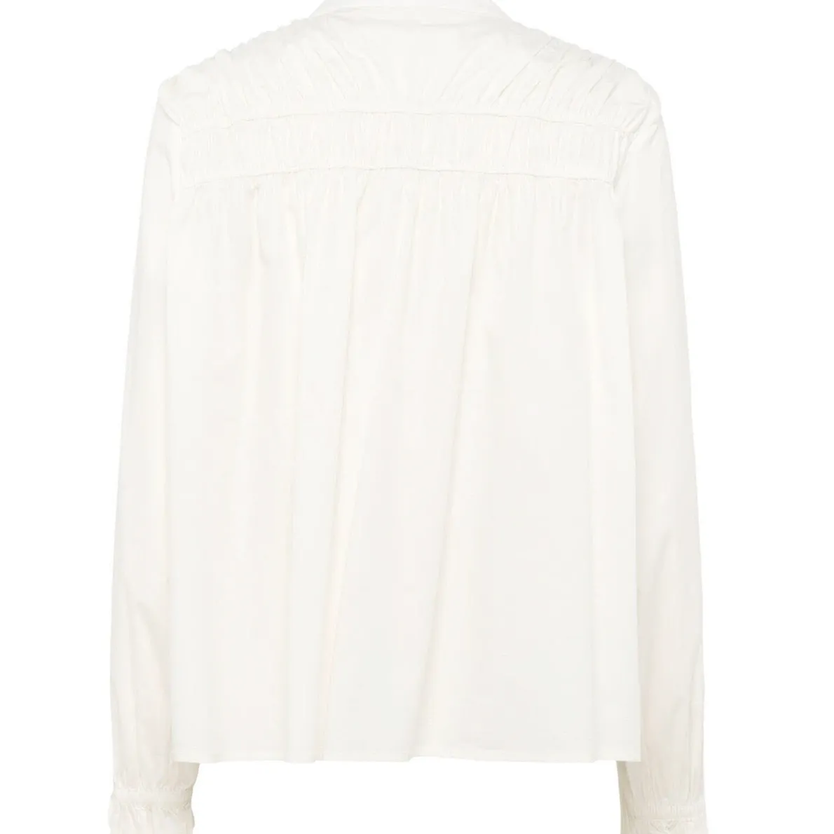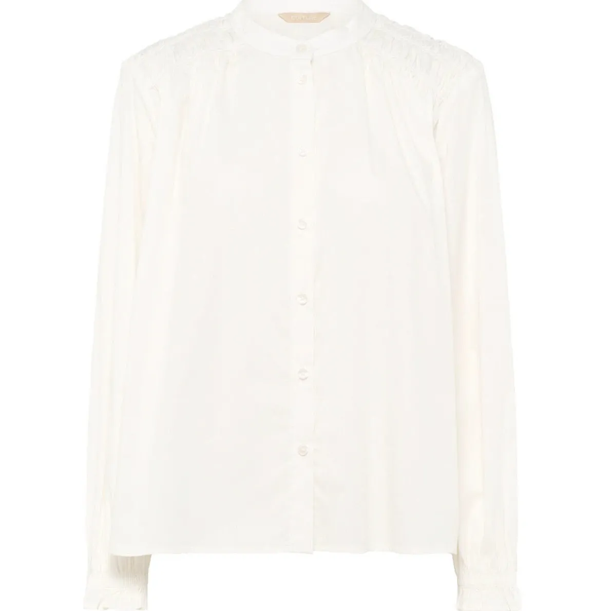 Sie wurde aus reiner Baumwolle in Creme Weiß gearbeitet und ist mit einer Knopfleiste und einem Rundkragen versehen. Die langen Ärmel sind mit einem Gummibund gearbeitet und dadurch leicht gerafft.