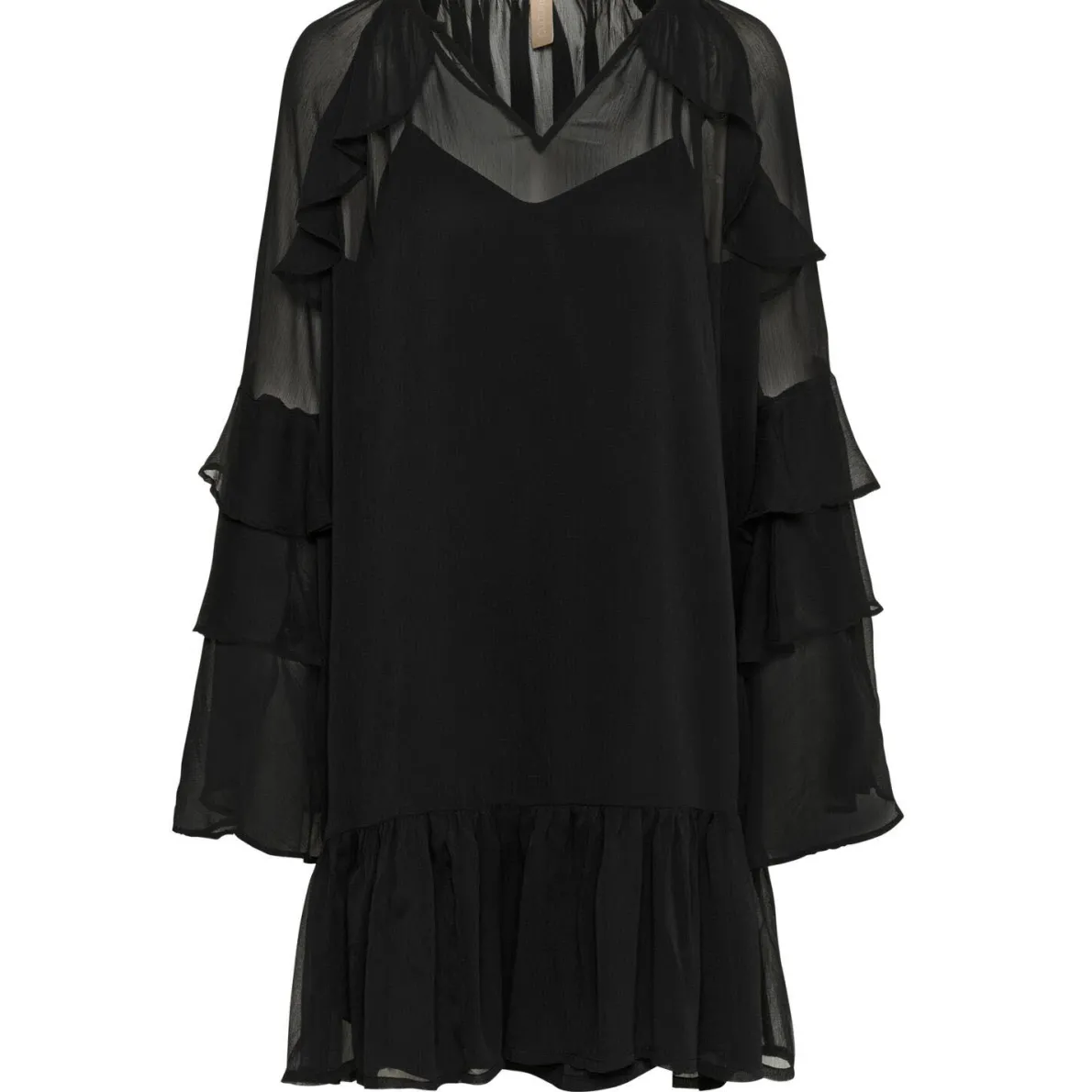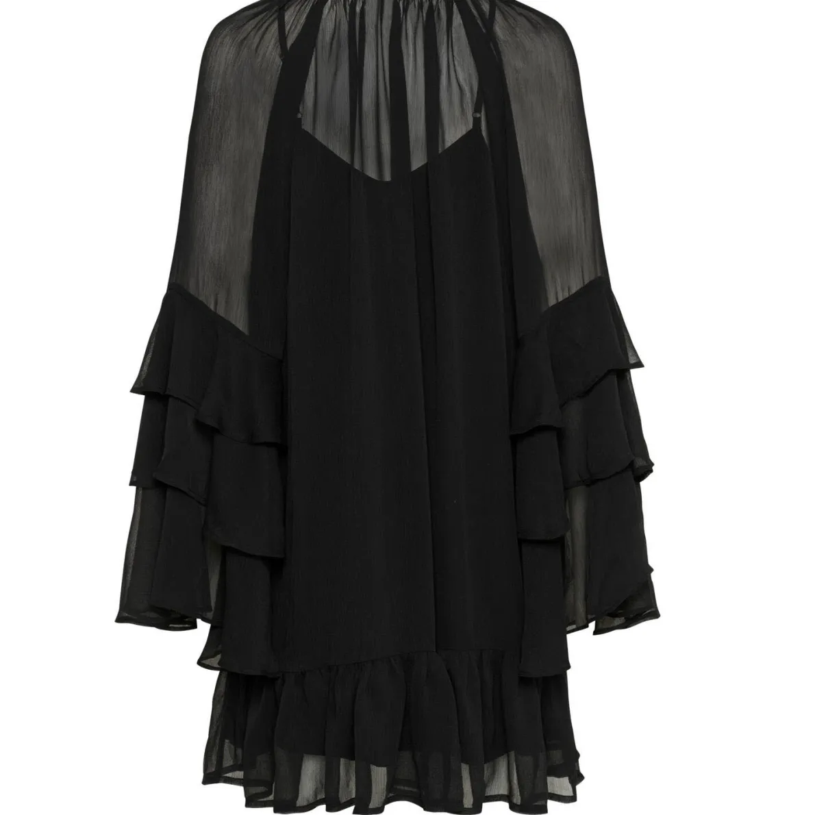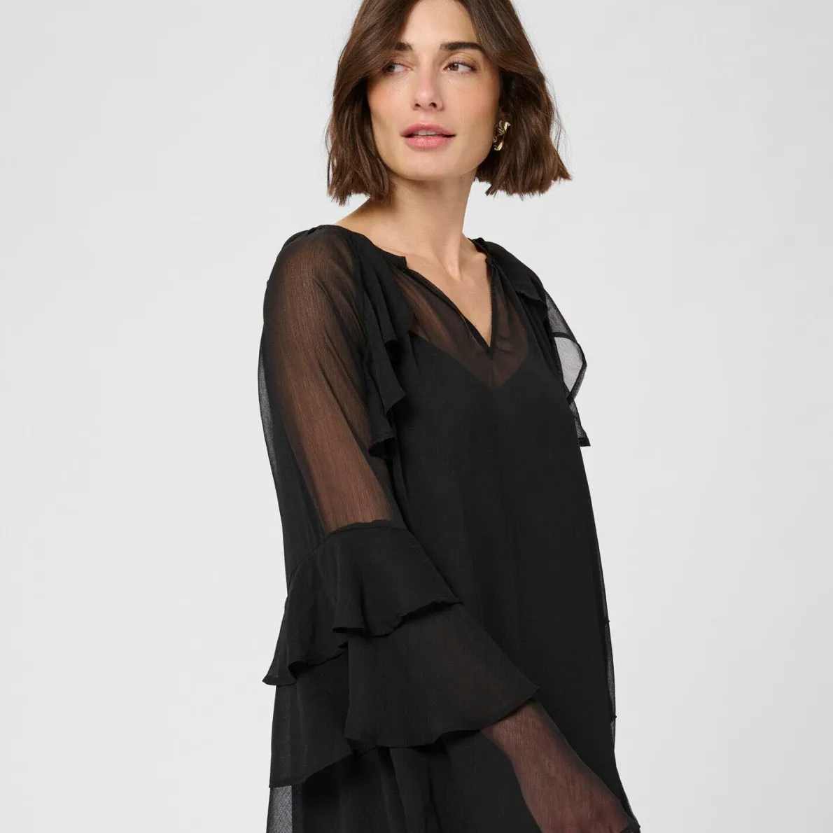 Der dünne, fließende Stoff in Schwarz ist im Bereich der Schulter leicht transparent gearbeitet. Das Kleid hat einen V-Ausschnitt und Volantärmel. Das Kleid endet kurz über dem Knie und ist dort verspielt in Falten gelegt. Es hat eine fließende Silhouette und ist perfekt für jeden Anlass.