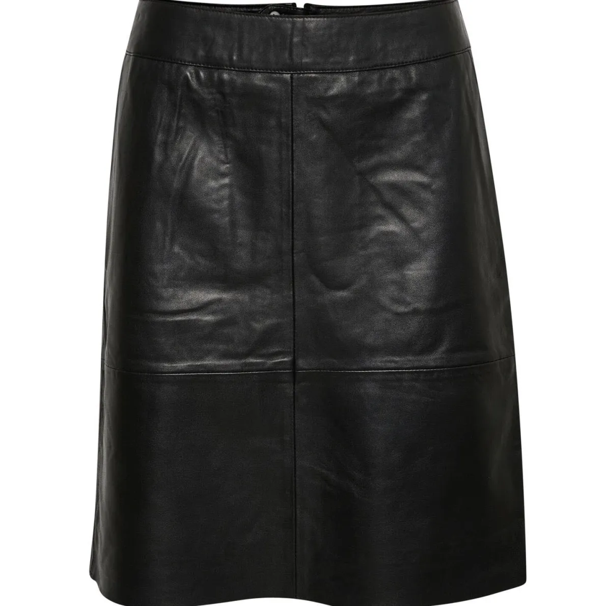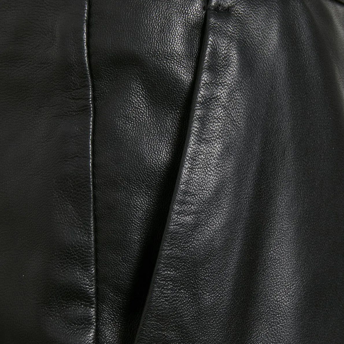 Er wurde aus Echtleder in Schwarz gefertigt und ist in der klassischen A-Linie geschnitten. Der Rock hat eine angenehme Länge bis zum Knie und wird an der Rückseite mit einem Reißverschluss geschlossen. Er hat dezente Nähte einen klassischen Bund und beliebte Seitentaschen.