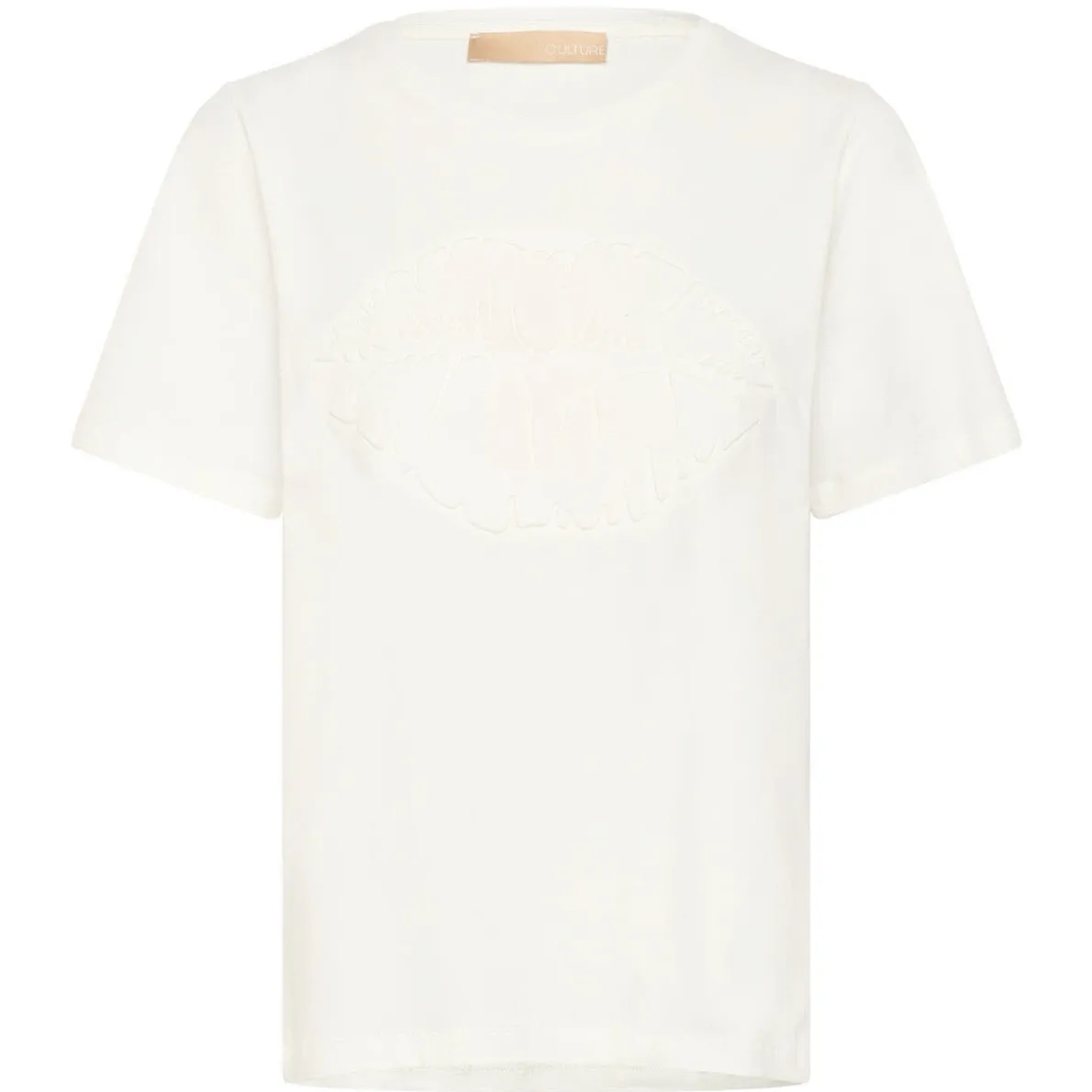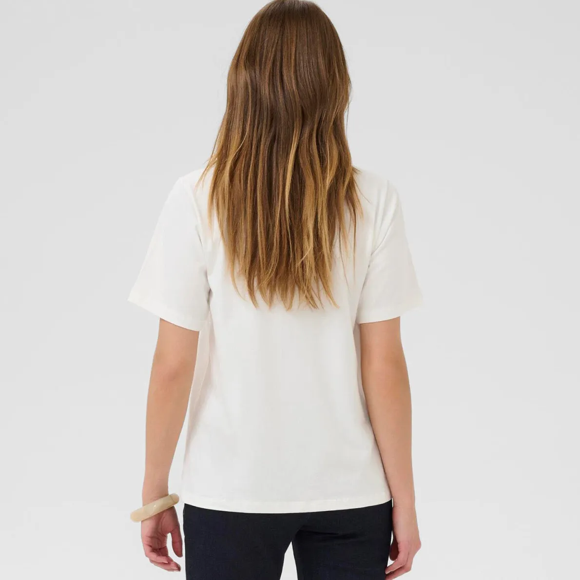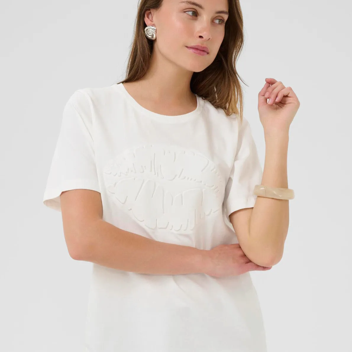 Das Mischgewebe aus Baumwolle in Weiß ist mit einem erhabenen Stick Detail im Lippendesign verziert. Es überzeugt durch seine lockere Passform, den Rundhalsausschnitt und die kurzen Ärmel.