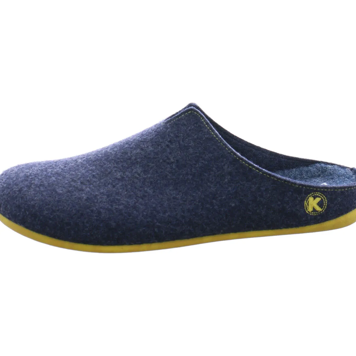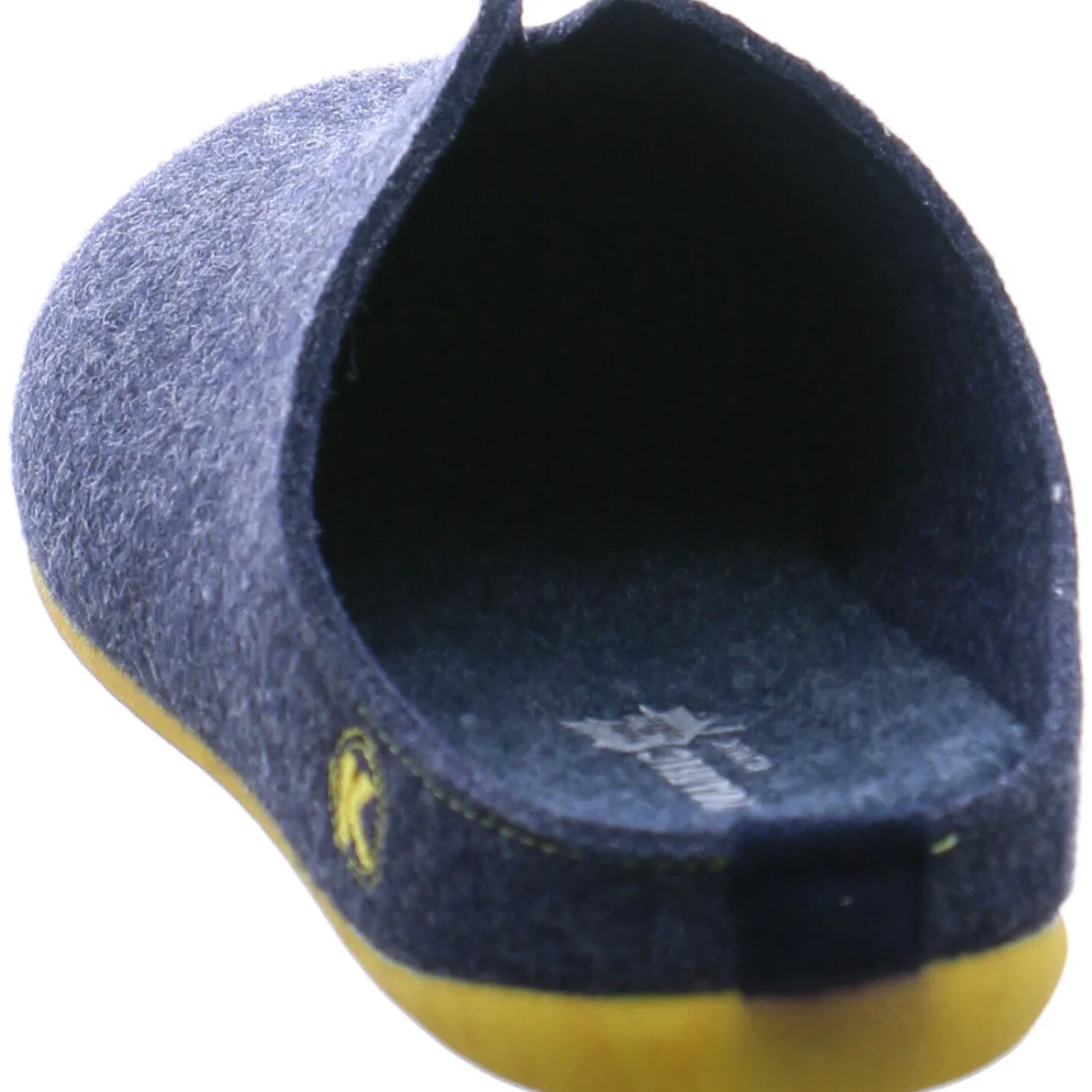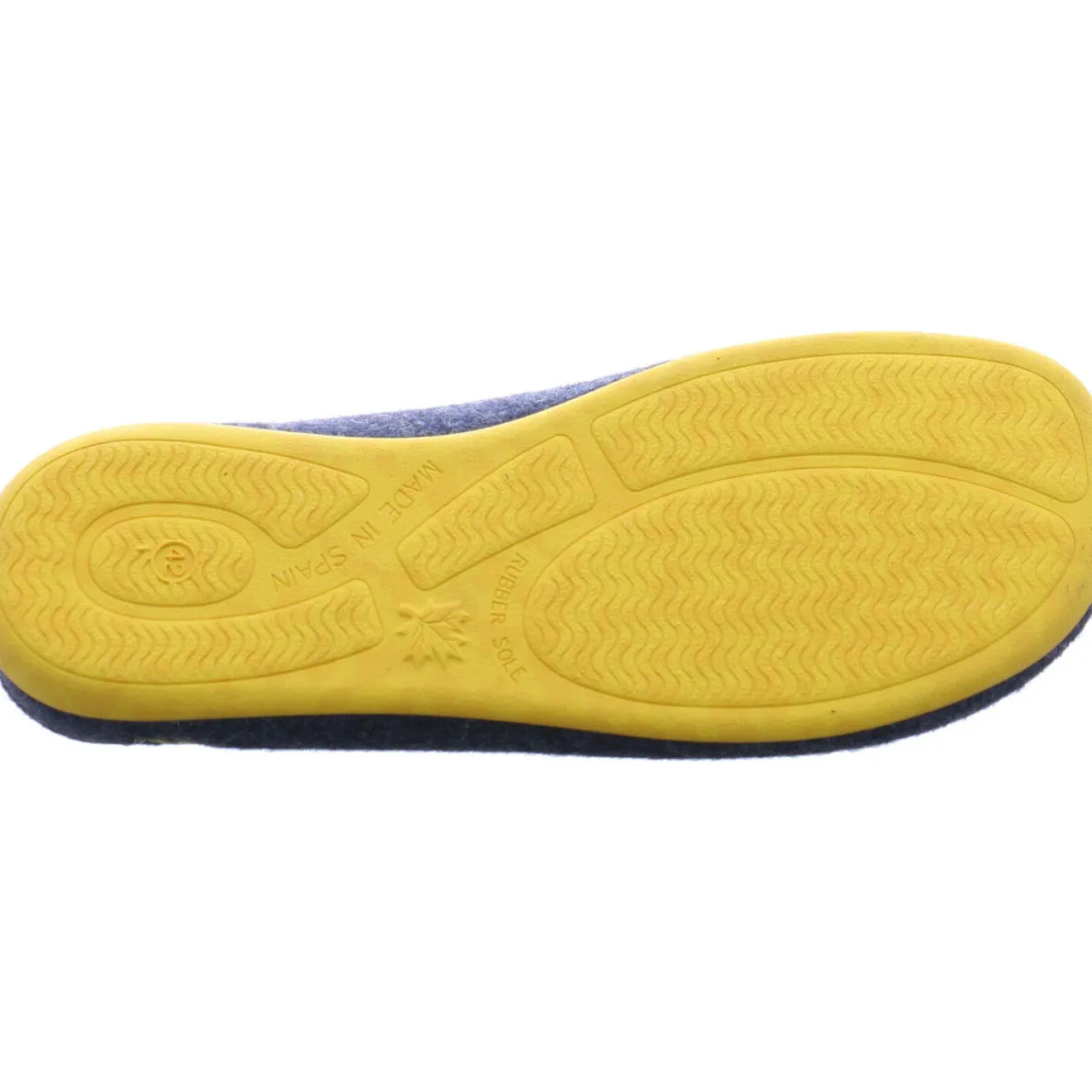 Der Schuh in Blau wurde aus Recyceltem Polyester aus PET Flaschen gefertigt und das Obermaterial hat die Haptik von Filz. Die Ziernaht um den Einstieg und die Laufsohle in Gelb runden das Design gekonnt ab. Die Gummisohle gibt perfekten Halt, so kommen Sie auch auf glatten Böden nicht ins Rutschen. Der Schuh ist wunderbar leicht und flexibel.