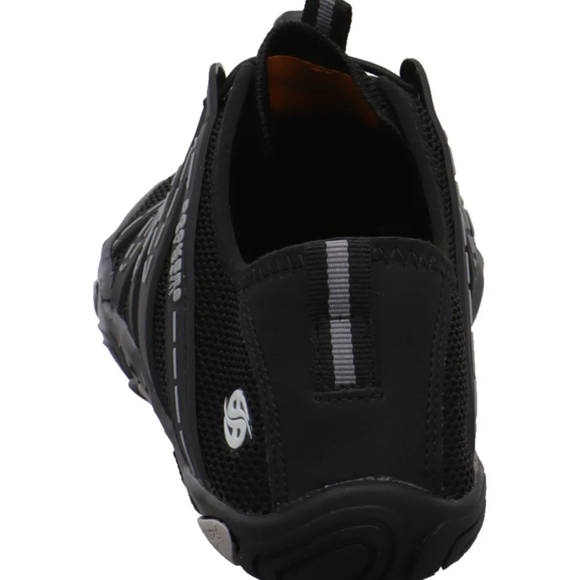 Das Textil Gewebe in Schwarz, ist ausgesprochen flexibel und wird durch die Synthetik Einsätze der Schnürung toll in Szene gesetzt. Durch die automatische Gummischnürung kannst du ihn genau an deinen Fuß anpassen und mit den Laschen am Schaft ist der Einstieg sehr leicht. Der Zehenbereich ist großzügig gearbeitet und bietet deinem Fuß viel Platz und Bewegungsfreiheit. Die Laufsohle ist besonders dünn und flexibel gearbeitet und die Innensohle lässt sich entnehmen. So hast du das optimale Barfuß Gefühl und unterstützt die natürliche Fuß Bewegung.