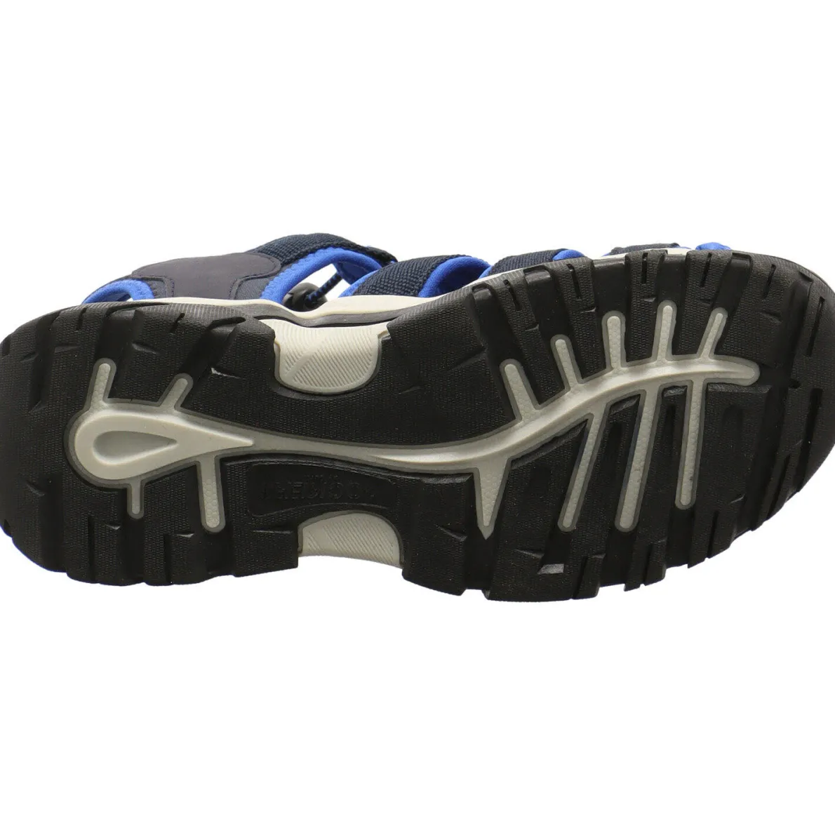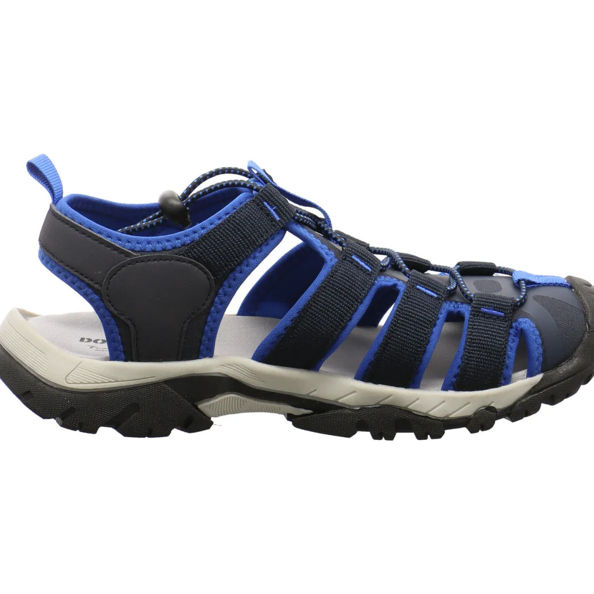 Das Obermaterial besteht aus einem Mix aus Kunstleder und Textil in verschiedenen Blau Tönen und ist damit besonders pflegeleicht und robust. Der sportliche Look wird durch die Akzente in hellem Grau perfekt abgerundet. Der Zehenbereich der Sandale ist durch die erhöhte Laufsohle optimal geschützt. Die Gummischnürung mit Kordelzug gewährleistet einen leichten Einstieg und gibt dennoch perfekten Halt.