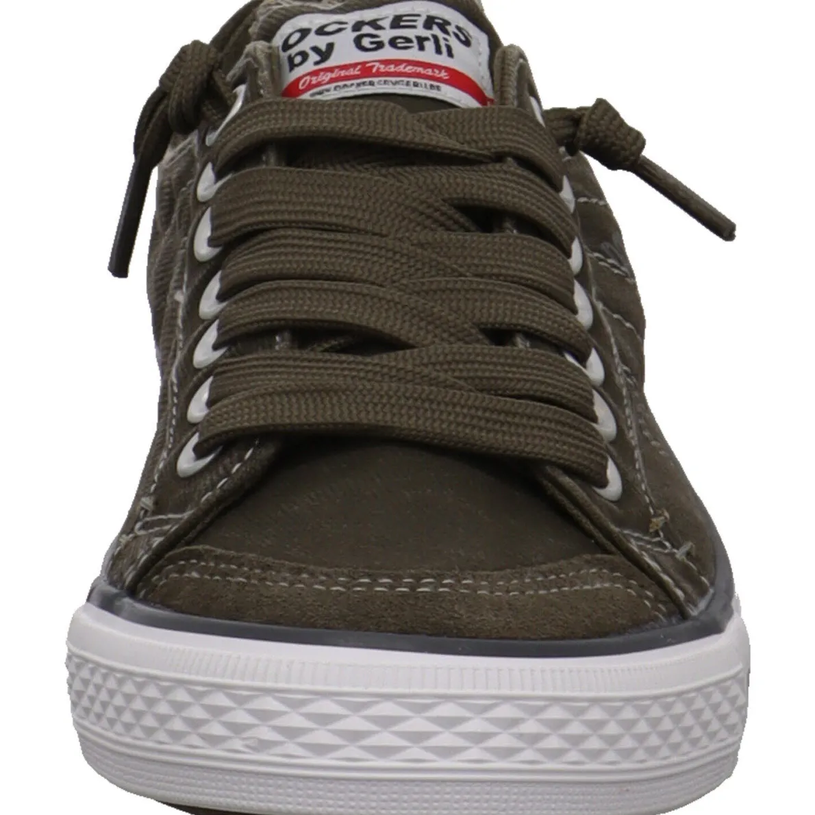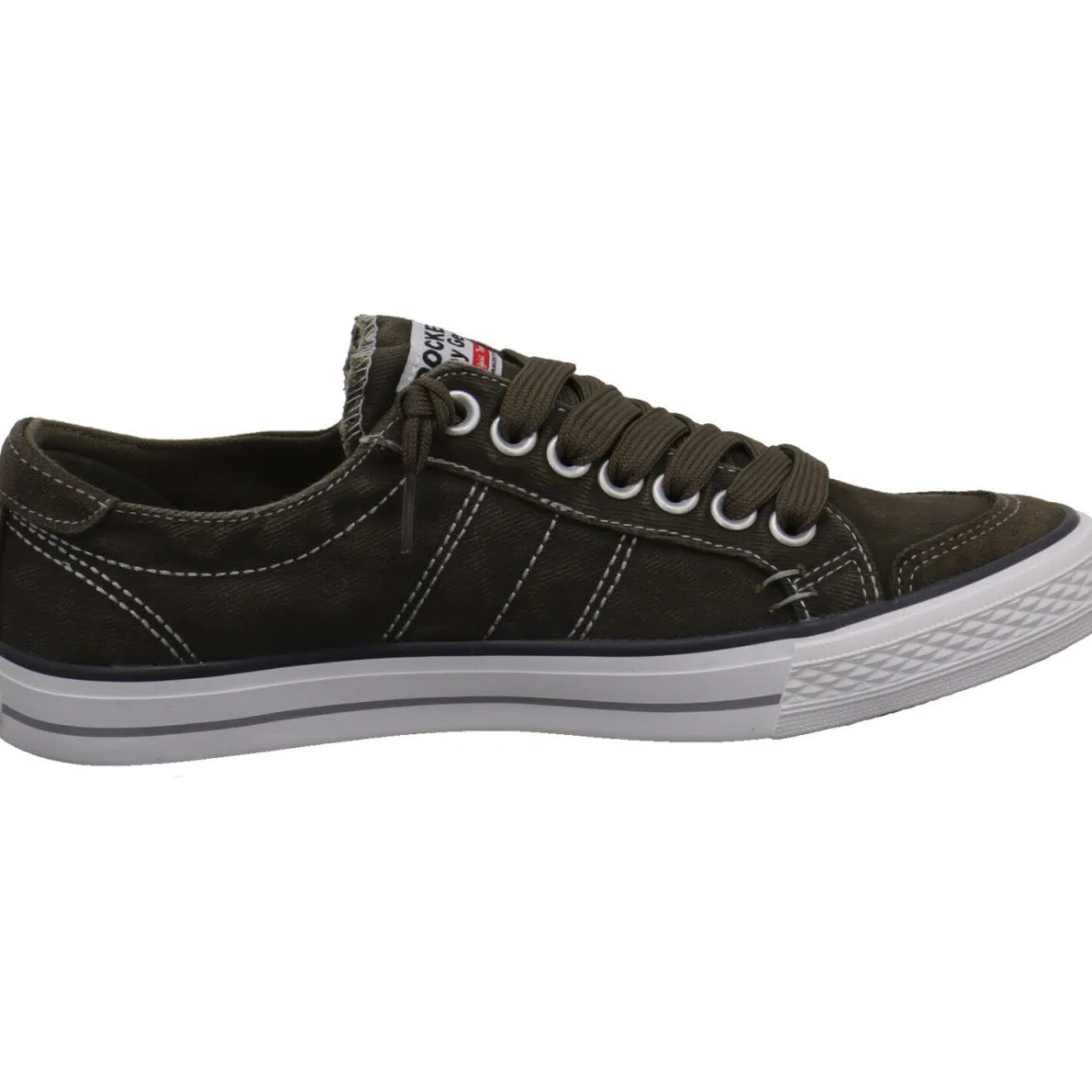 Das Obermaterial aus Textil Canvas in Khaki Grün ist mit Einsätzen in Leder versehen. Die breiten Schnürsenkel und das Gummiband unter der Zunge machen dein Einstieg sehr leicht und die Senkel müssen nicht geschnürt werden.