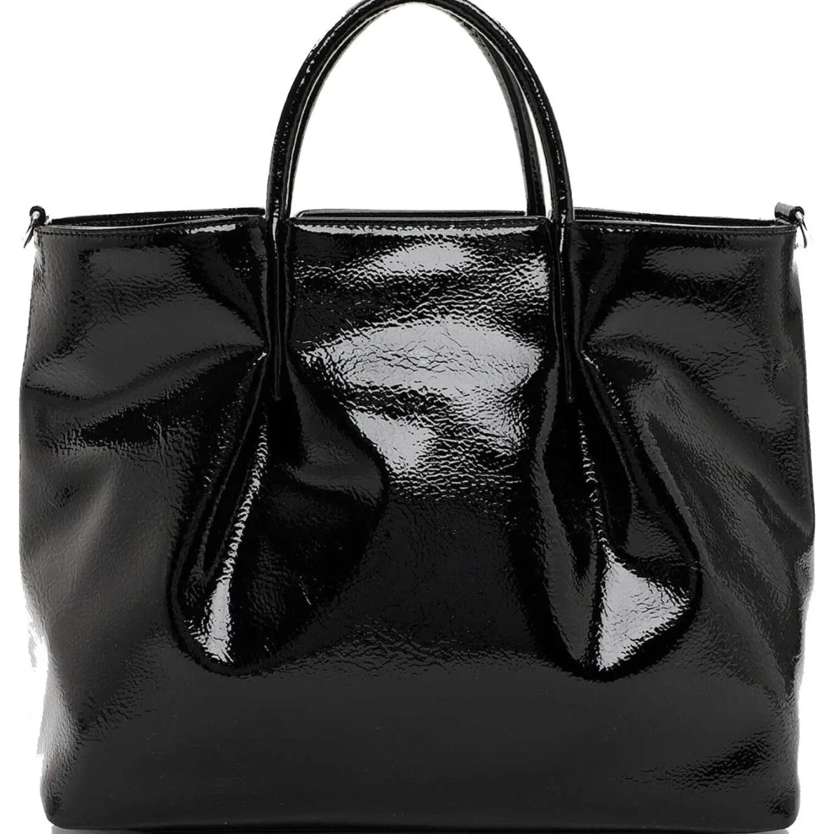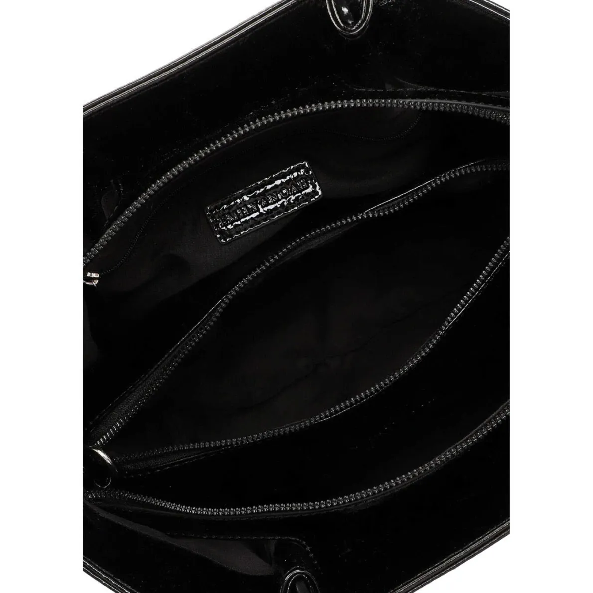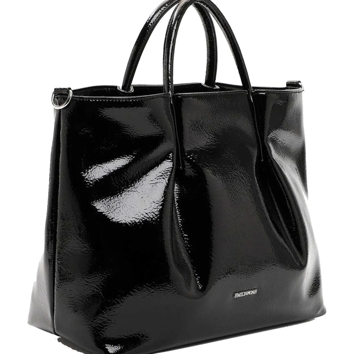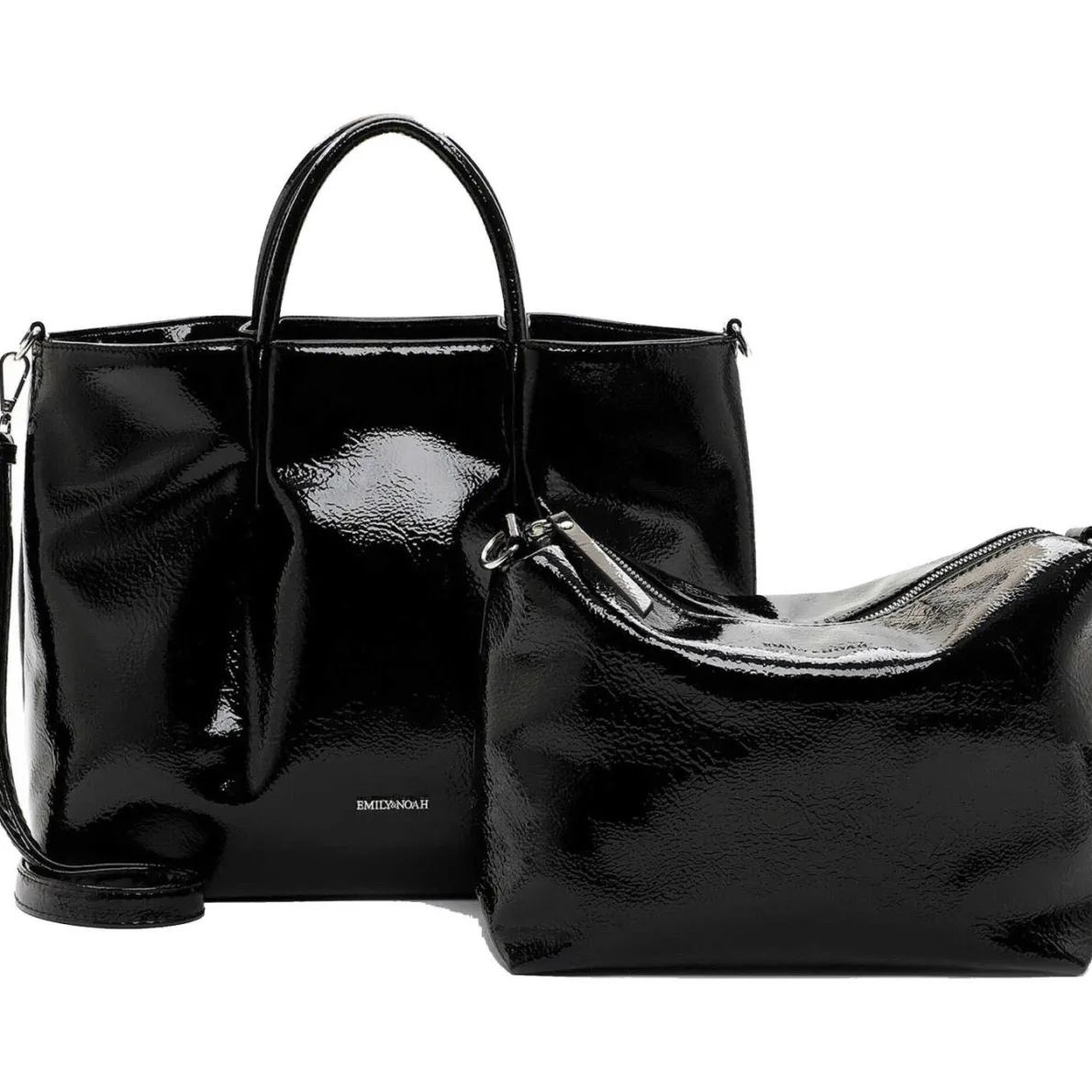 Die Handtasche wurde aus pflegeleichtem Kunstleder in Schwarz in Lack-Optik gefertigt welche garantiert alle Blicke auf sich zieht. Die Tasche ist als 3-in-1 “Bag-in-Bag” Tasche gearbeitet und beinhaltet eine weitere kleine Tasche, die als Umhängetasche oder Kosmetiktsche genutzt werden kann.