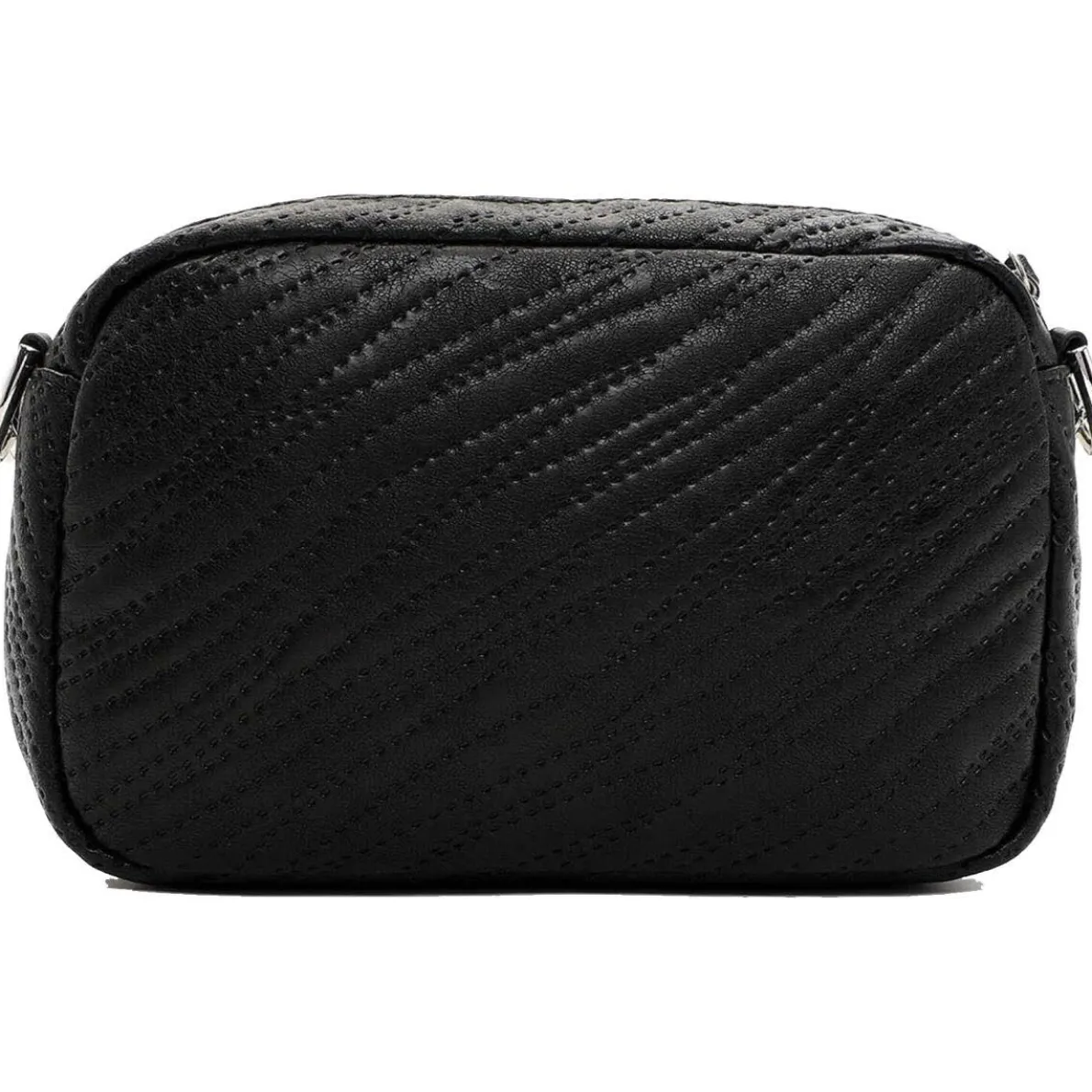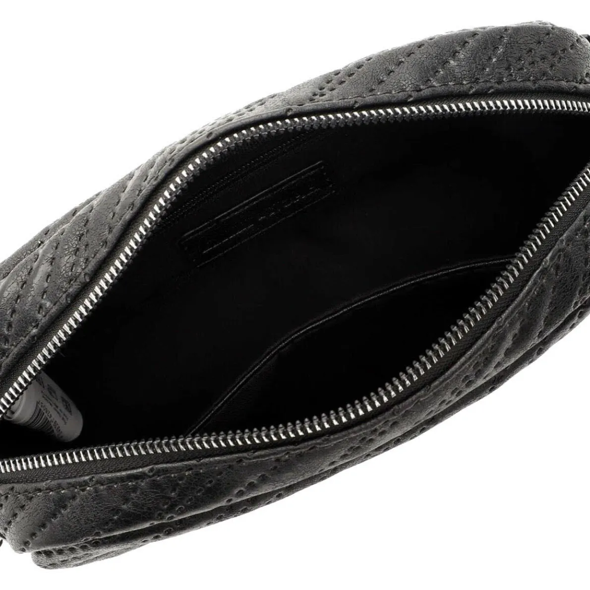Gefertigt aus Kunstleder in Schwarz, ist sie mit einer schönen Prägung versehen. Das kleine kompakte Format, bietet Platz für die wichtigsten Dinge. Der verstellbare Umhängegurt ist mit einer kleinen Metallgliederkette an die Tasche angebracht.