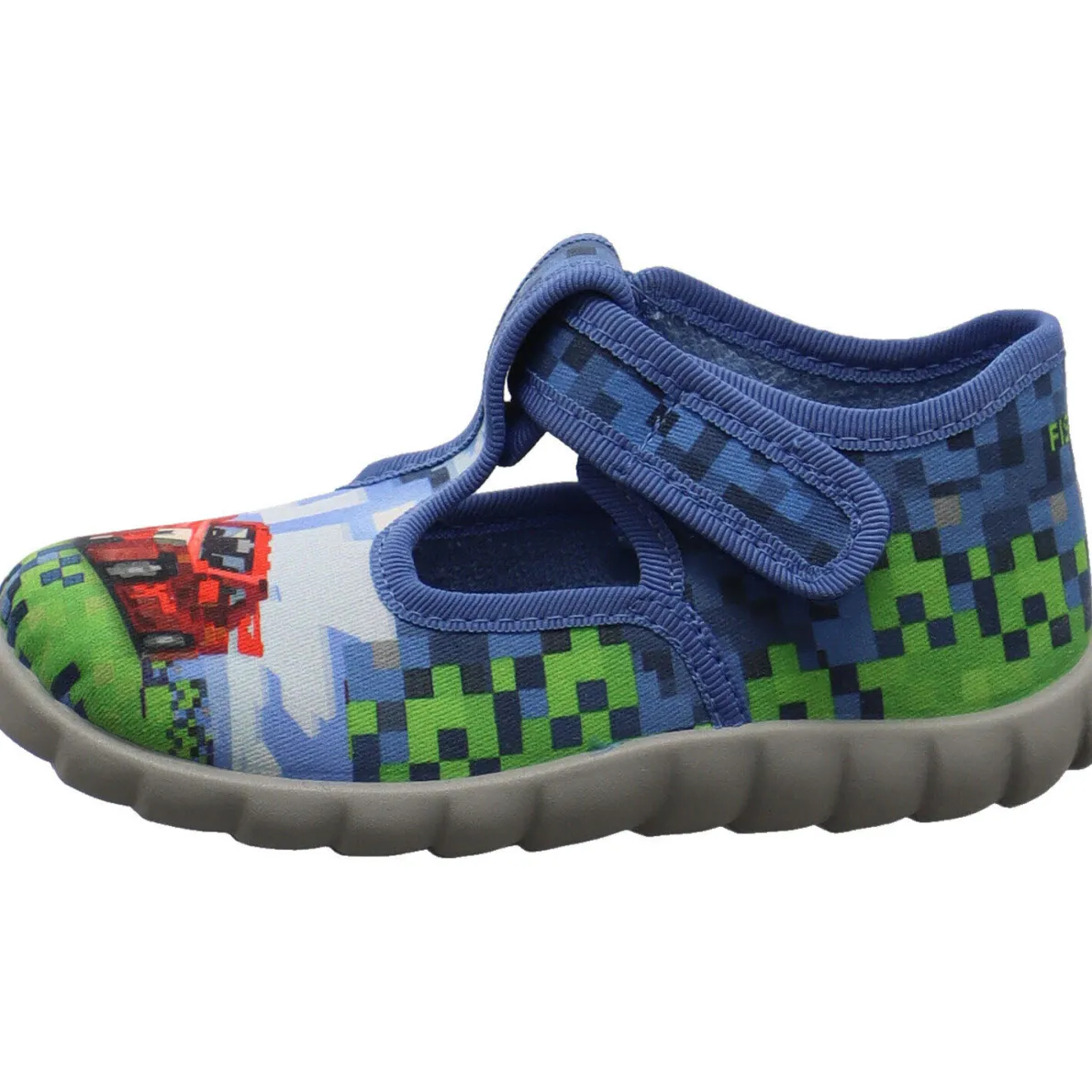 Es wurde aus strapazierfähiger Baumwolle in Blau gearbeitet. Auf dem Blatt ist ein Auto als Print in Rot und an den seiten sind kleine Pixel in Grün und Schwarz. Durch den seitlichen Klettverschluss ist das An- und Ausziehen ein Kinderspiel. Der leicht erhöhte Schaft gibt den notwendigen Halt. Das Innenfutter ist aus angenehm weichen Frottee Futter gearbeitet. Kleine Cutouts und die Perforierung der Laufsohle sorgen zusätzlich für eine optimale Belüftung. Die Flexi-B Gummilaufsohle ist rutschhemmend und dennoch super flexibel und leicht.