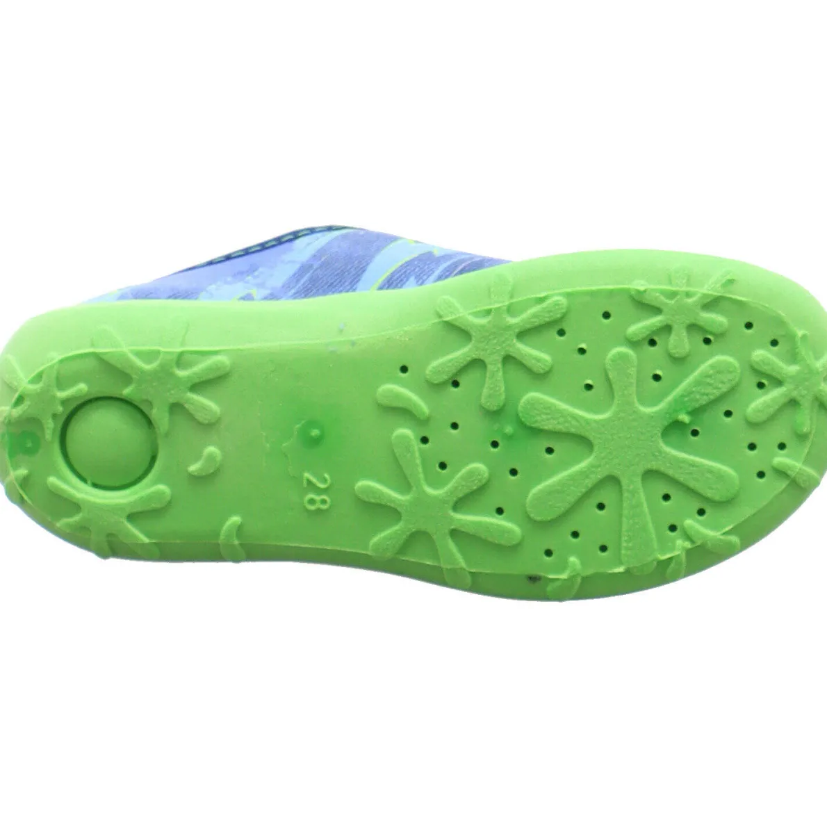 Der Schuh ist aus strapazierfähigem Textil in Blau und Grün gefertigt, innen leicht frottiert und sehr leicht. Zudem lässt er sich durch den seitlichen Klettverschluss leicht an- und ausziehen, was beim Spielen oft von Vorteil ist. Die Touch Me Decksohle ist extra gepolstert um ein angenehmes Tragen zu gewährleisten. Die stabile Sohle ist leicht profiliert, dennoch flexibel und zudem leicht perforiert, was eine optimale Luftzirkulation im Schuh ermöglicht.