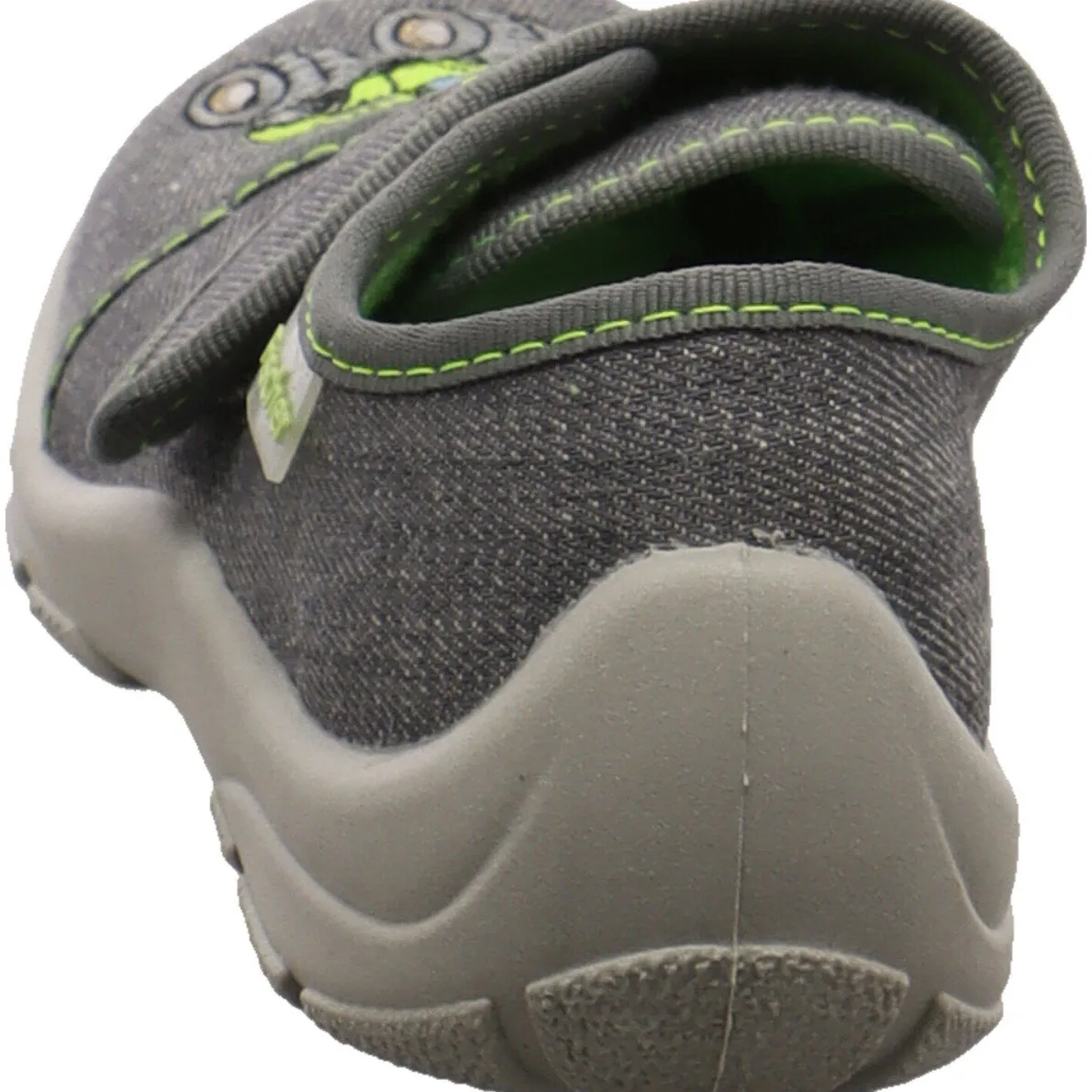 Der Schuh ist aus strapazierfähigem Textil in Grau mit Details in Grün gefertigt, innen leicht frottiert und sehr leicht. Zudem lässt er sich durch den seitlichen Klettverschluss leicht an- und ausziehen, was beim Spielen oft von Vorteil ist.