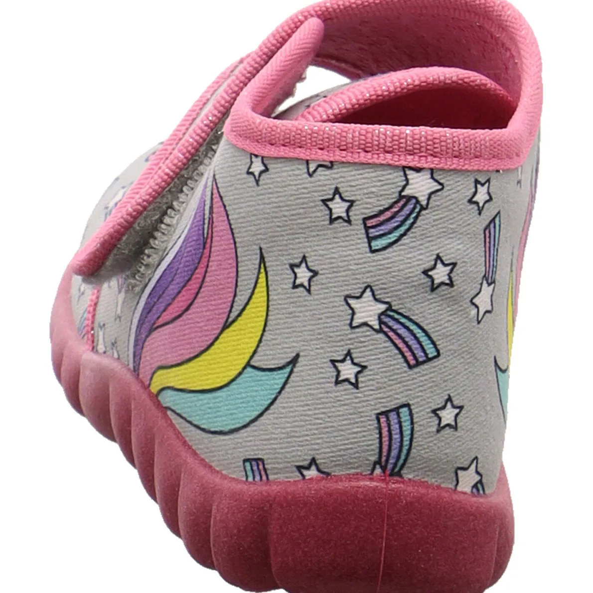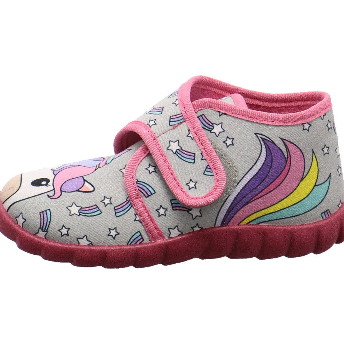 Der Schuh ist aus strapazierfähigem Textil in Grau gefertigt. Absoluter Hingucker ist dabei das Einhorn auf dem Blatt und der Schweif an der Seite in Bunt. Kleine Sternschnuppen und die Textil Kanten in Rosa mit Glitzer Effekt runden das verspielte Design perfekt ab. Er ist mit einem Frottee Innenfutter versehen und sehr leicht. Zudem lässt er sich durch den seitlichen Klettverschluss leicht an- und ausziehen, was beim Spielen oft von Vorteil ist.