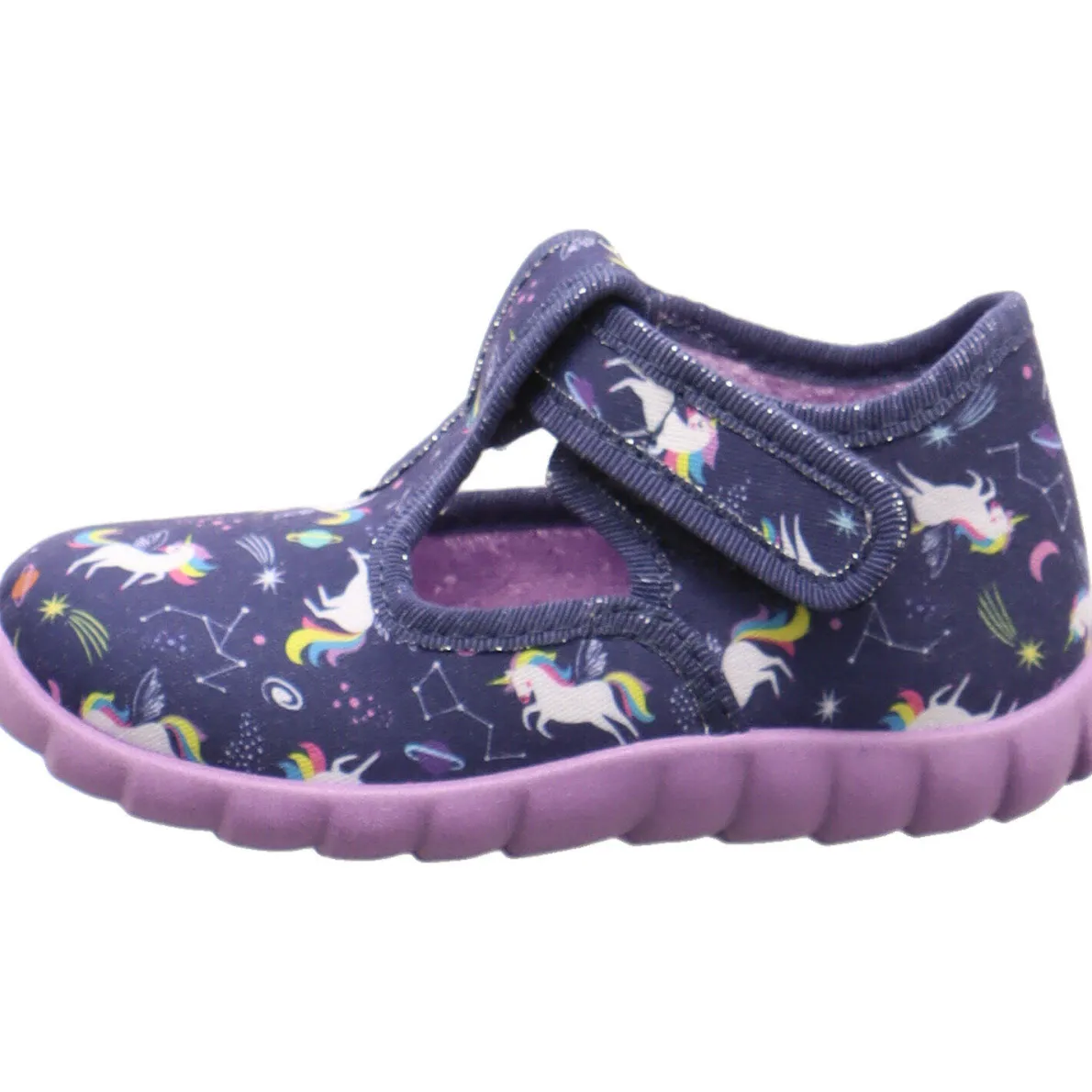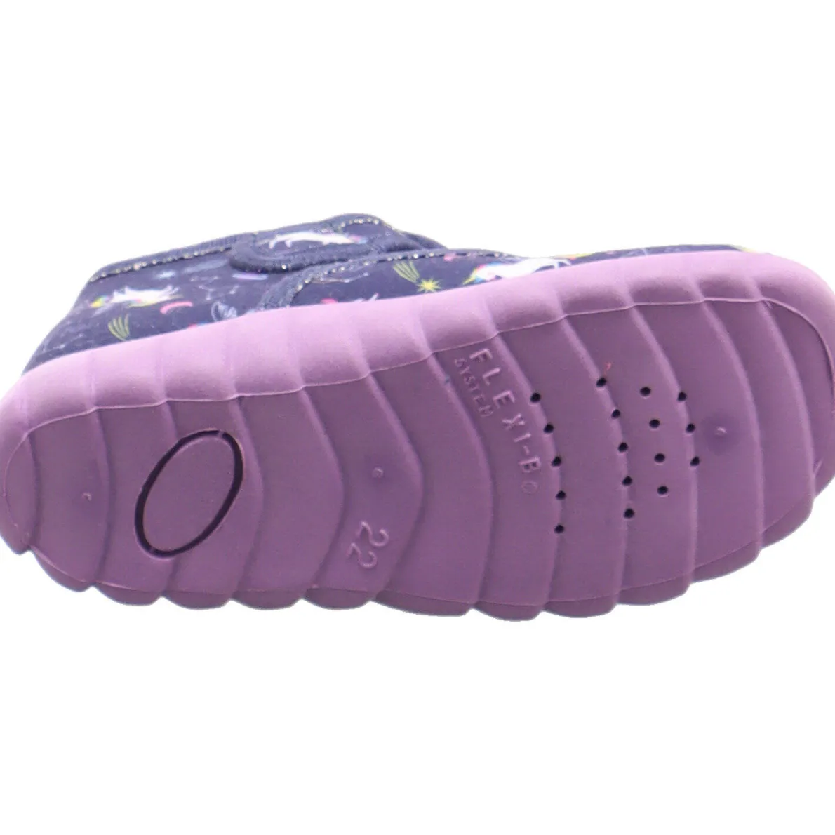 Dieser Kinder Klett Hausschuh Flexi von Fischer Markenschuh mit dem süßen Einhorn und Sternzeichen Allover Print, ist perfekt für kleine Mädchen, die zu Hause oder im Kindergarten toben und herum tollen wollen.