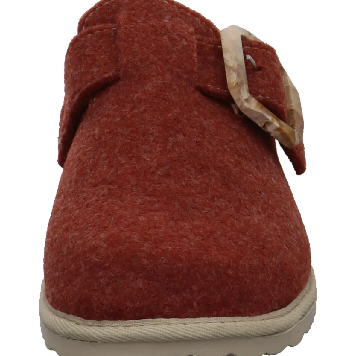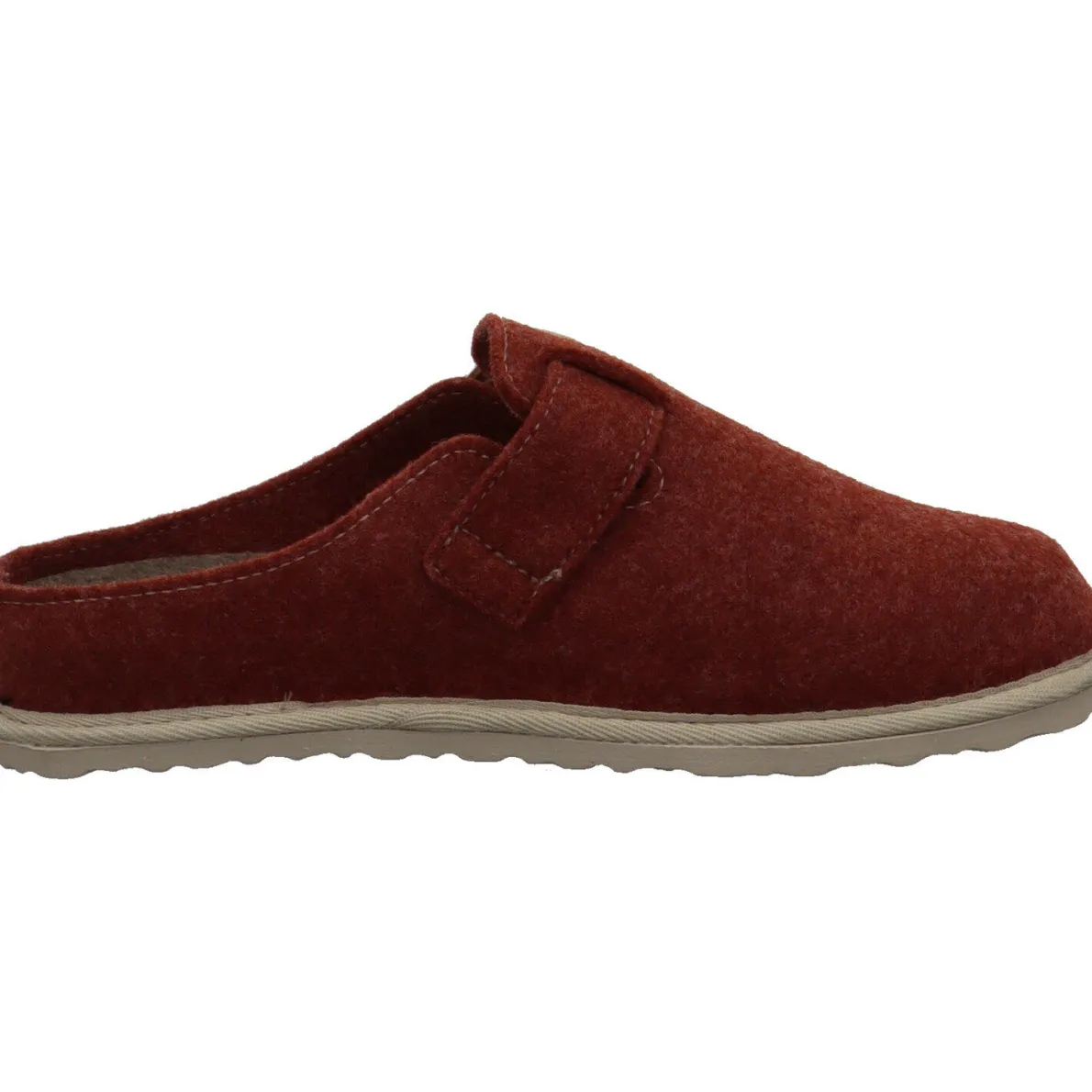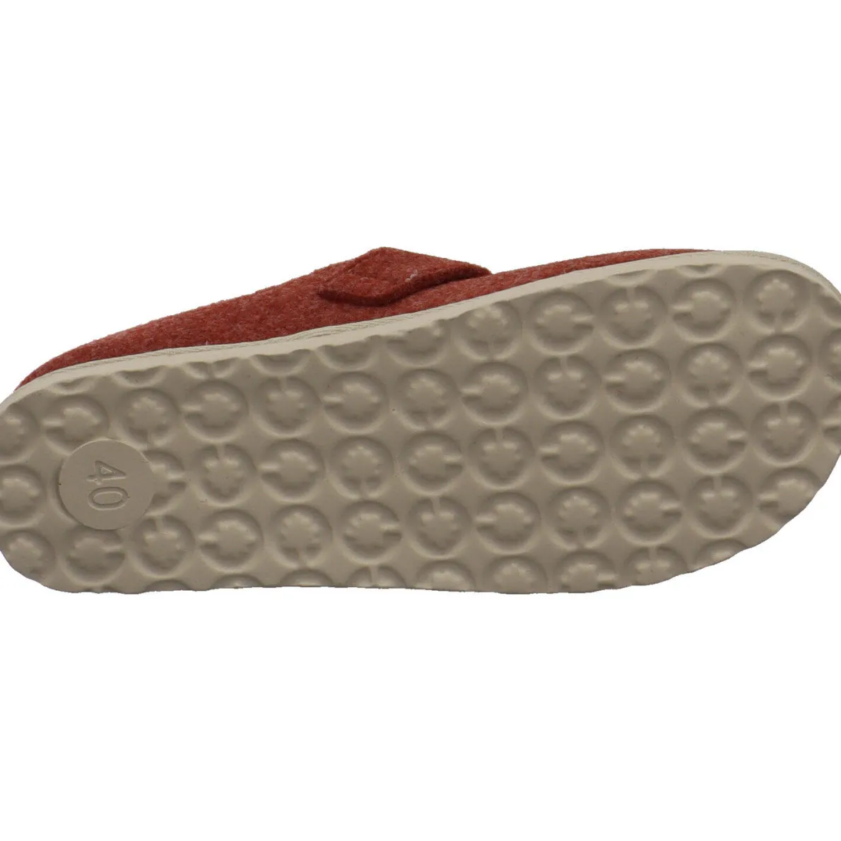 Der wurde aus recyceltem Textil Filz in Rost Rot gefertigt und ist mit einem Riemen mit einer schönen Dornschnalle versehen. Diesen Riemen kannst du individuell einstellen. Die Filz Innensohle als Wechselfußbett gearbeitet, so können auch eigene Einlagen verwendet werden.