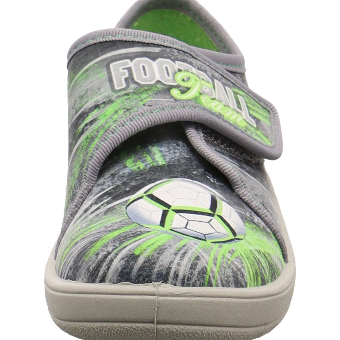 Der Schuh ist aus strapazierfähigem Textil in Grau gefertigt, innen leicht frottiert und sehr leicht. Zudemlässt er sich durch den seitlichen Klettverschluss leicht an- und ausziehen, was beim Spielen oft von Vorteil ist.