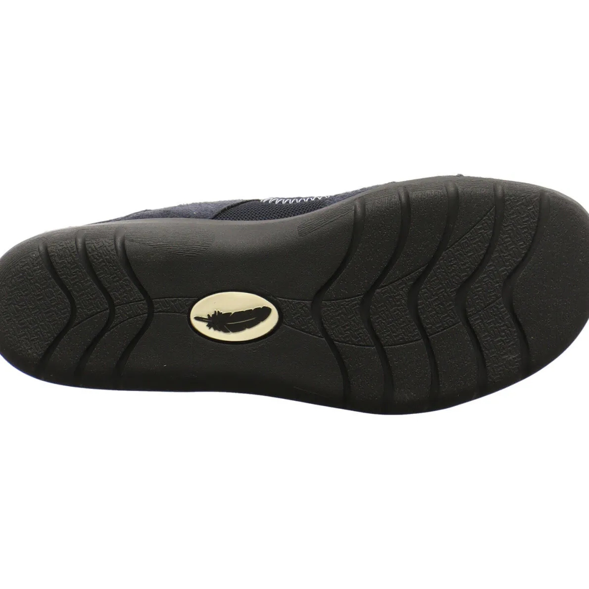 Das Obermaterial wurde aus Veloursleder in Blau gefertigt. Die Cutouts in Verbindung mit den Textil Mesh Einsätzen bieten eine optimale Belüftung der Füße auch an warmen Tagen.