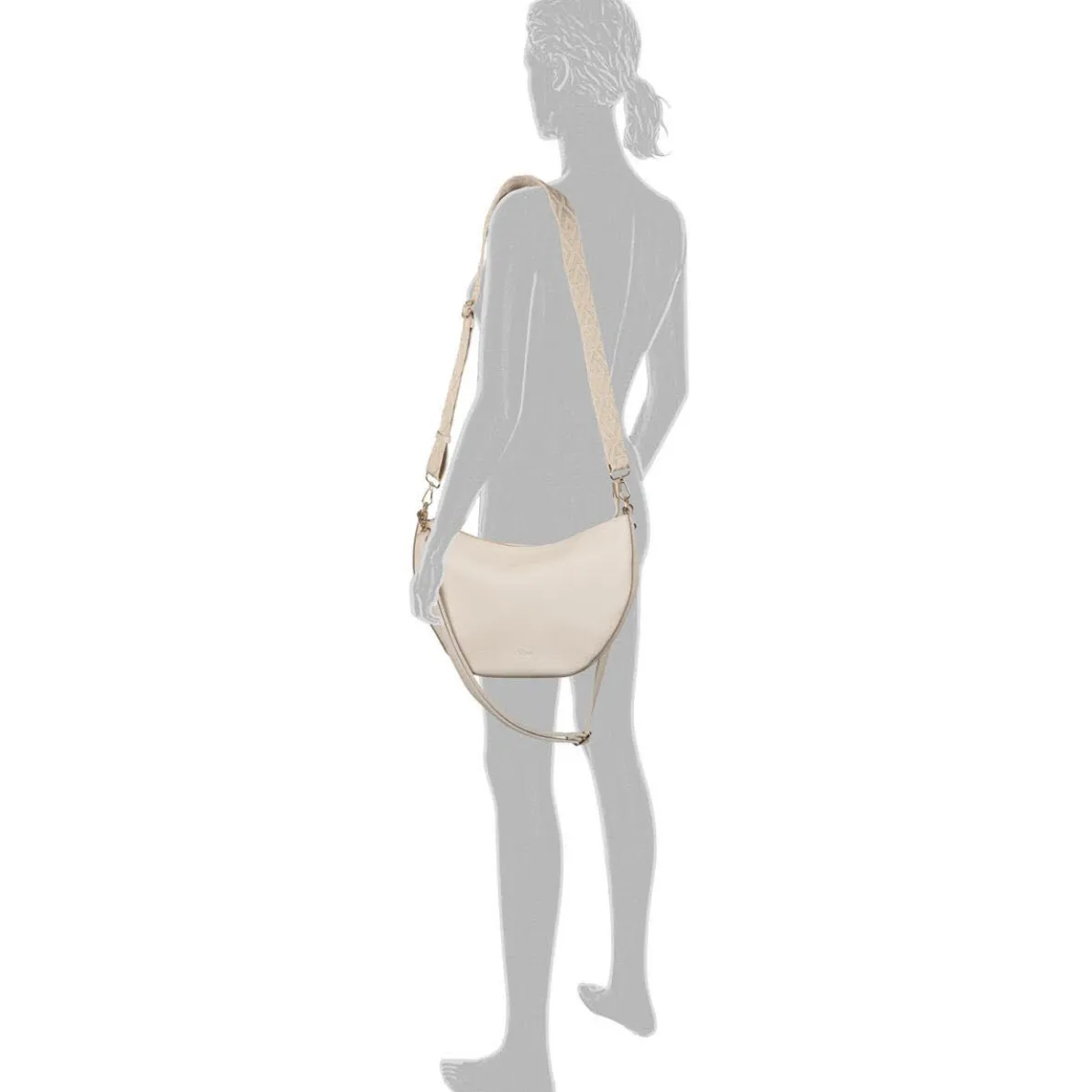 Der Schultergurt ist mit einem grafischen Muster versehen und abnehmbar und der mitgelieferte Umhängegurt in Weiß ermöglicht auch ein Crossover Tragen der Handtasche.