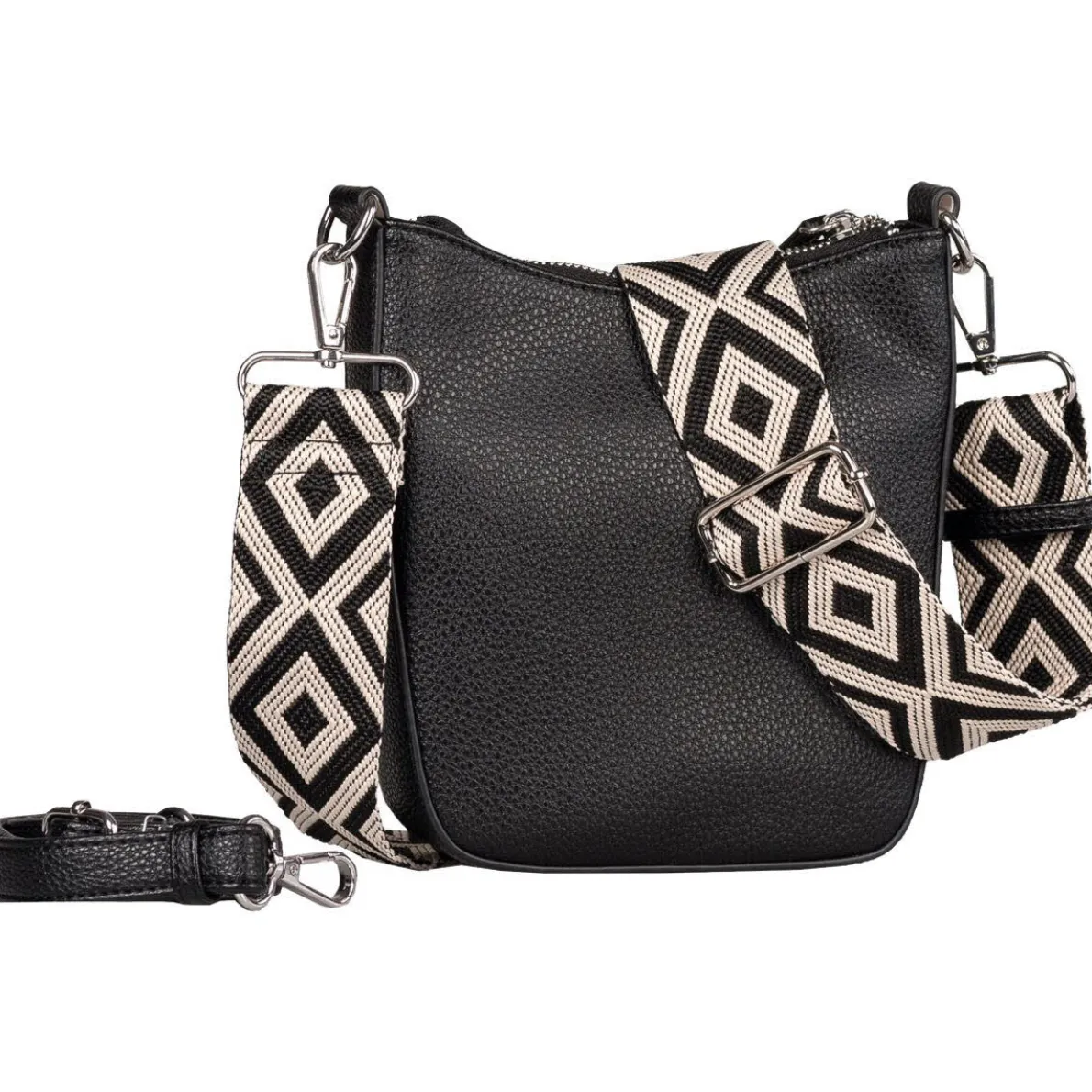 Der Umhängegurt ist mit einem grafischen Muster versehen und der mitgelieferte Tragehenkel in Taschenfarbe ermöglicht auch ein Crossover Tragen der Handtasche.