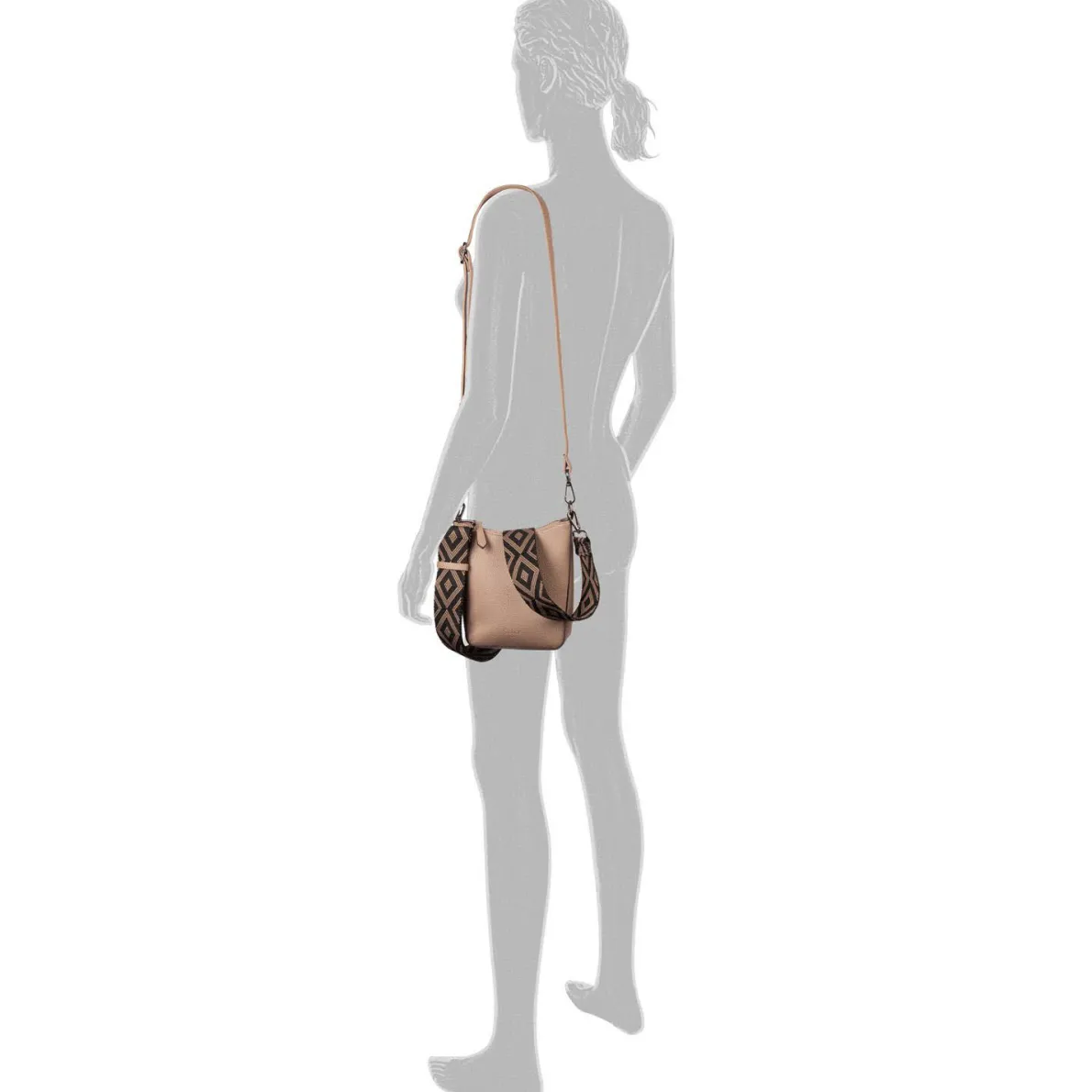 Der Umhängegurt ist mit einem grafischen Muster versehen und der zusätzliche Umhängegurt in Taschenfarbe ermöglicht einen individuellen Look.