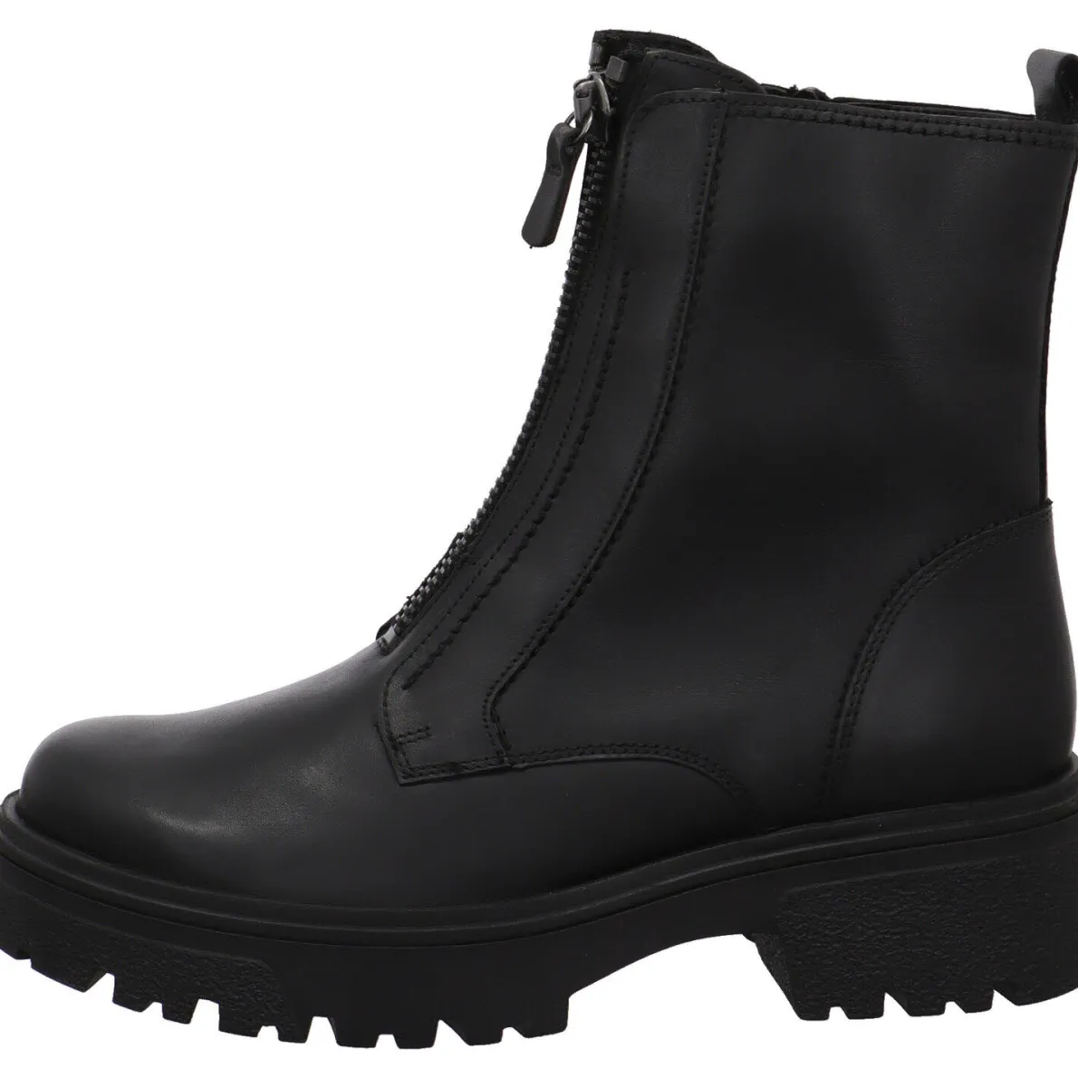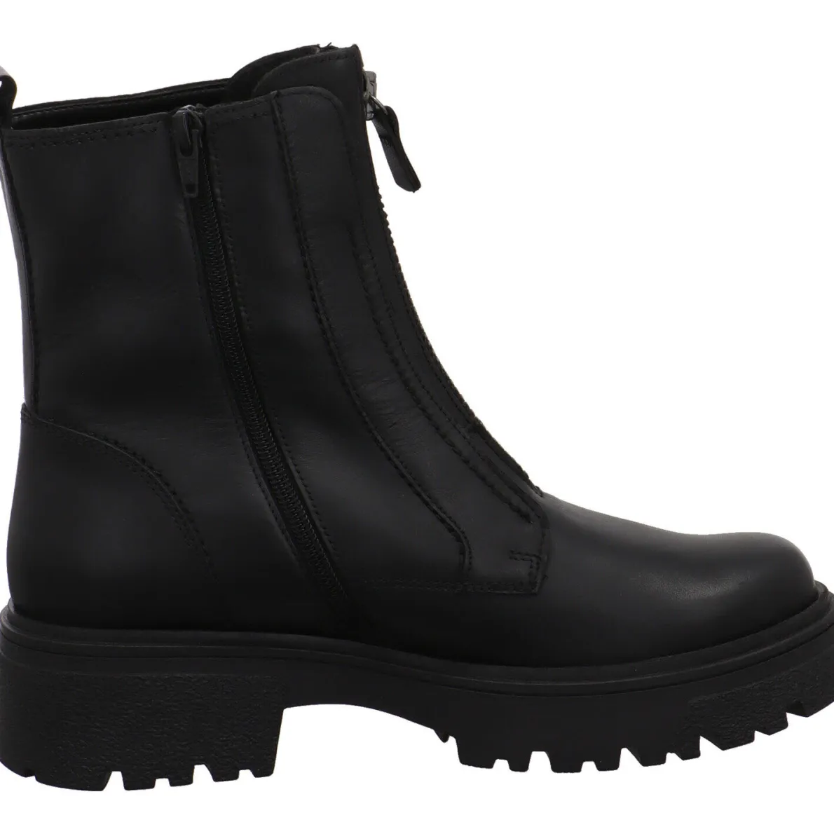 Er wurde aus Echtleder in Schwarz gefertigt. Auf dem Rist und an der Seite befindet sich je ein Reißverschluss. Dank diesen und der Lasche am Schaft ist das An- und Ausziehen gant einfach.