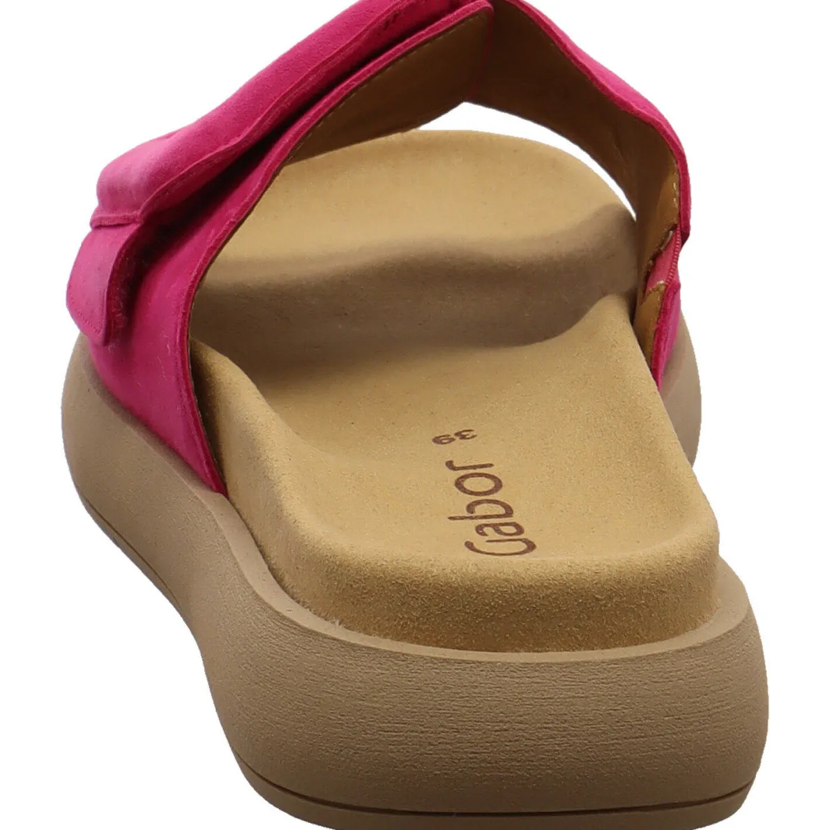 Genau das Richtige für den Sommer ist diese modische Damen Pantolette von Gabor. Sofort ins Auge fällt der breite Riemen aus echtem Veloursleder in trendigem Pink. Dieser ist mit einer Schnalle verziert. Zusätzlich kann er mit einem Klettverschluss ganz individuell auf deinen Fuß angepasst werden. Ein seitlicher Dehngummi sorgt für zusätzlichen Komfort. Die Best Fitting Innensohle ist angenehm weich und bequem.
