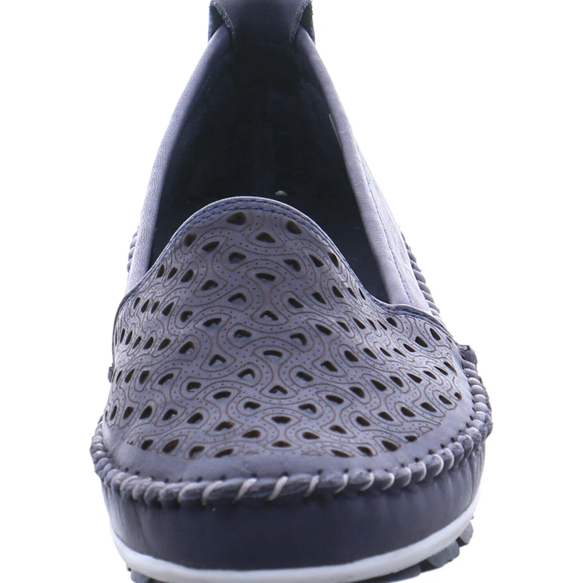 Das Obermaterial aus hochwertigem weichem Echtleder in Navy Blau ist mit einer Ziernaht umrandet und mit Cutouts, sowie einem Muster versehen.