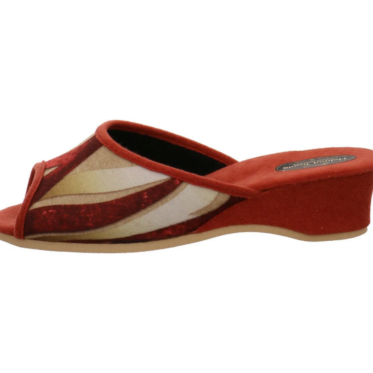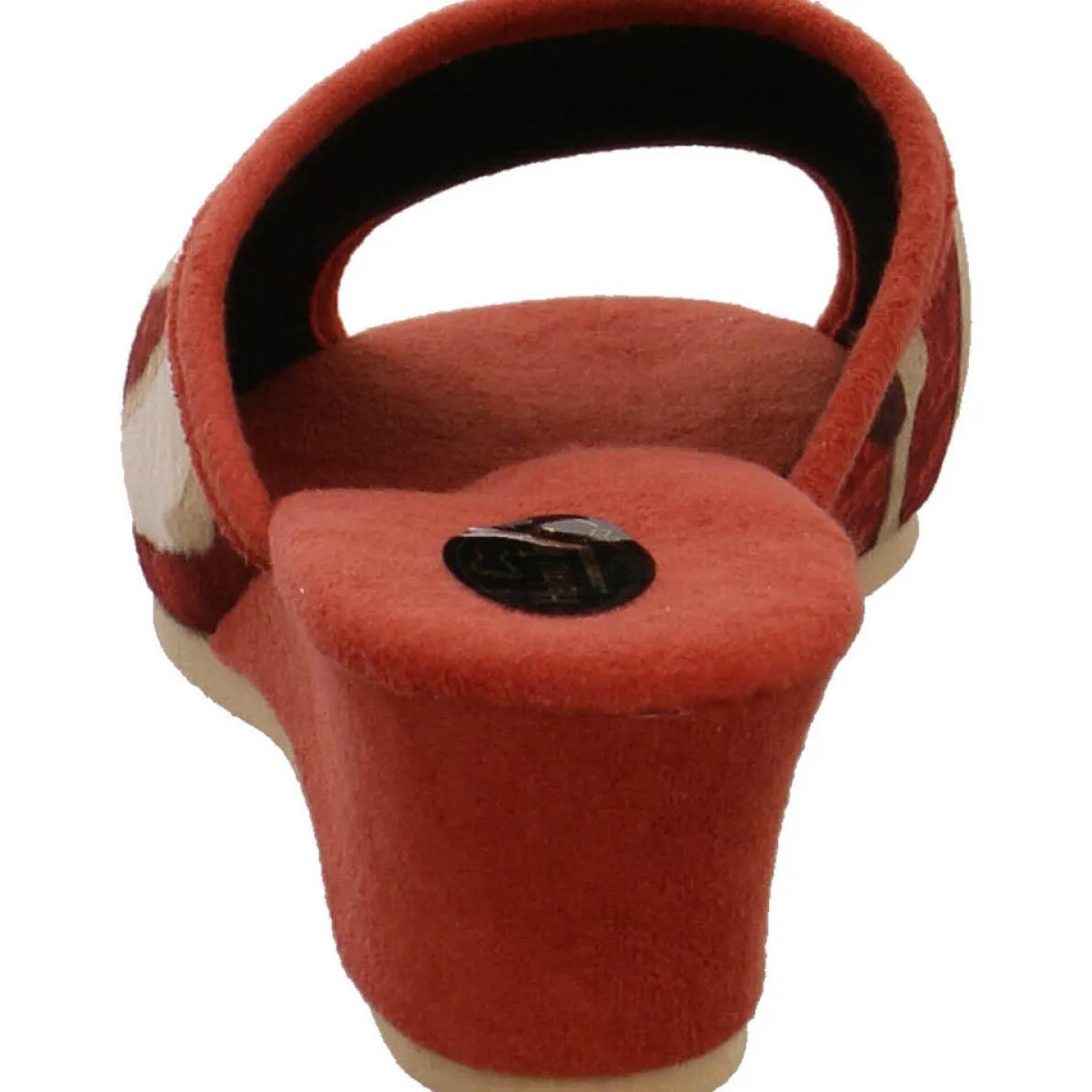 Das weiche Obermaterial aus Textil in Rost Rot ist mit einem graphischen Muster versehen. Der Schuh lässt sich durch das gepolsterte, anatomische Fußbett besonders angenehm tragen. Das Futter der Pantolette ist langlebig und feuchtigkeitsabweisend.